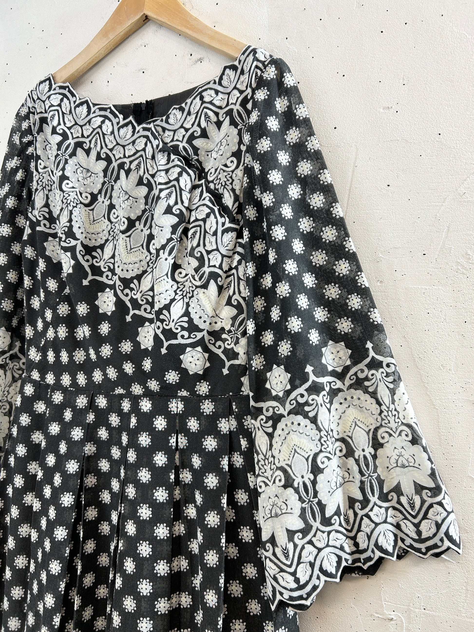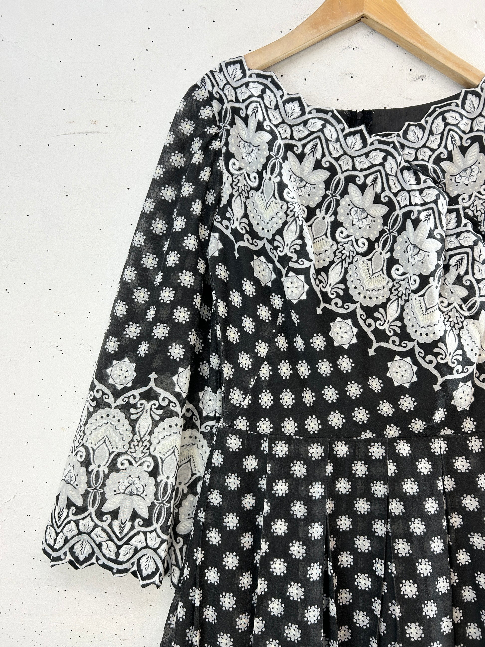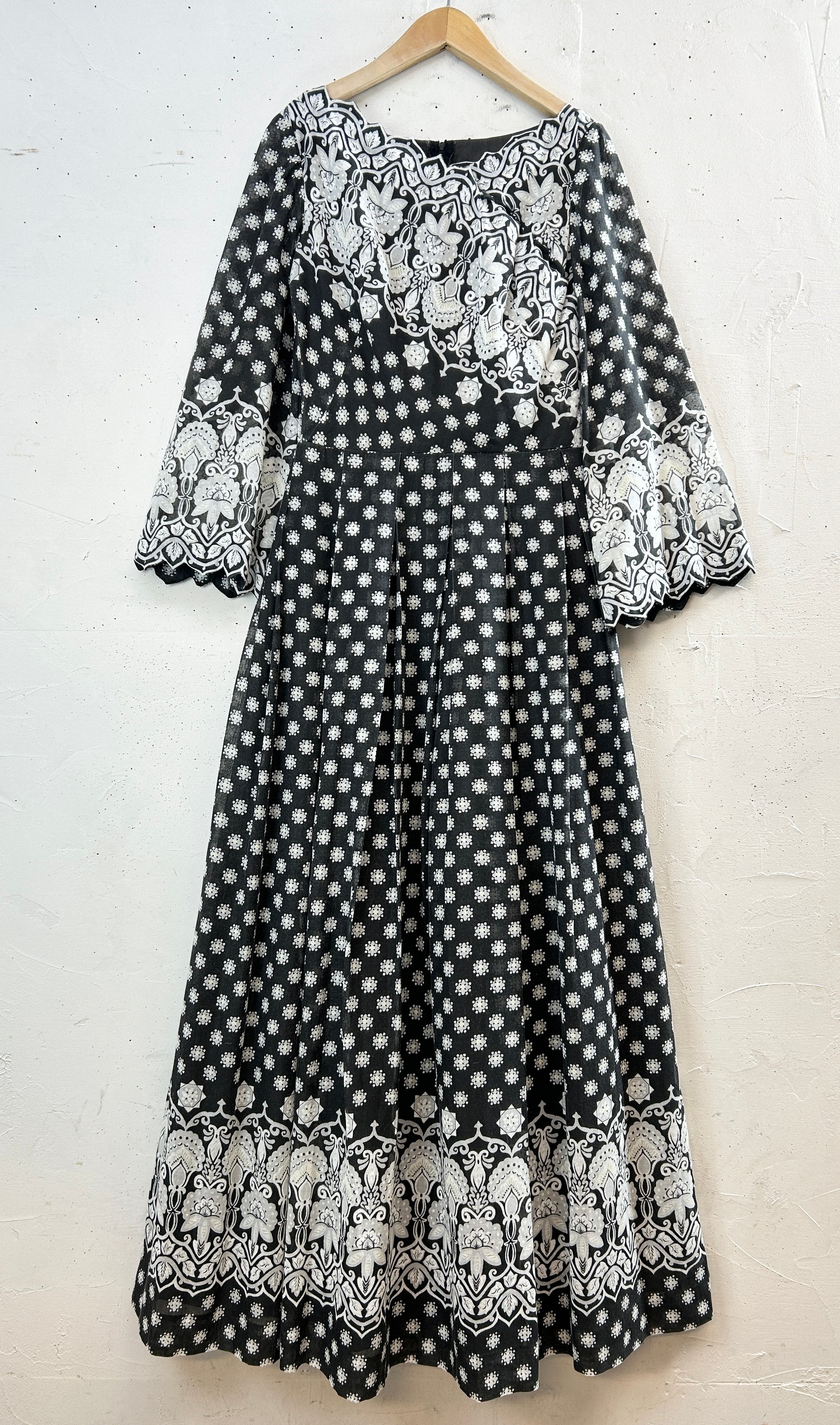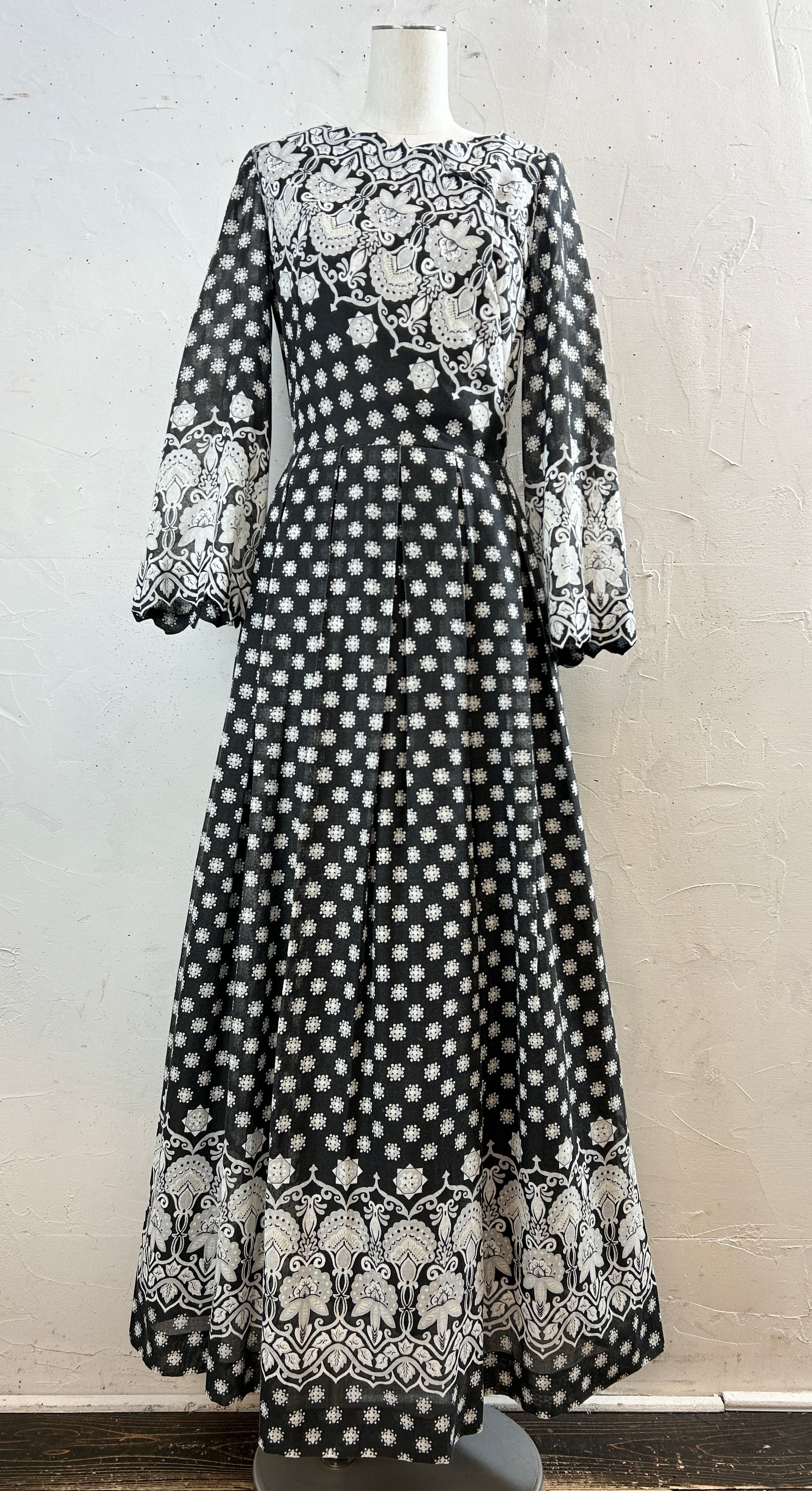 モノトーンカラー、袖口や裾にかけての柄使いが非常に贅沢なドレスです。