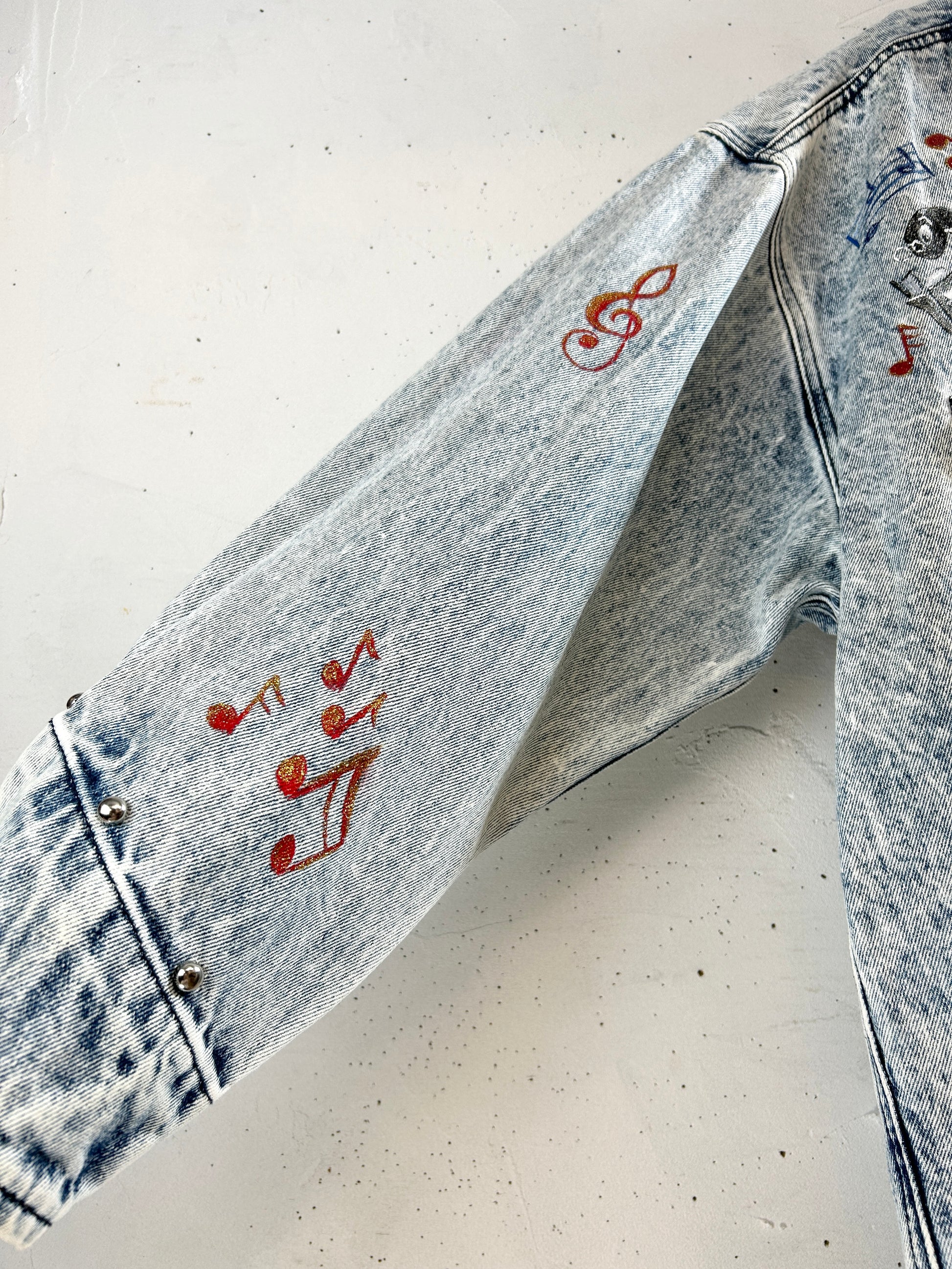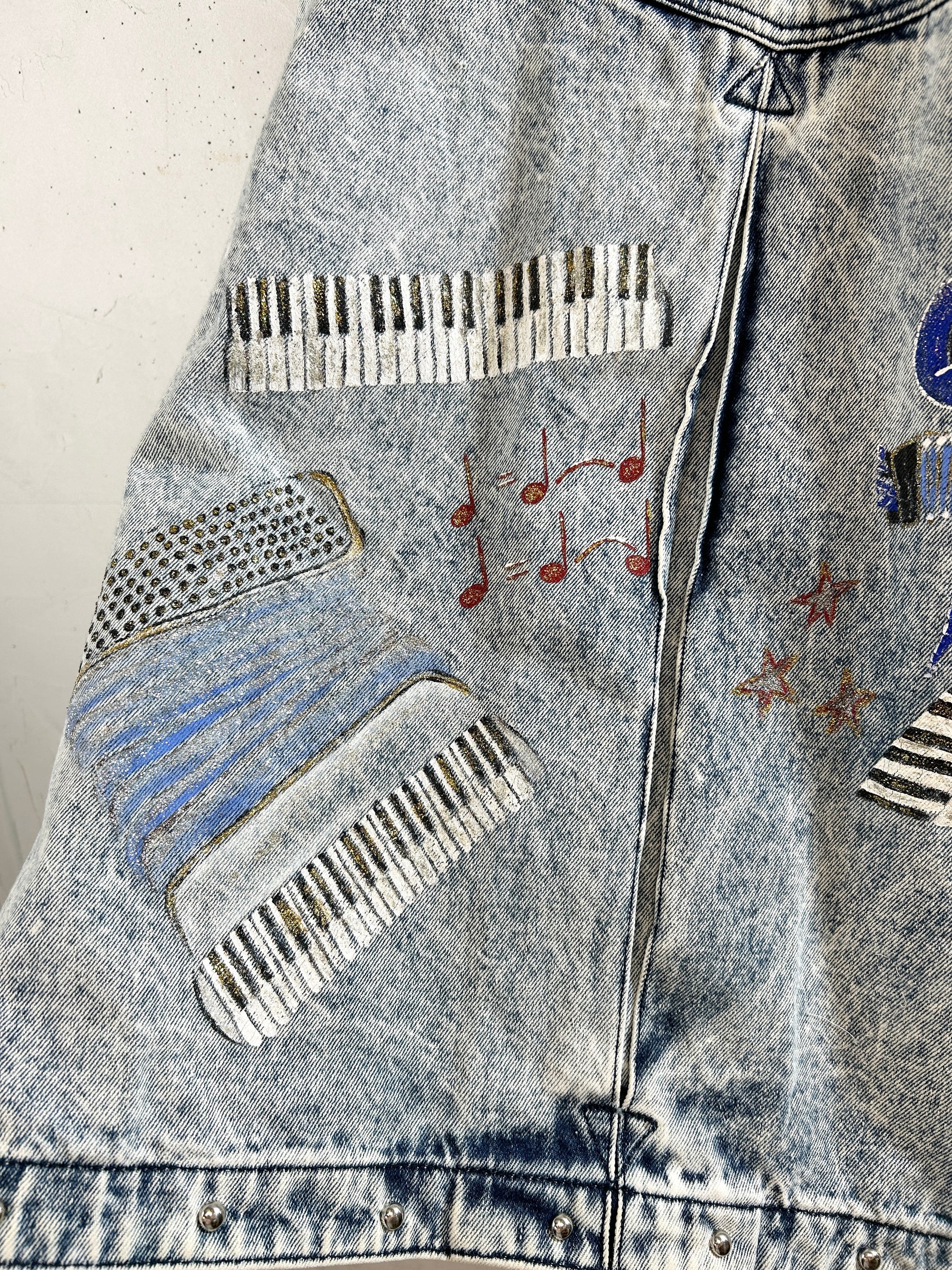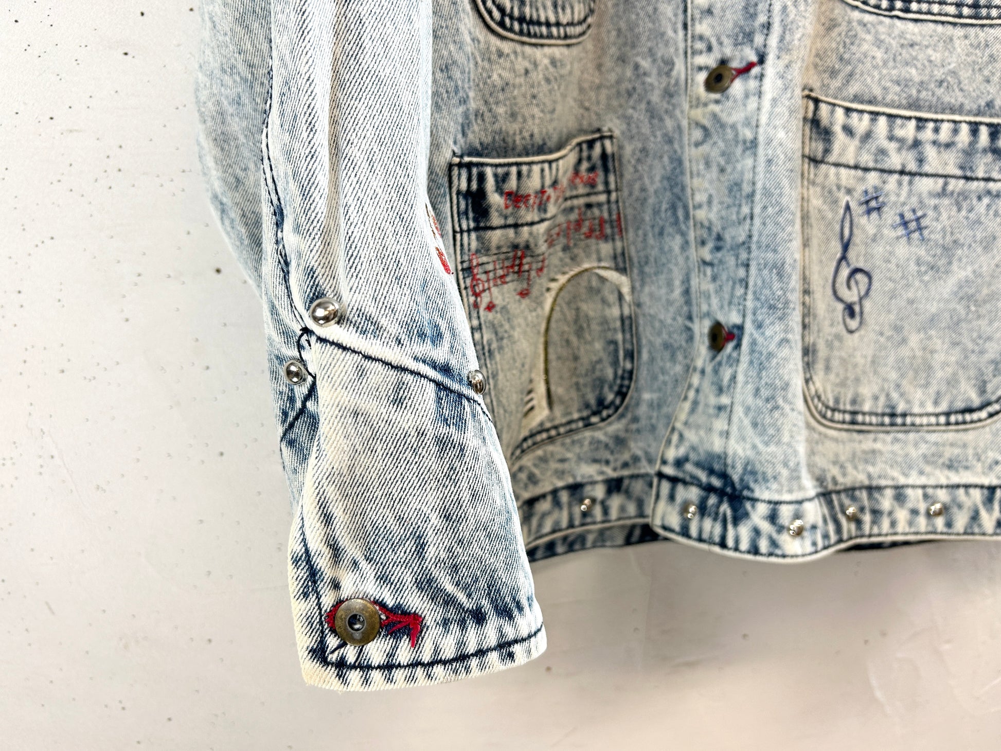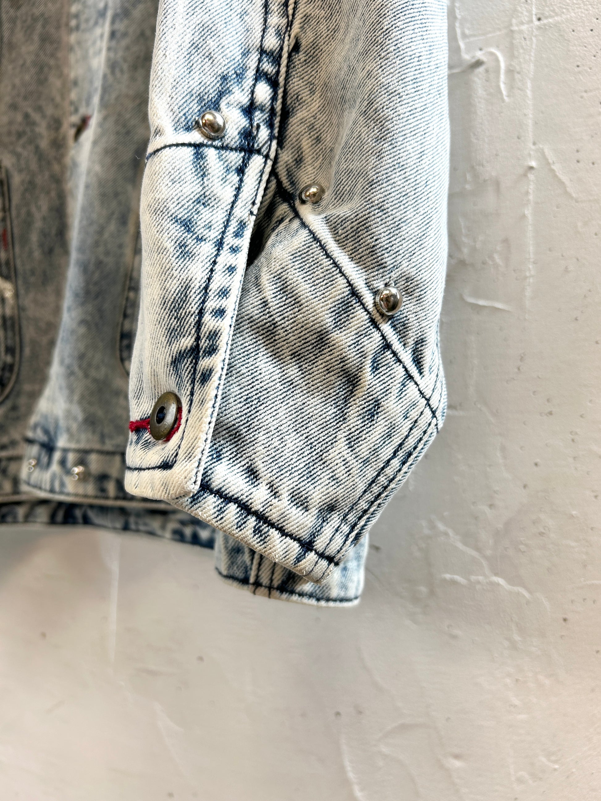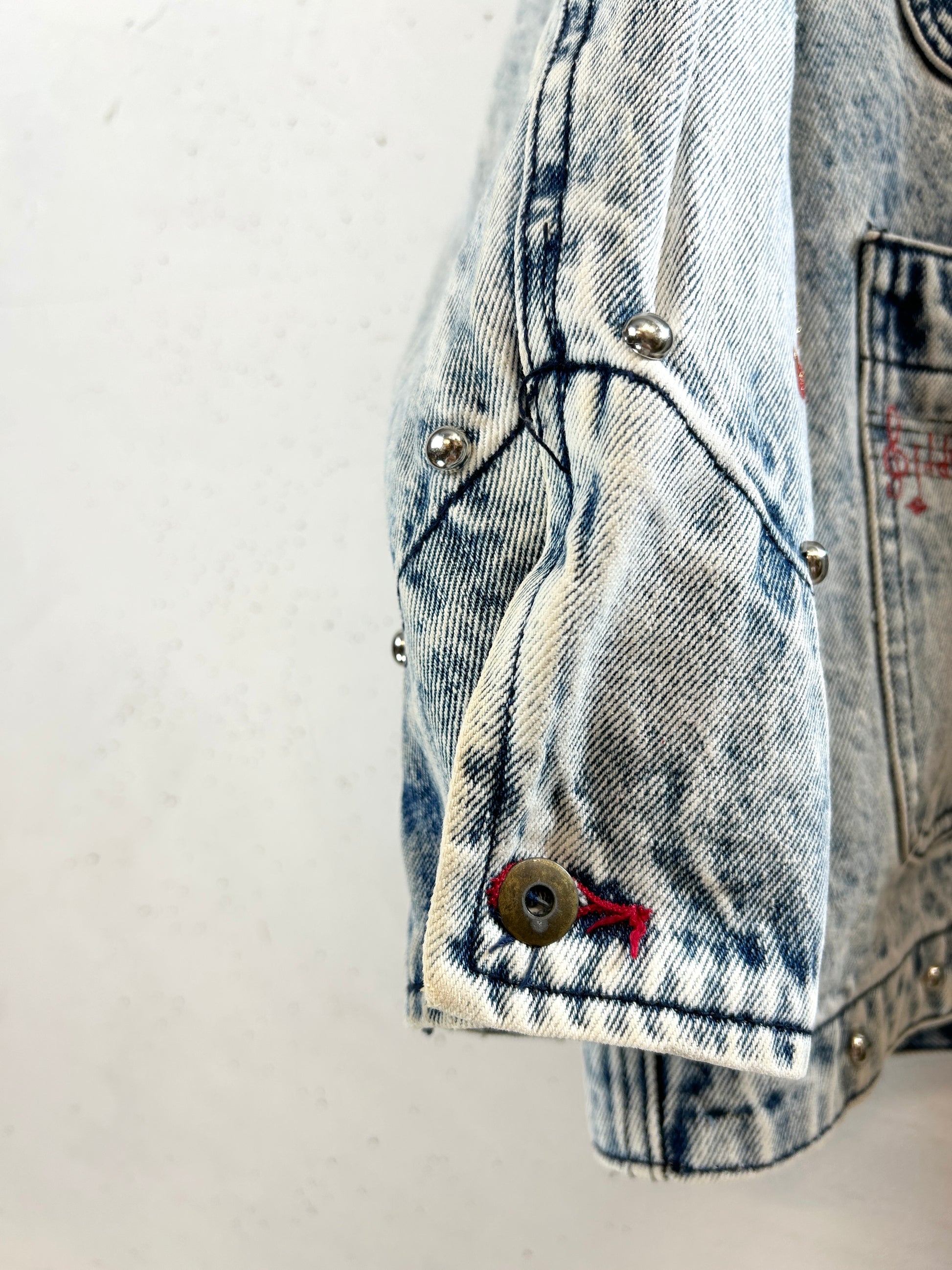 がっぽり良いシルエットのデニムジャケットにペイントやスタッヅが程こされた1着。