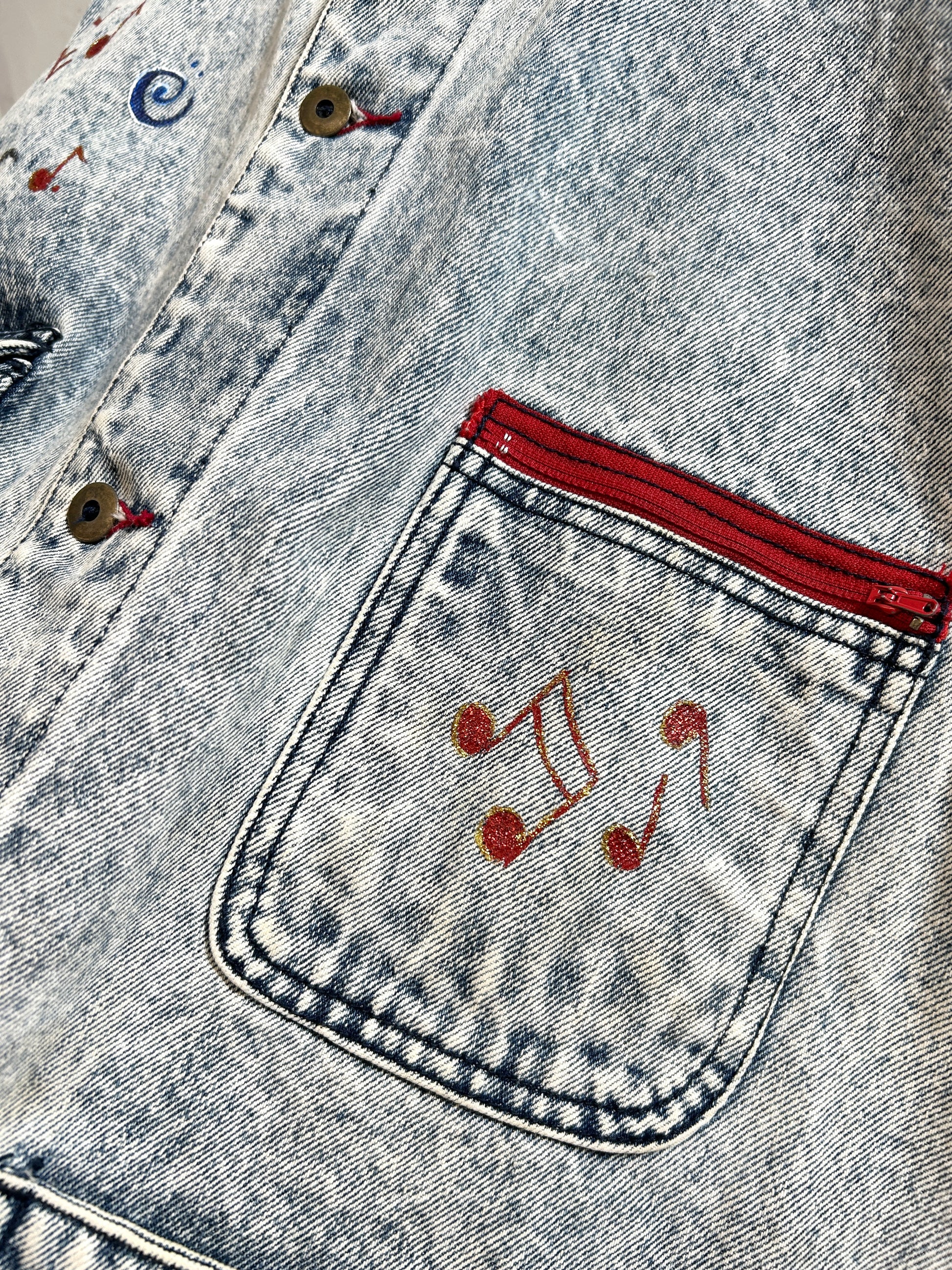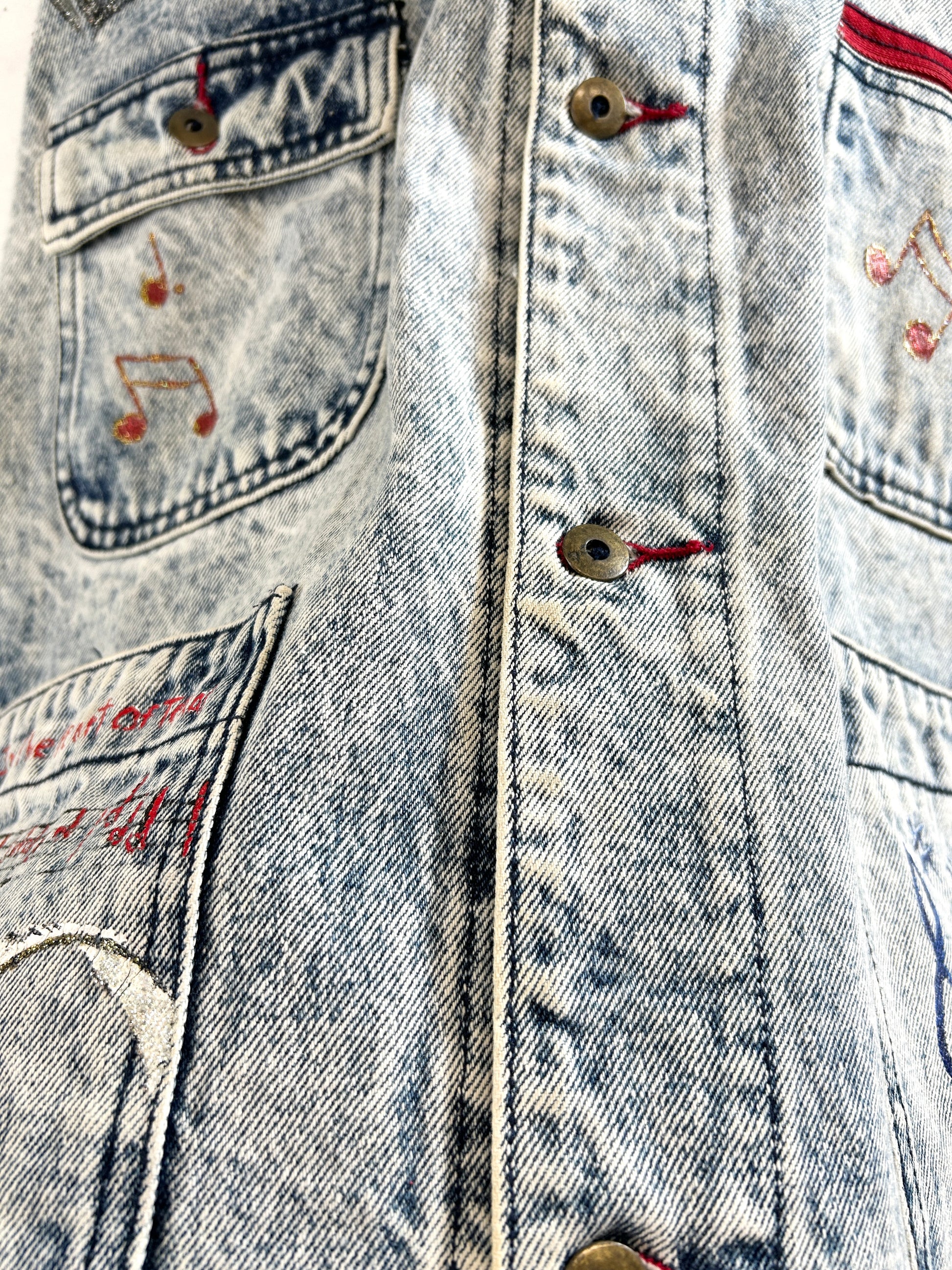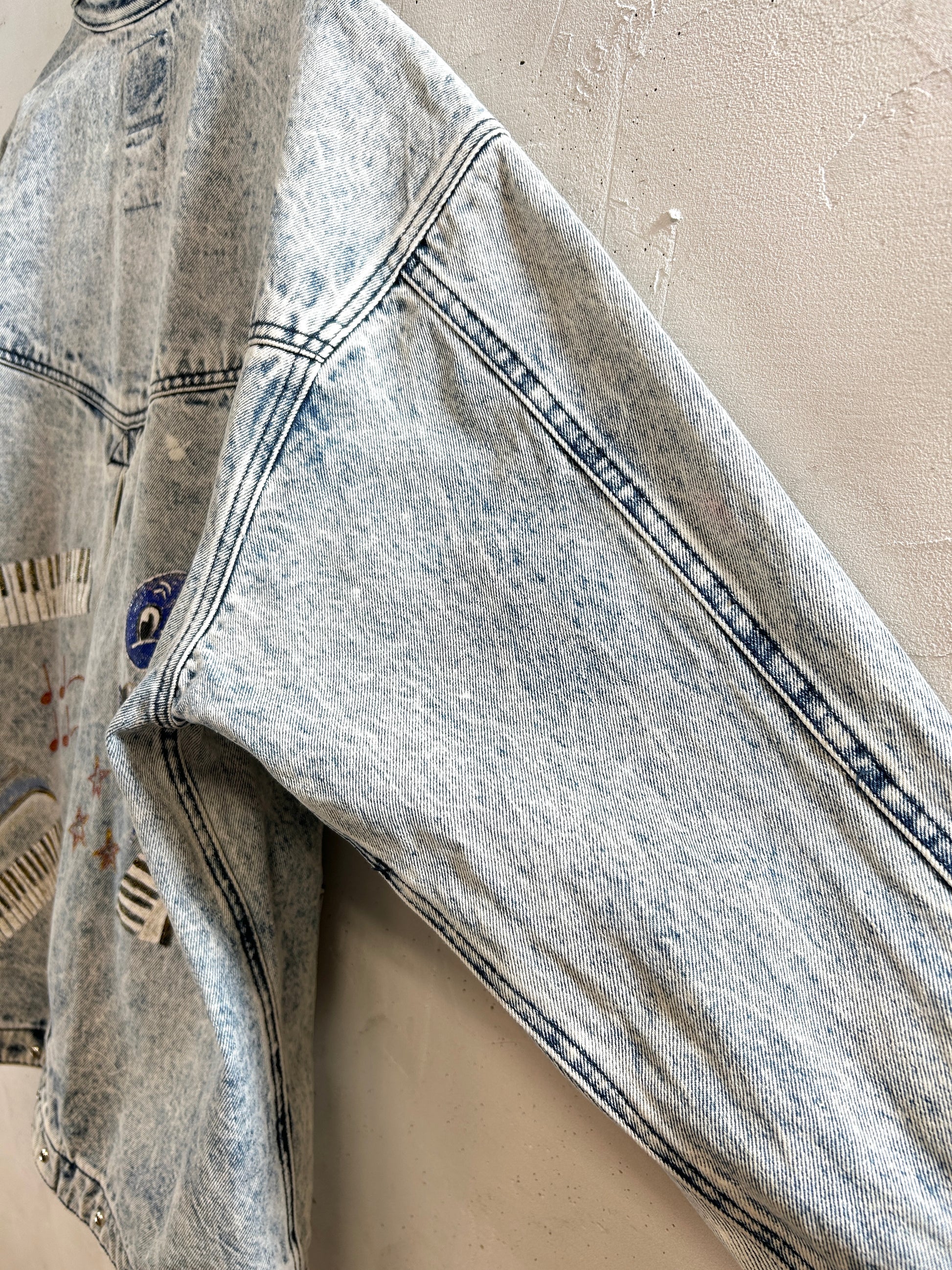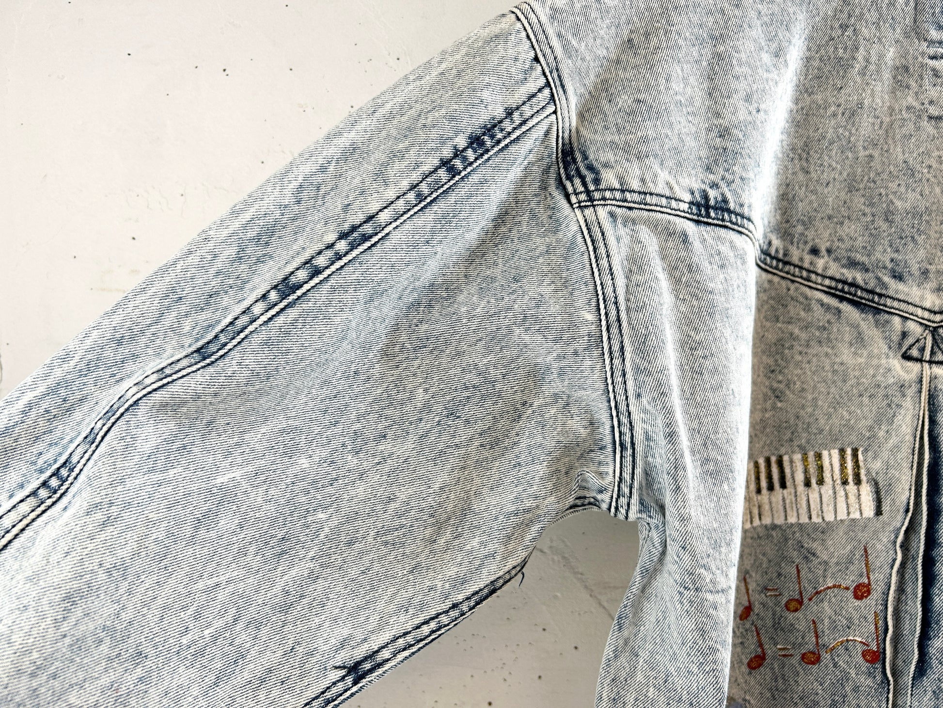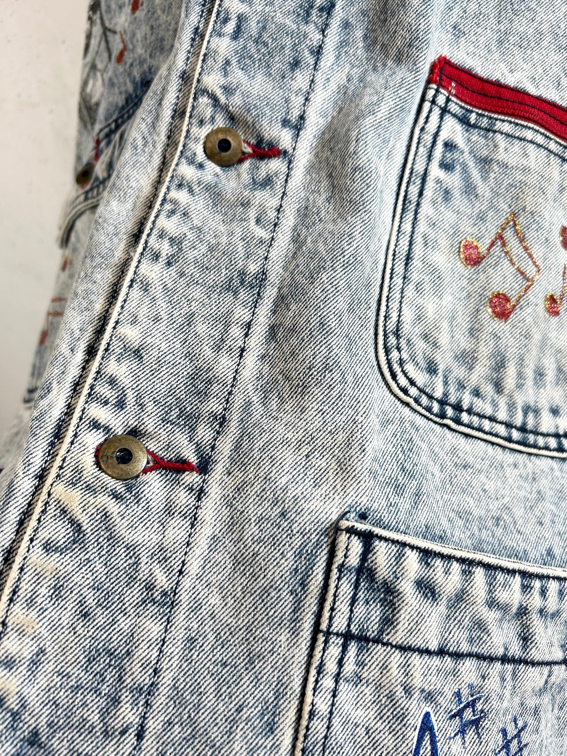 がっぽり良いシルエットのデニムジャケットにペイントやスタッヅが程こされた1着。