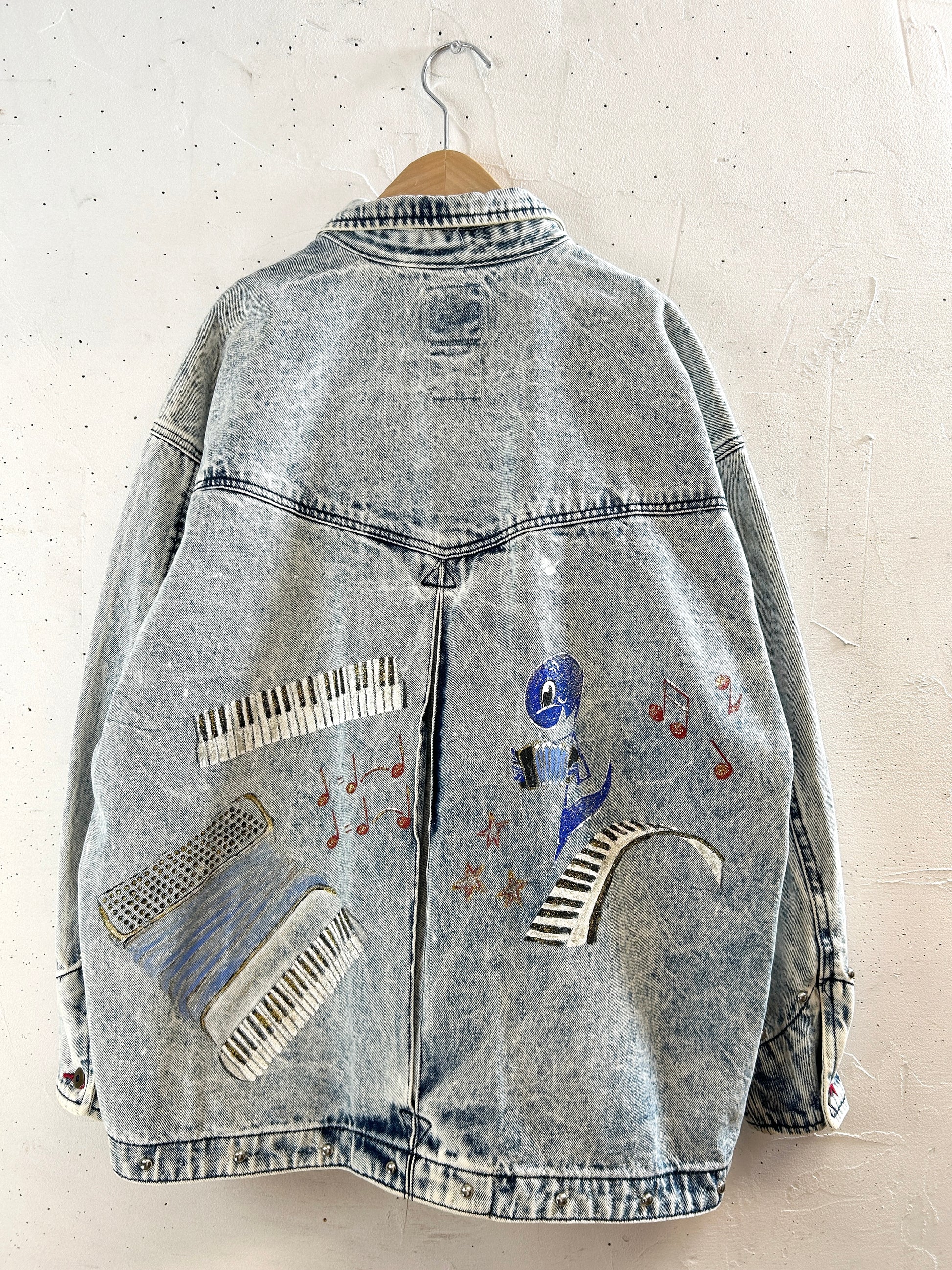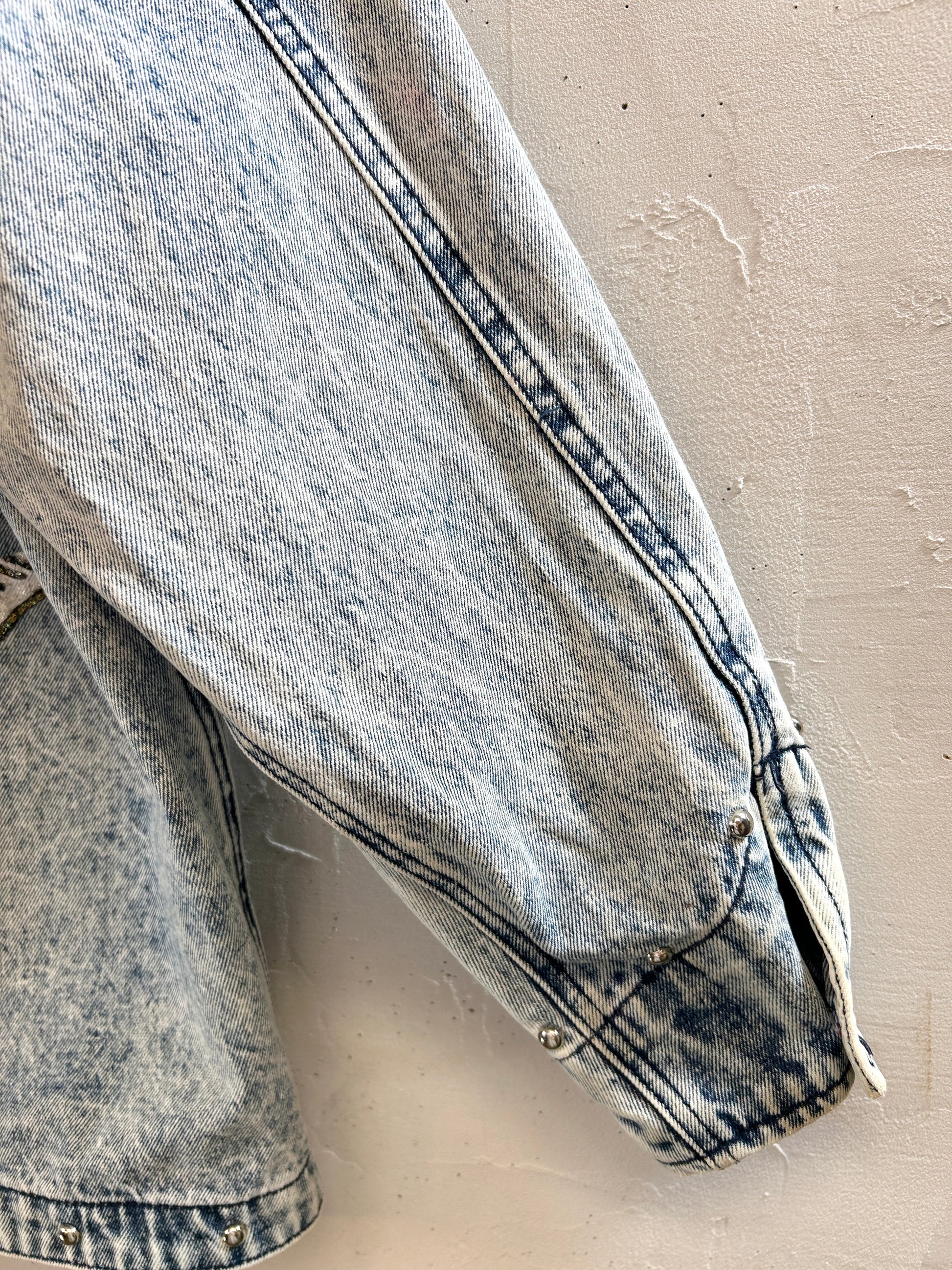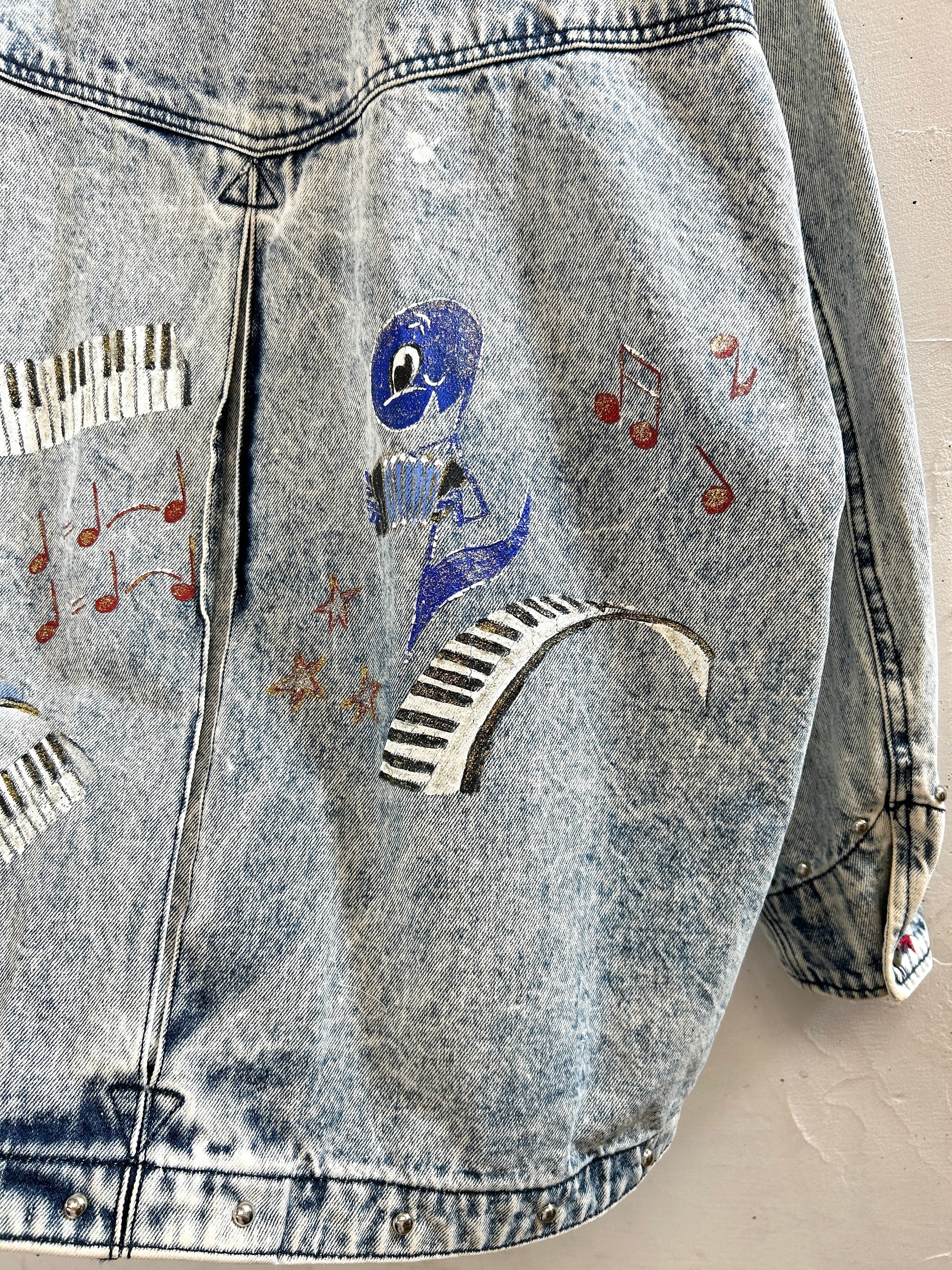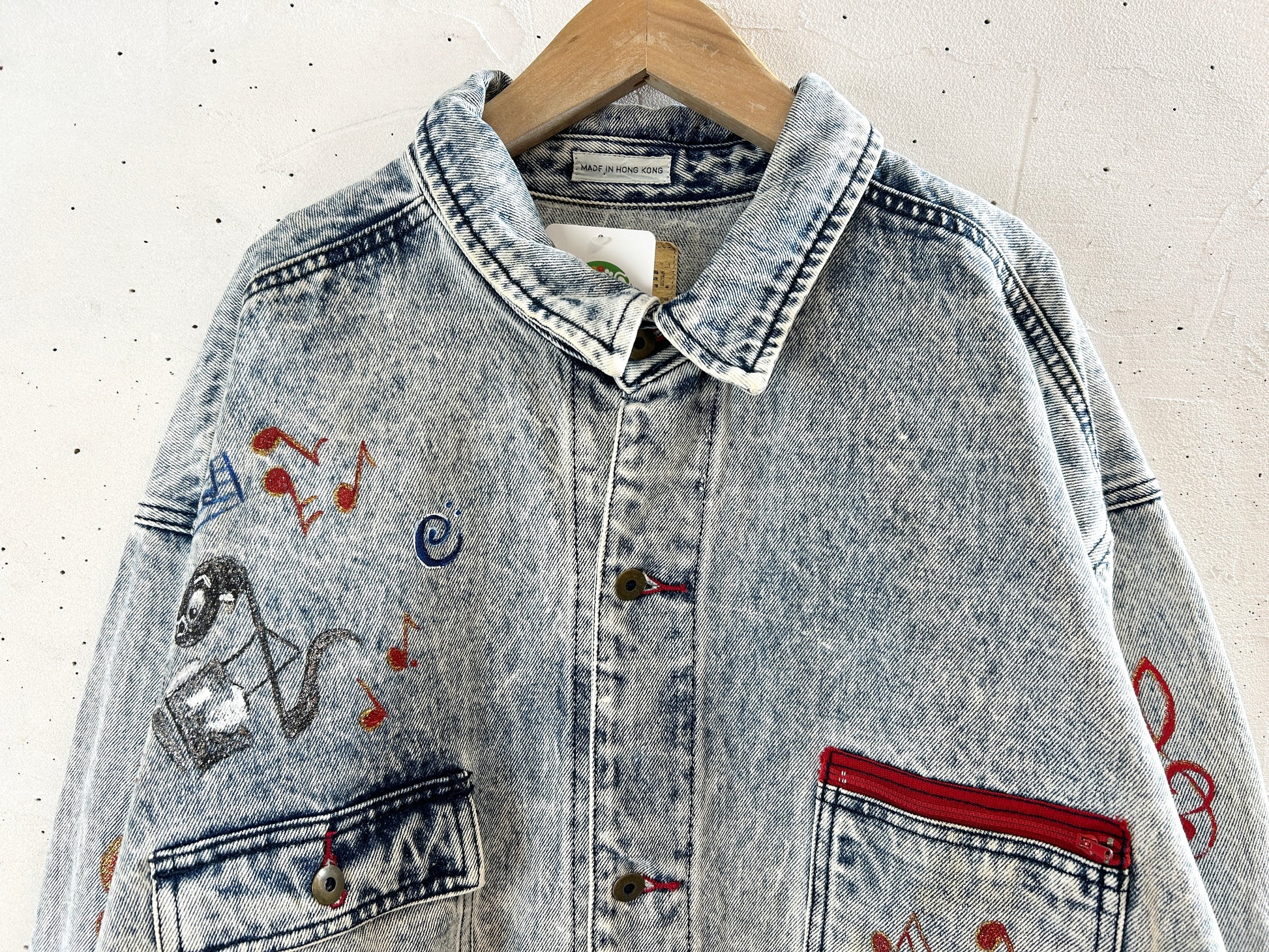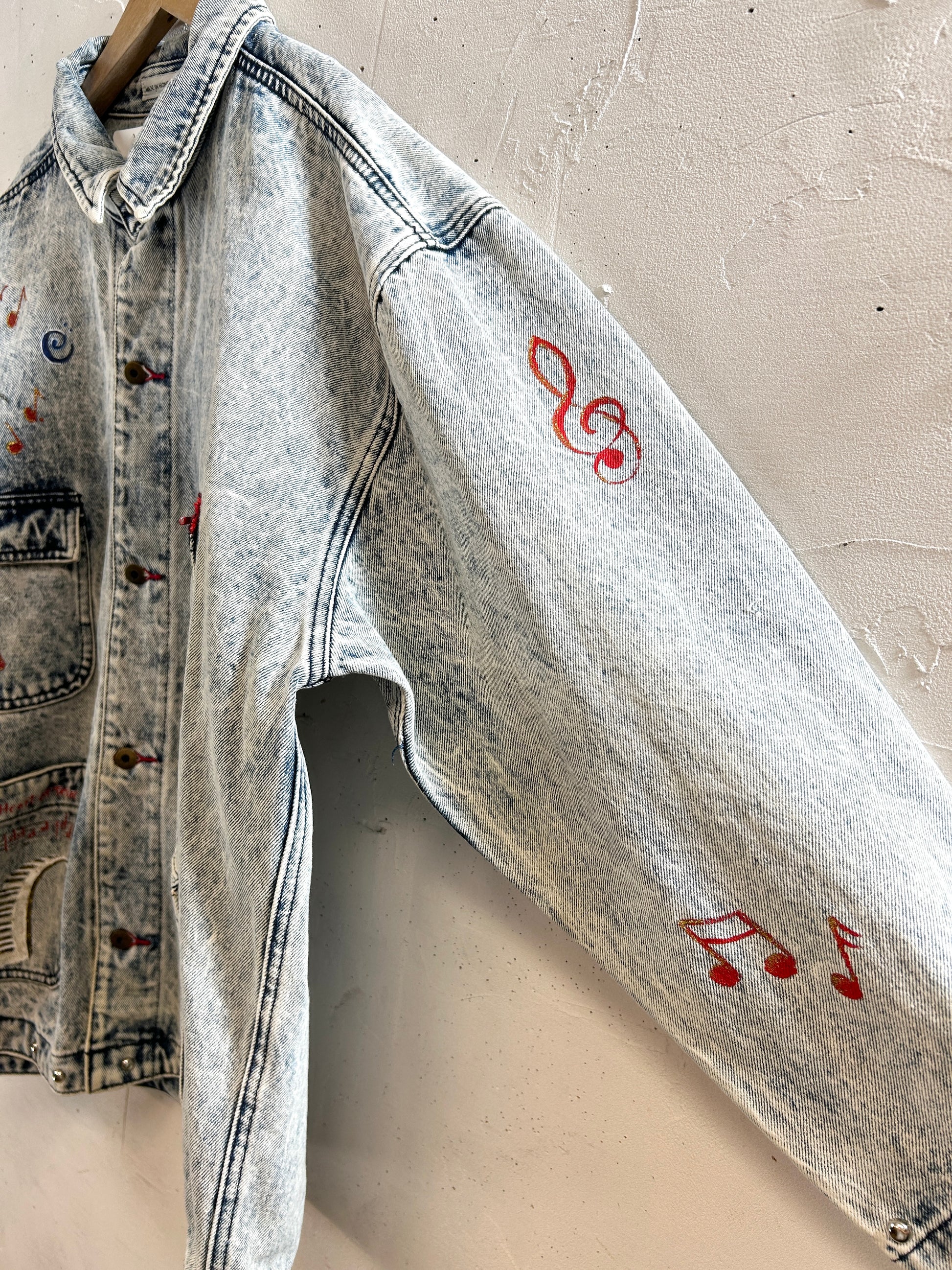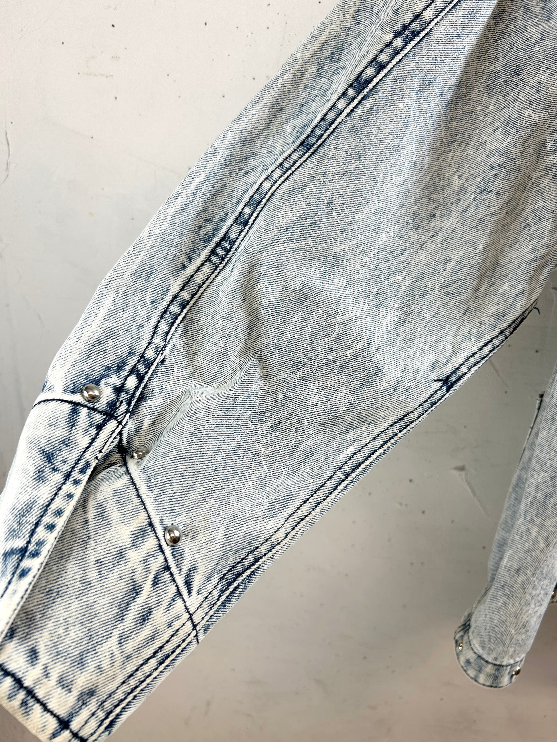 がっぽり良いシルエットのデニムジャケットにペイントやスタッヅが程こされた1着。