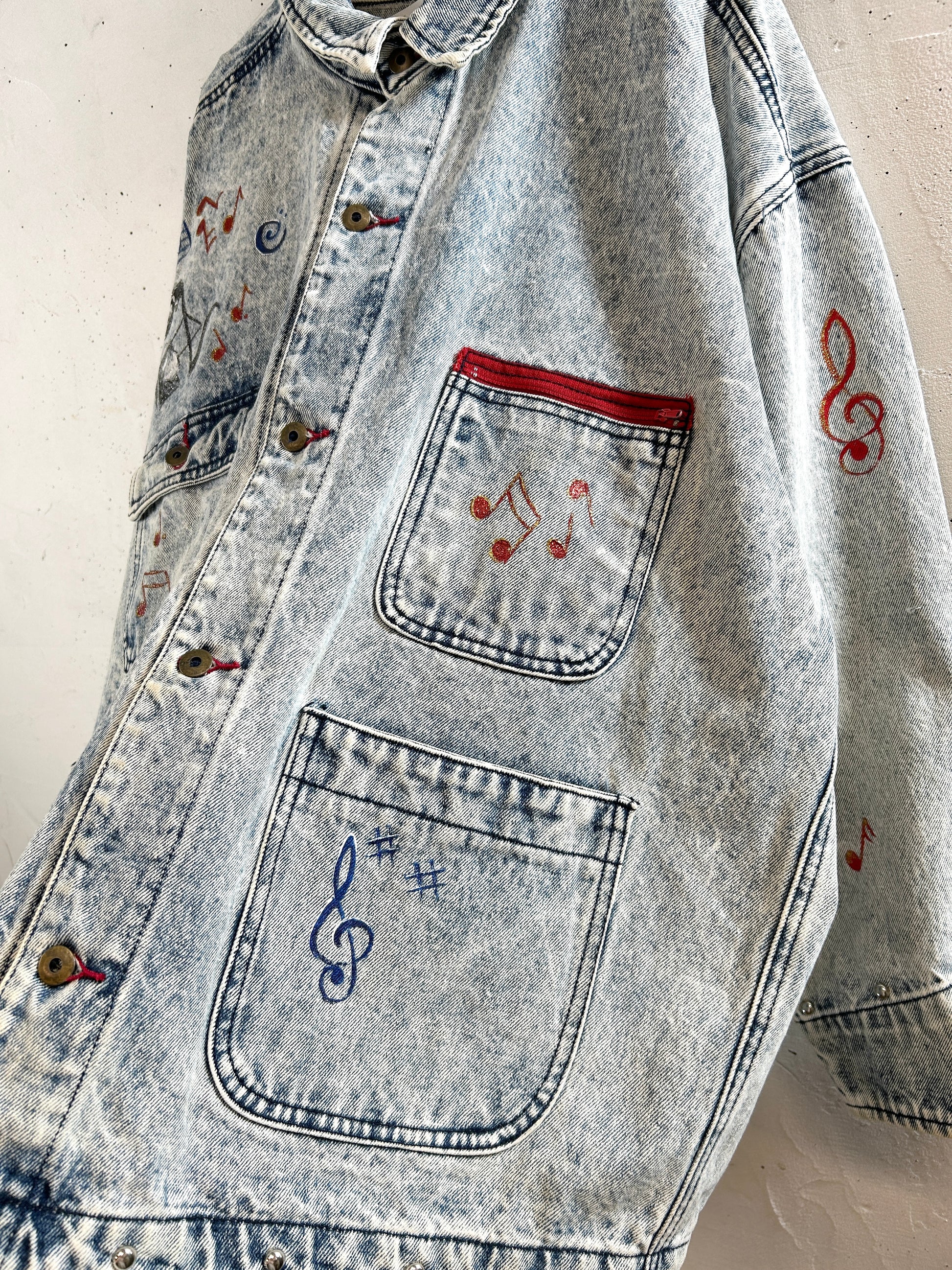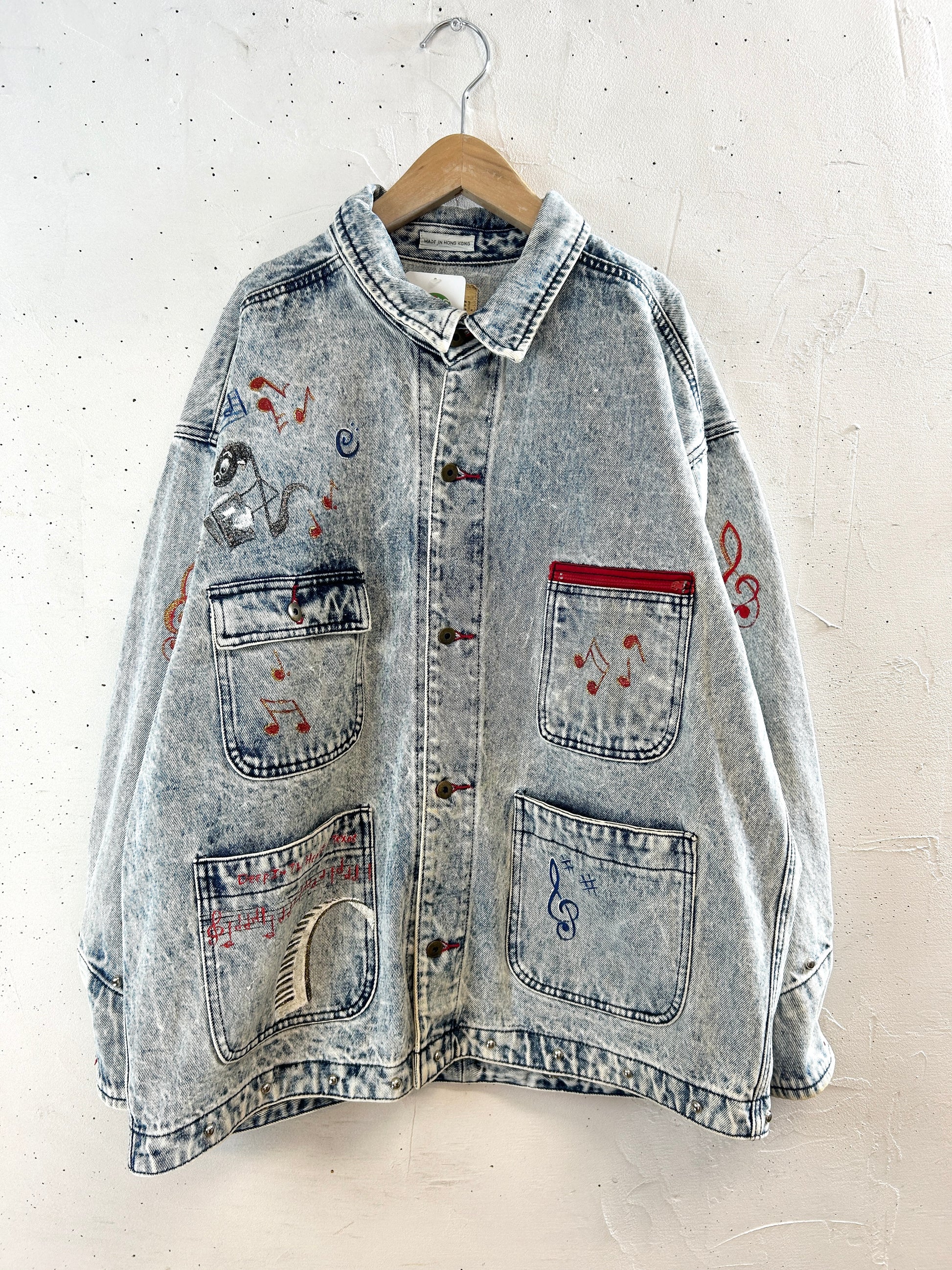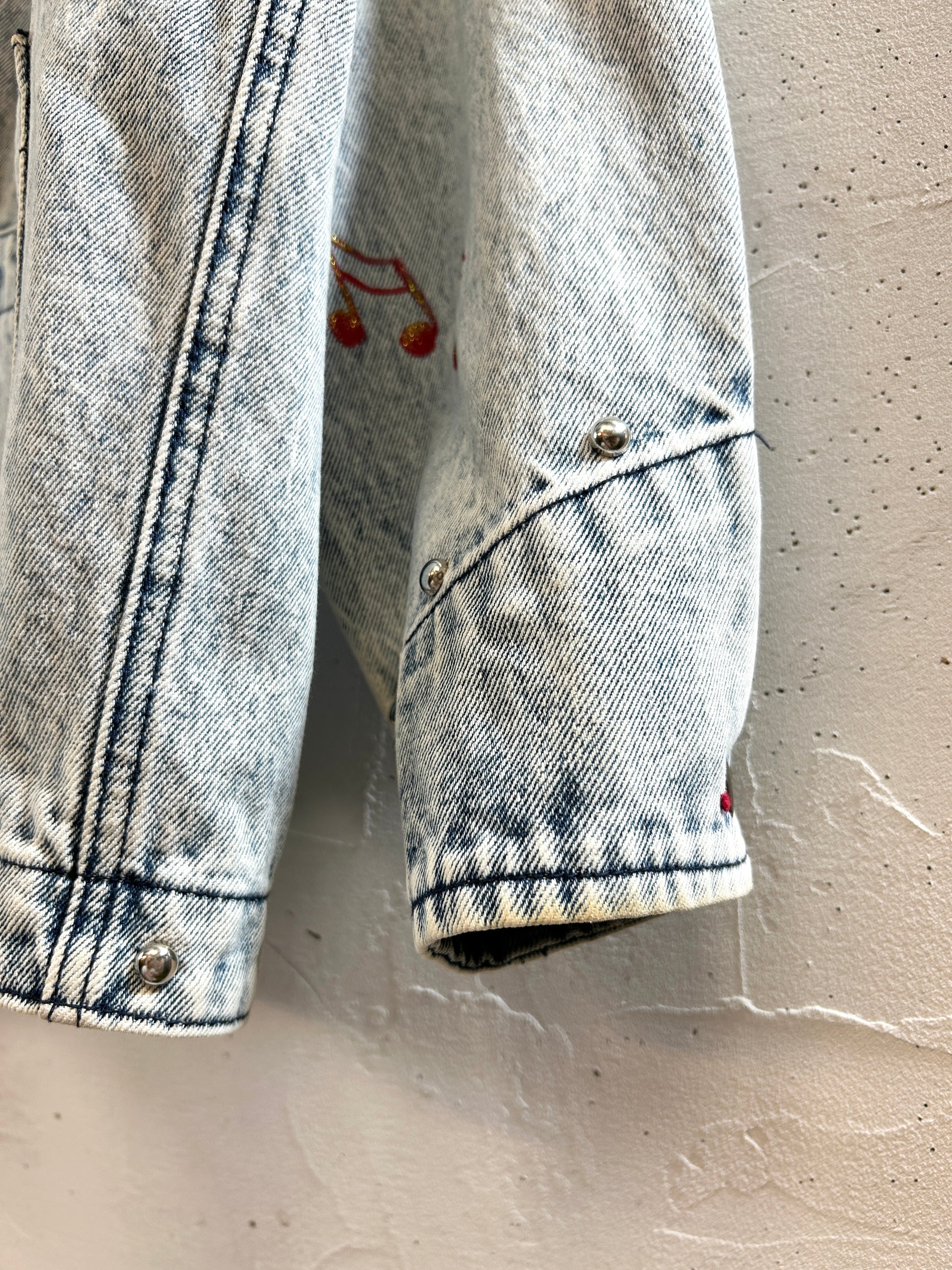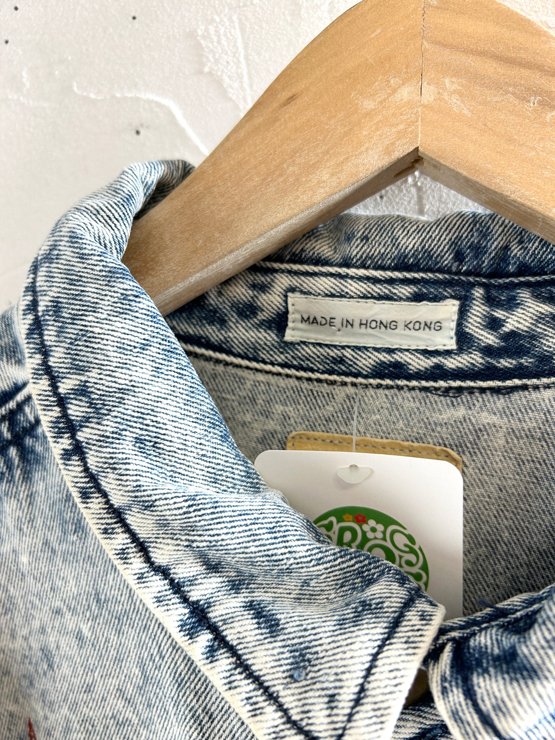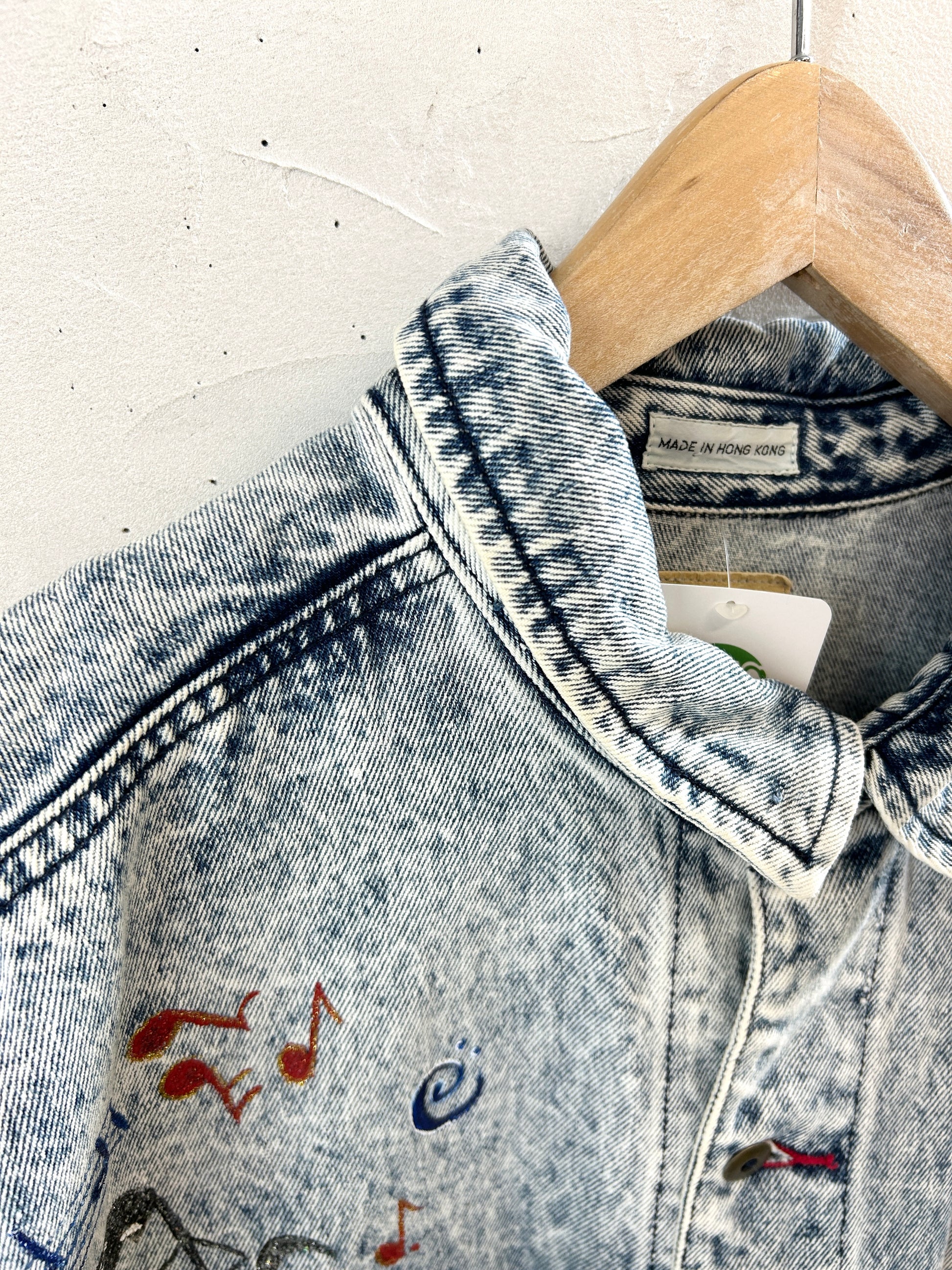 がっぽり良いシルエットのデニムジャケットにペイントやスタッヅが程こされた1着。