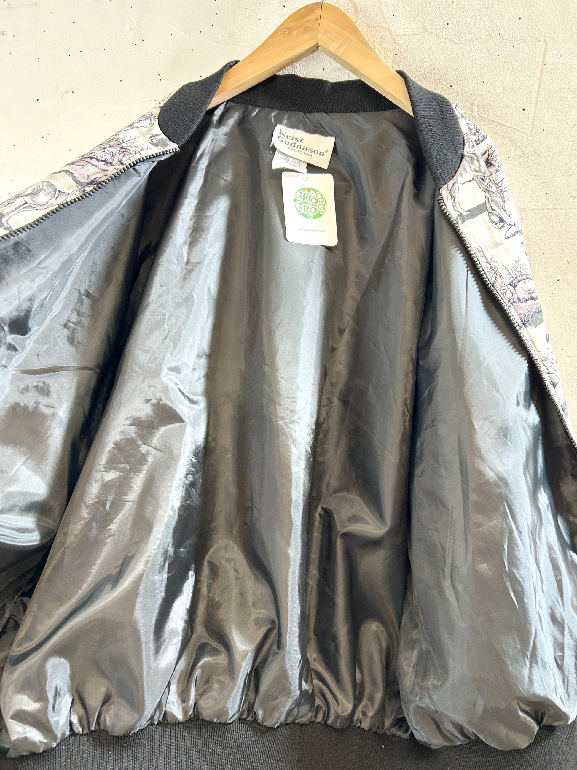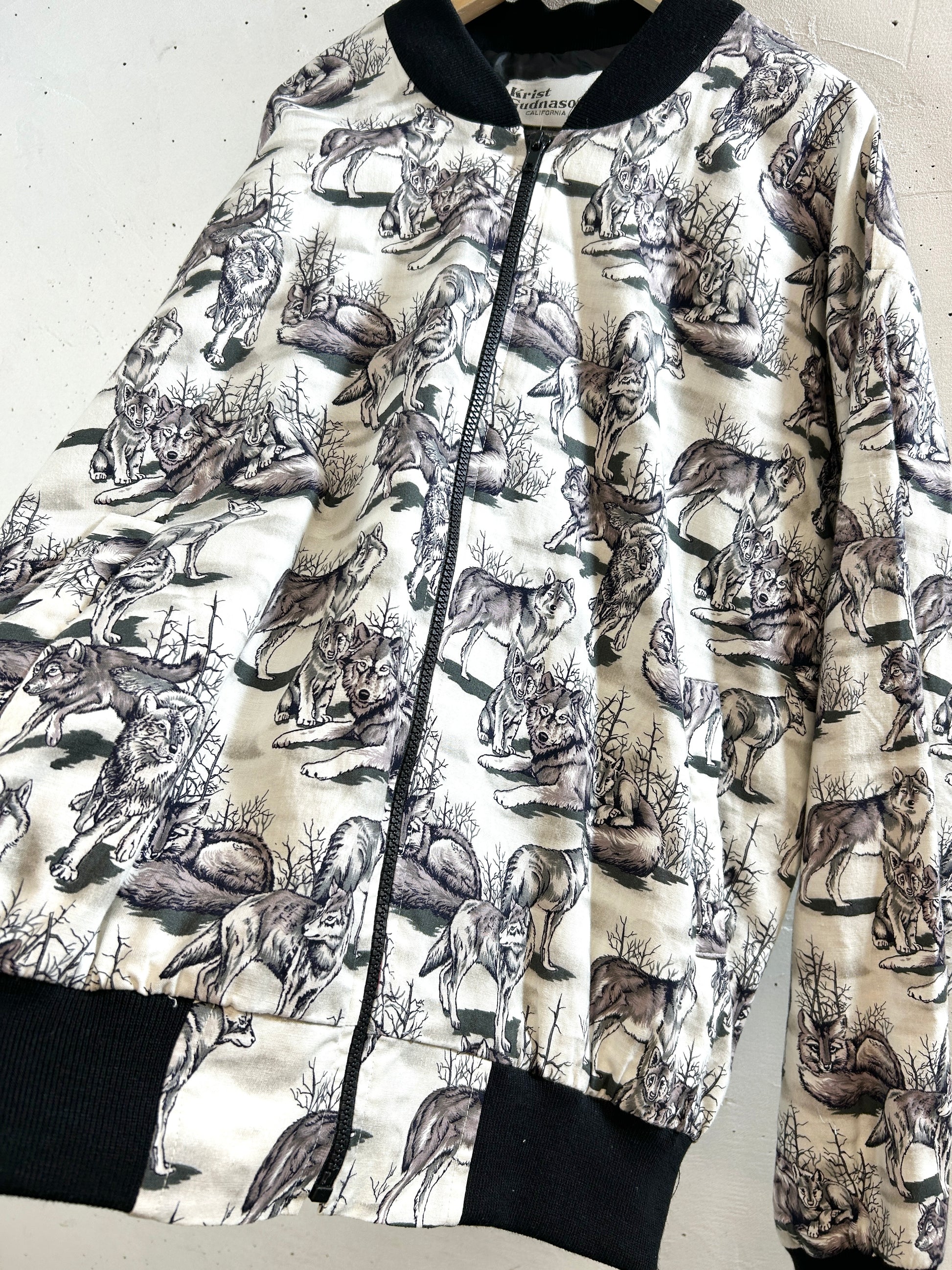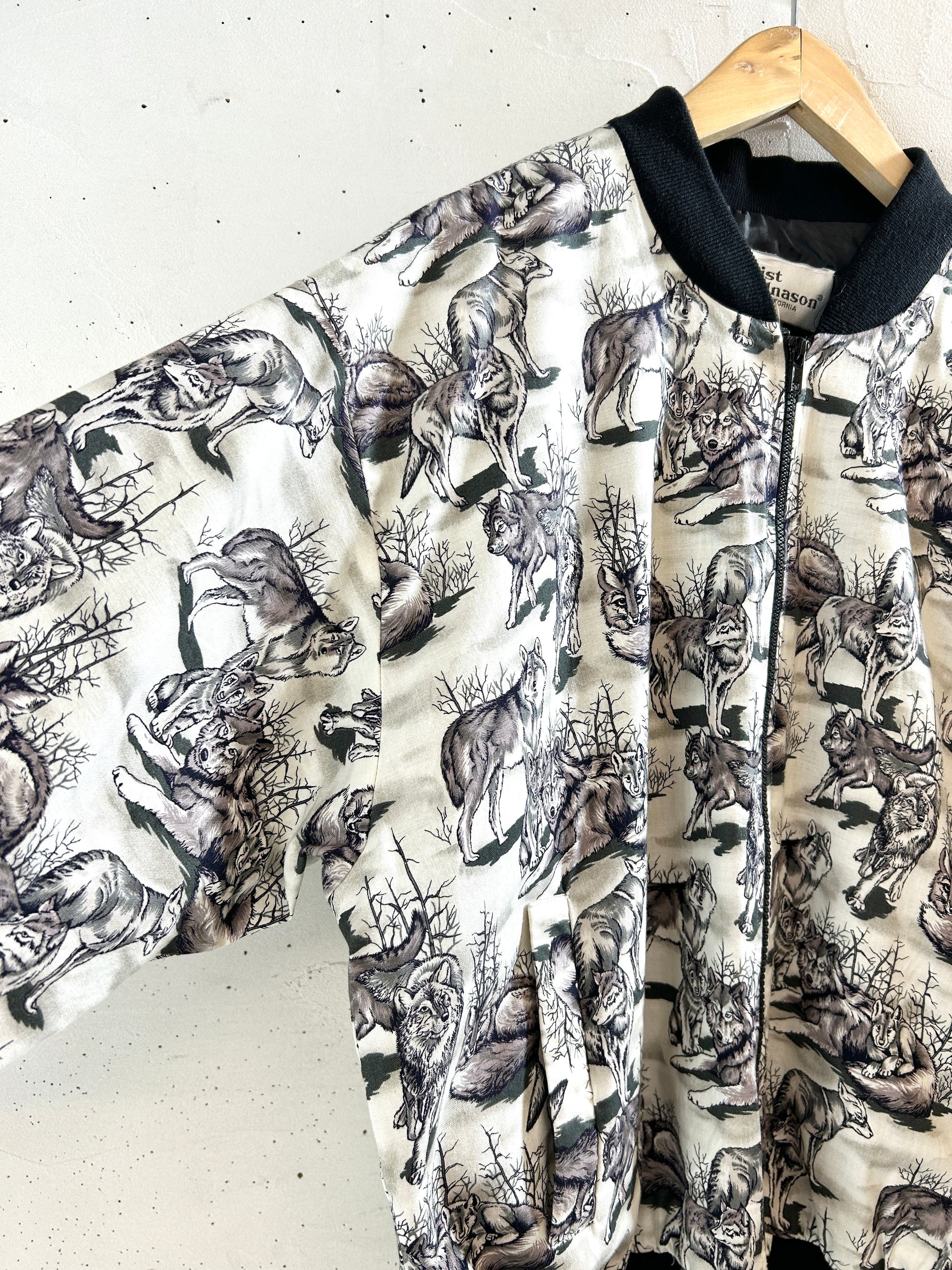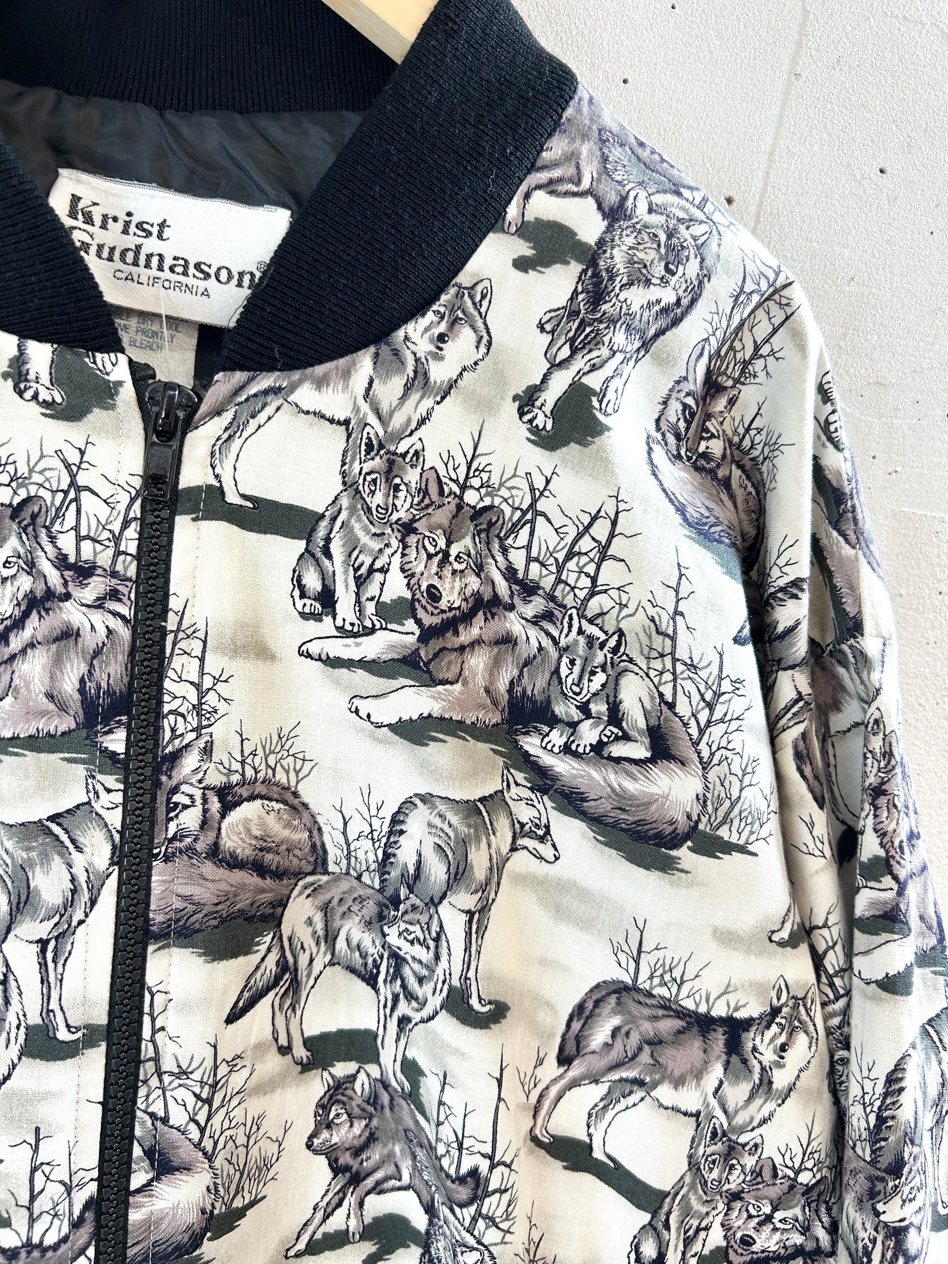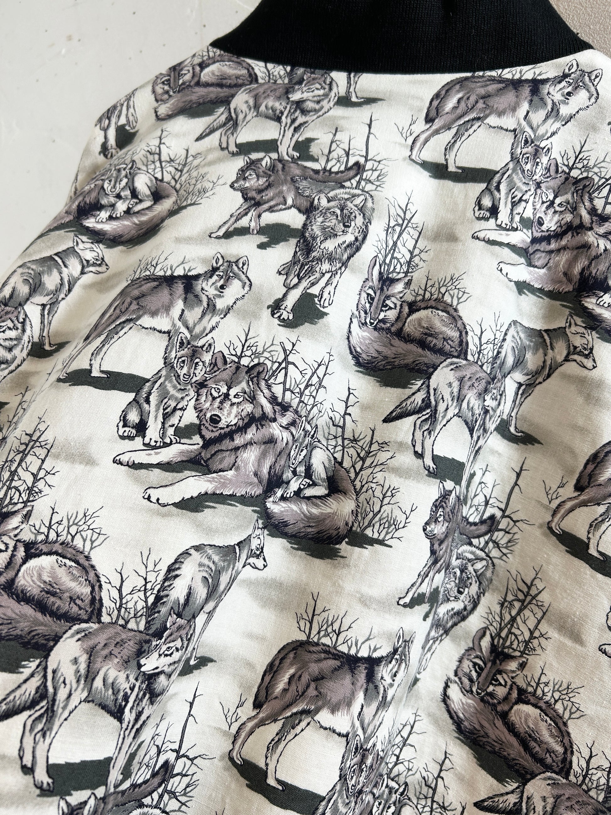 グレーやベージュといった絶妙なボディに躍動感とリアル感たっぷりのウルフプリント。リブがつくブルゾンタイプで普段から気兼ねなく着られ魅力満載です。