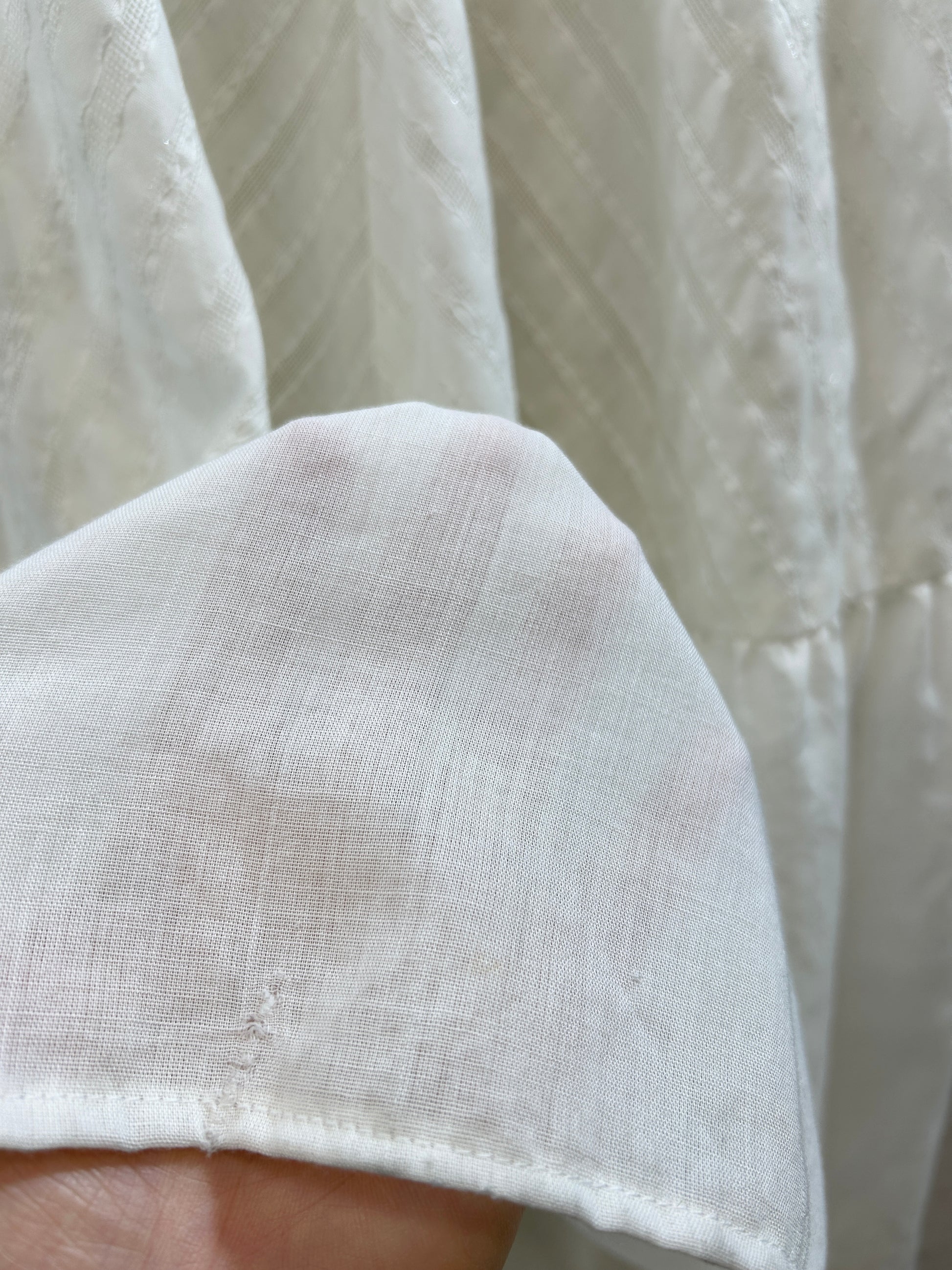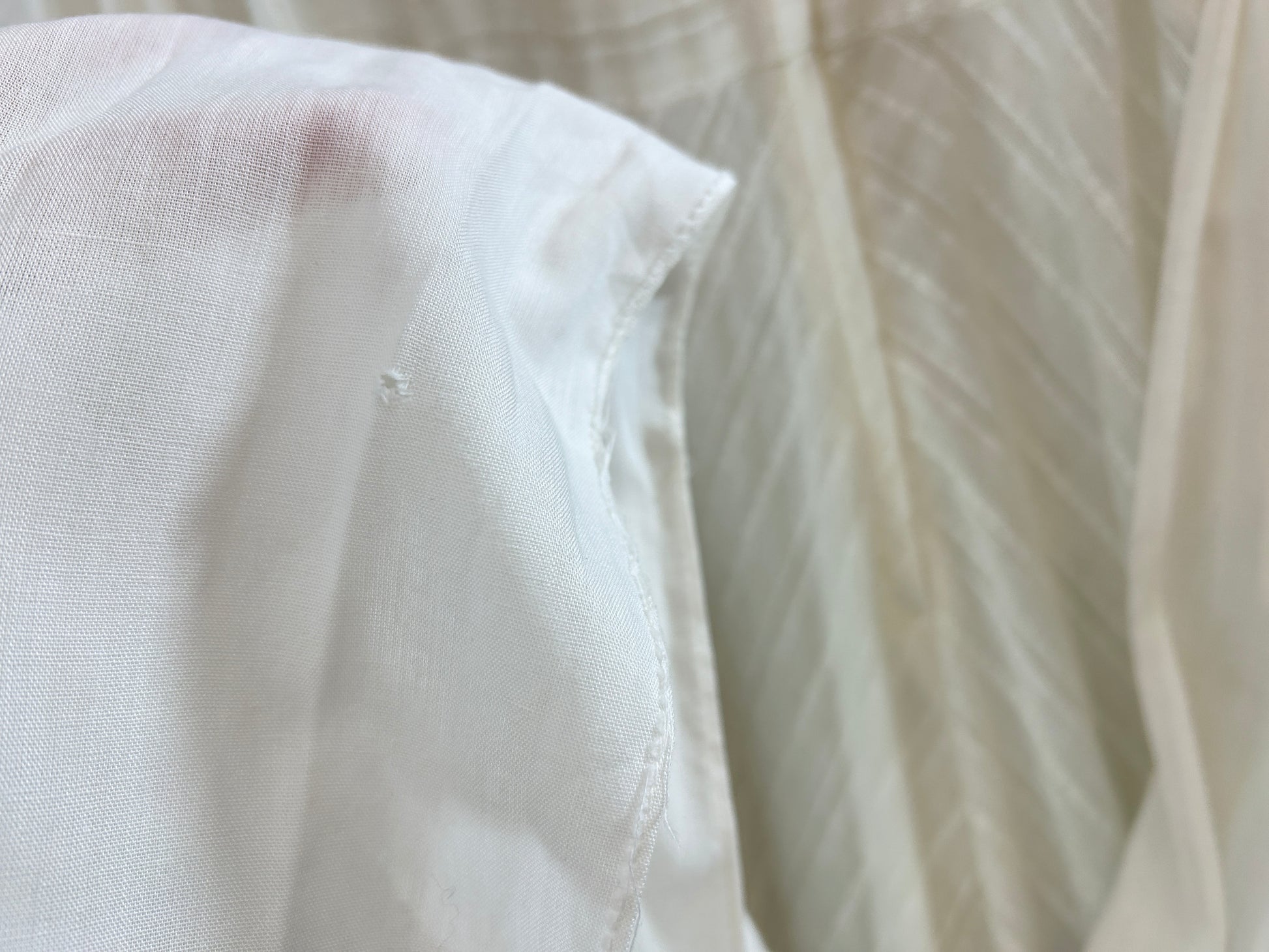 コンディション:肩薄ら汚れ、くるみボタンはげ、スカート所々薄らシミ、リボン傷とシミがございますがどれも大きく目立つ様なものではないので気にせず着用頂けると思います。その他特筆するダメージ等無く、ビンテージにご理解いただいている方でしたら、気にせず着用頂けます。
