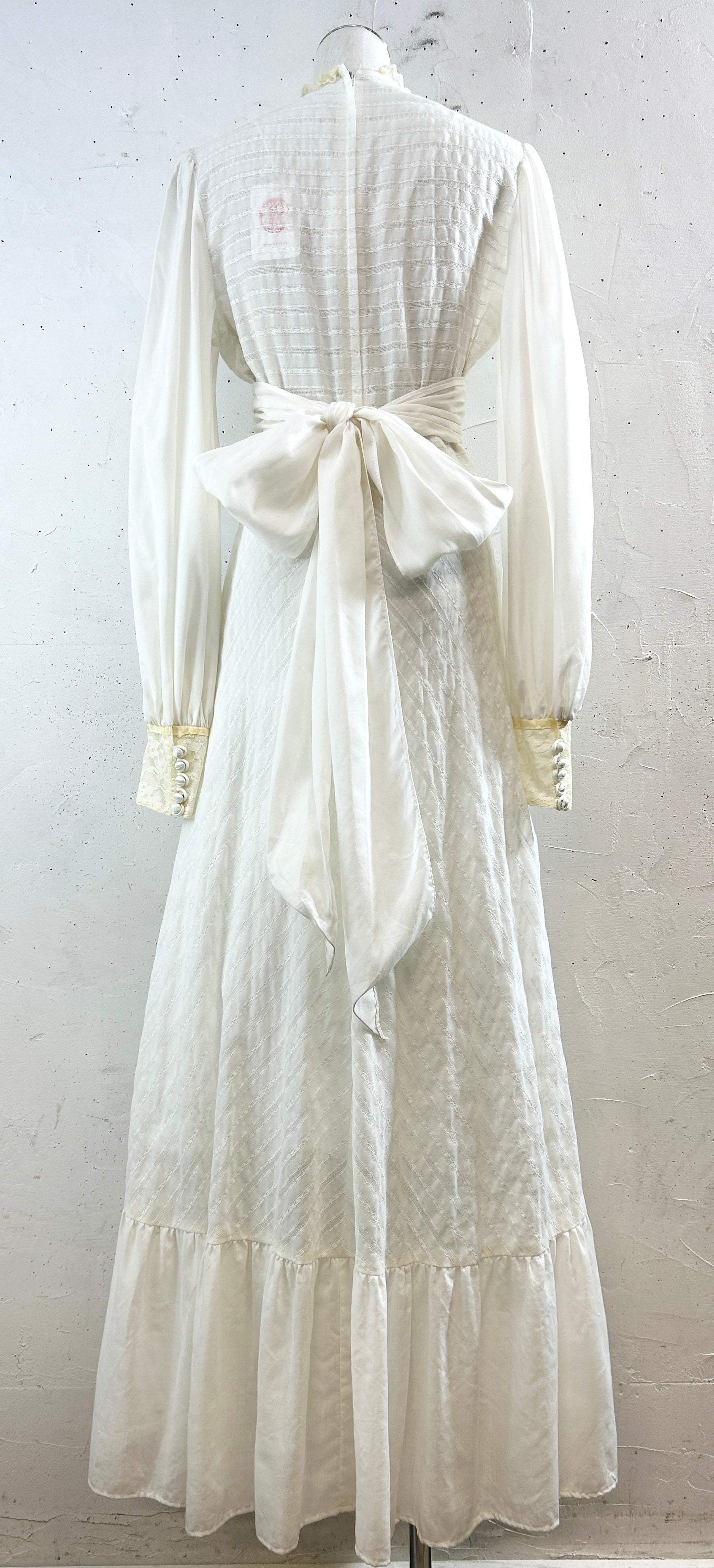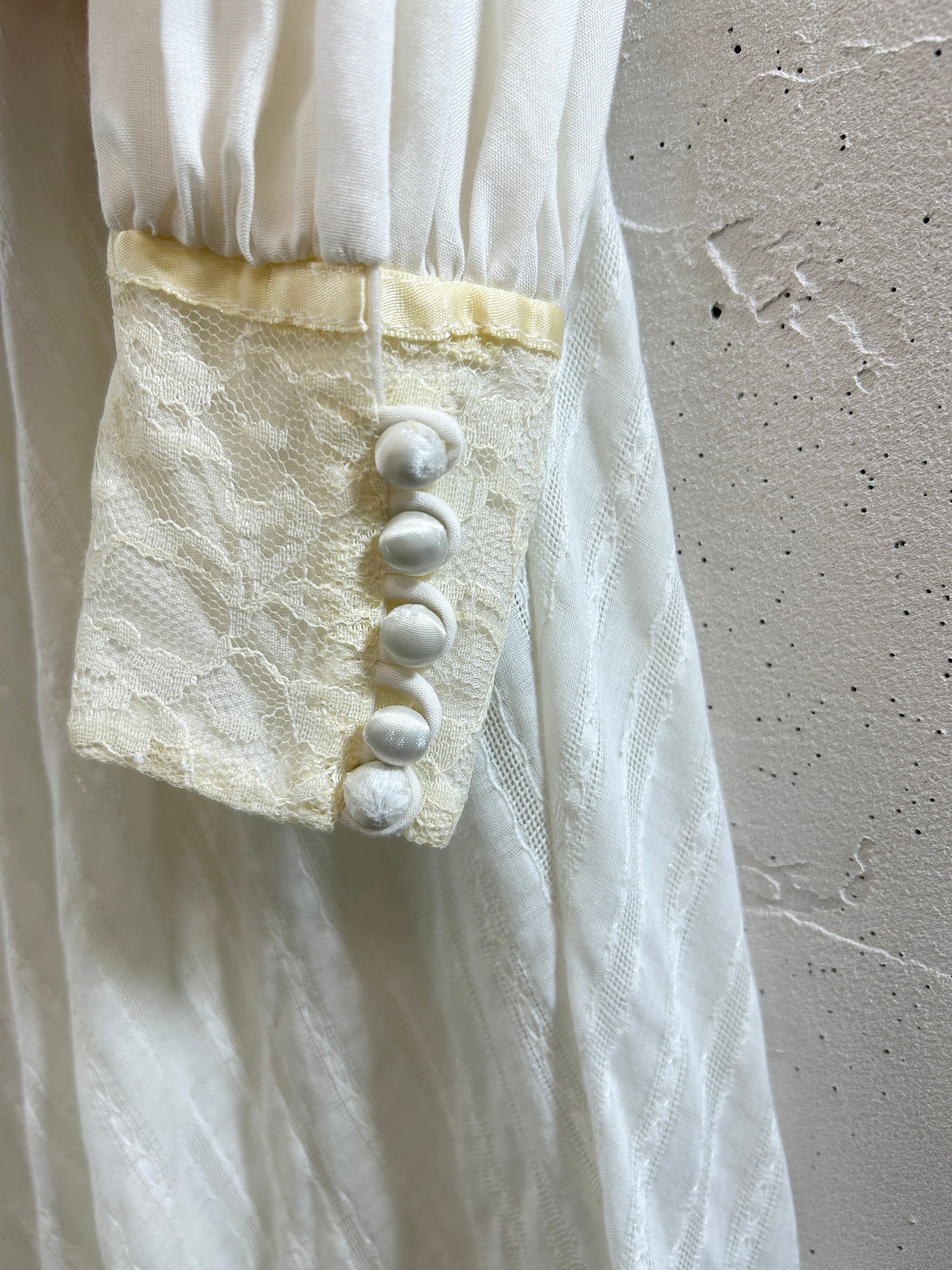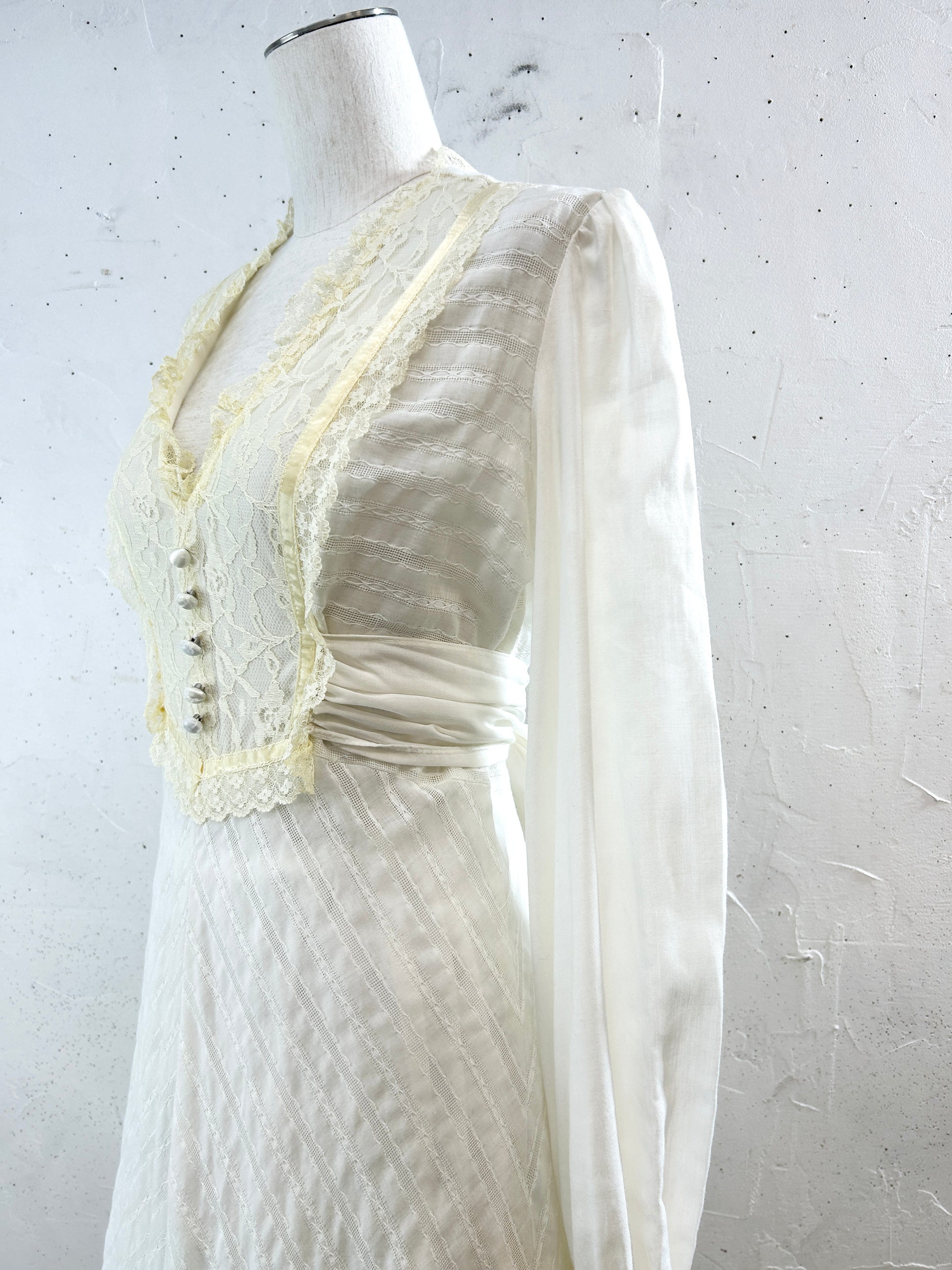 こちらのドレスは、美しいホワイトボディにクリームカラーのレースやサテンテープを贅沢に使用した1着。