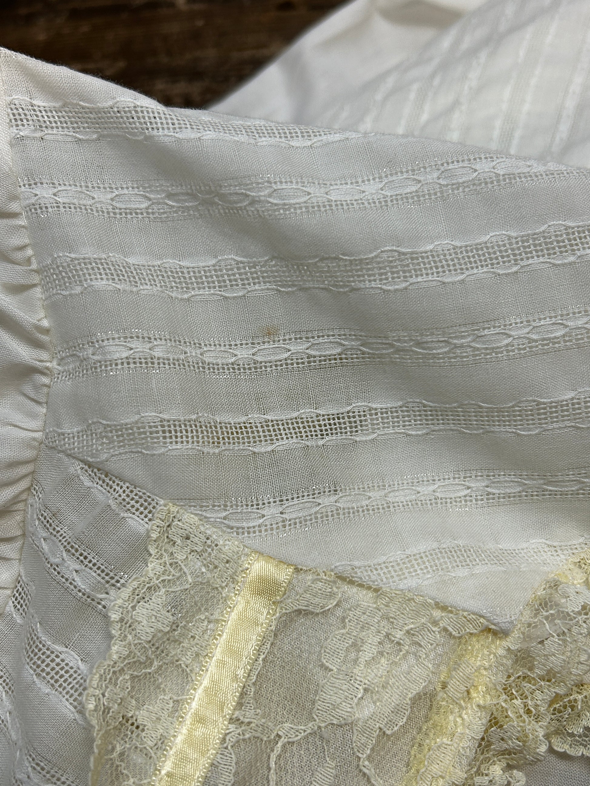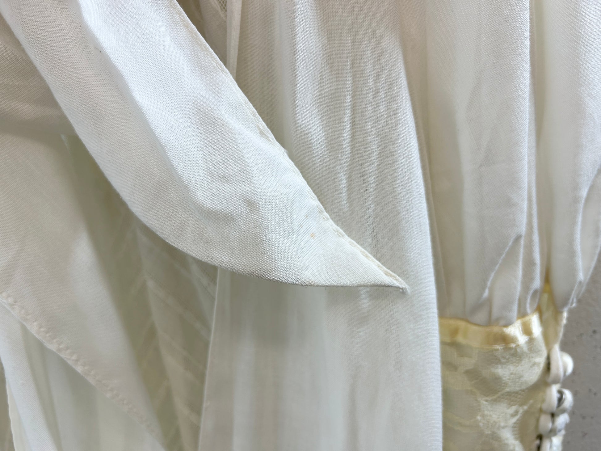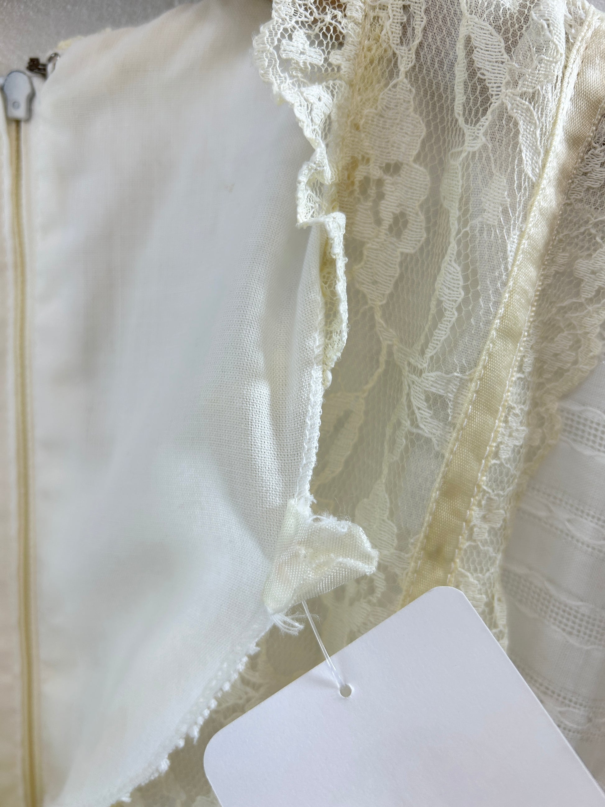 こちらのドレスは、美しいホワイトボディにクリームカラーのレースやサテンテープを贅沢に使用した1着。