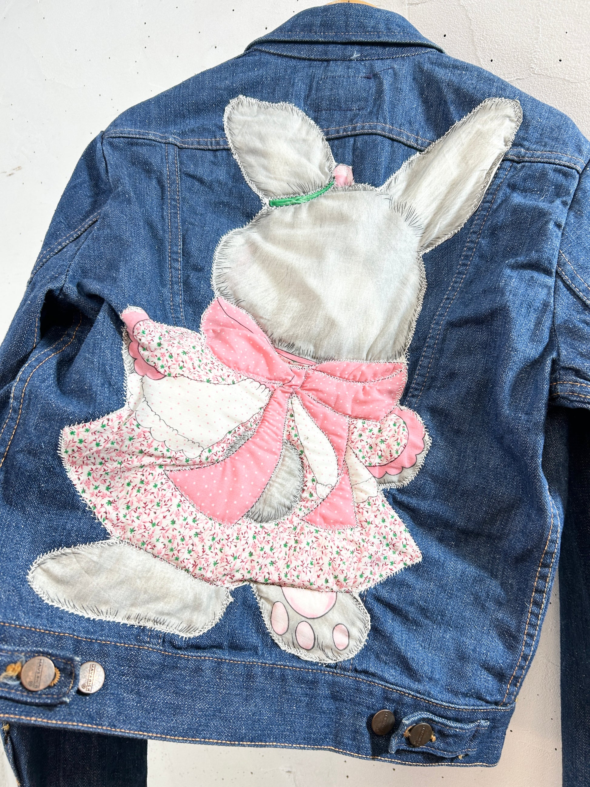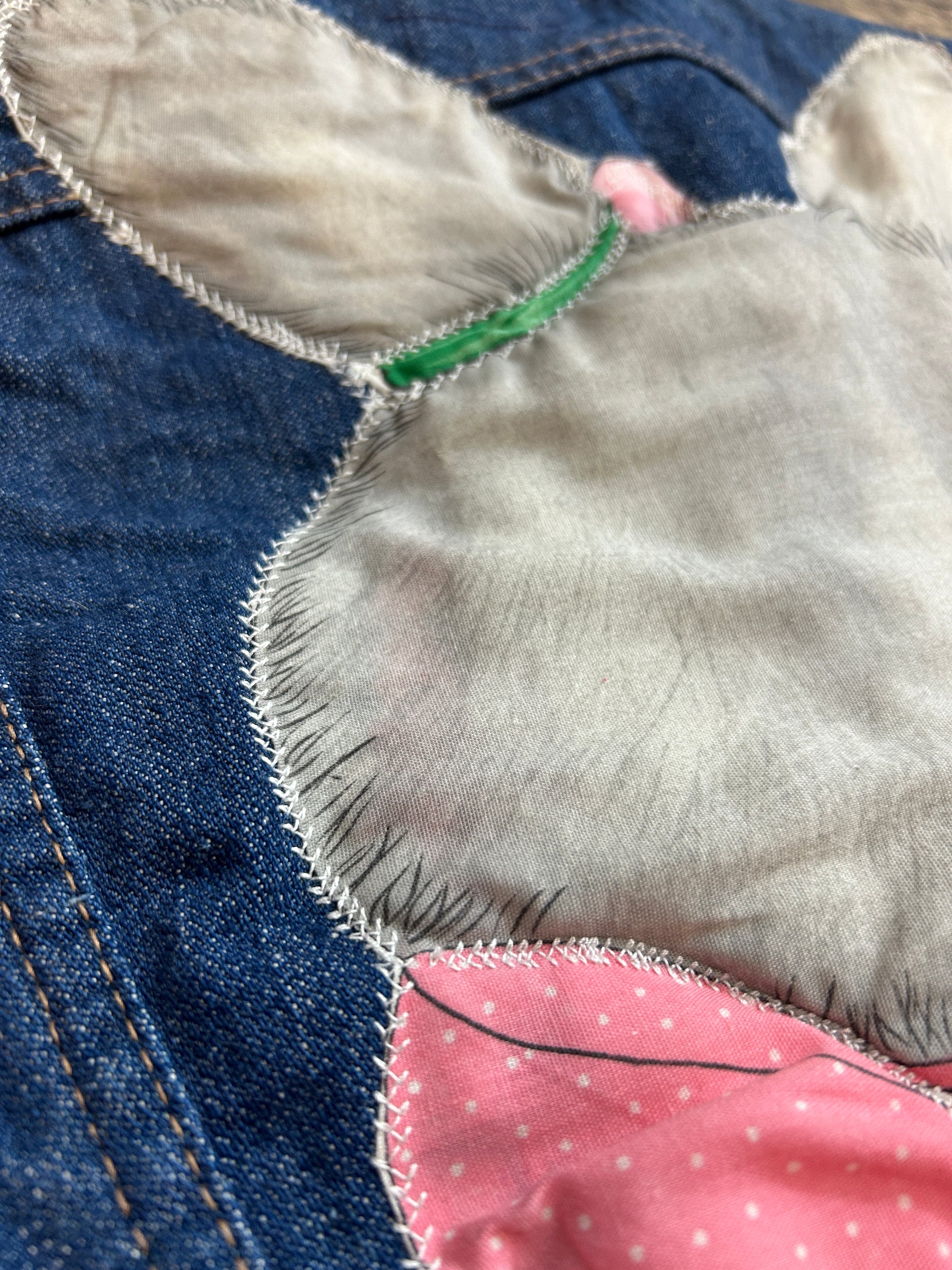 濃紺デニムボディ、フロントはシンプルながらも背中に大胆なうさぎのパッチが可愛いカスタムアイテム。