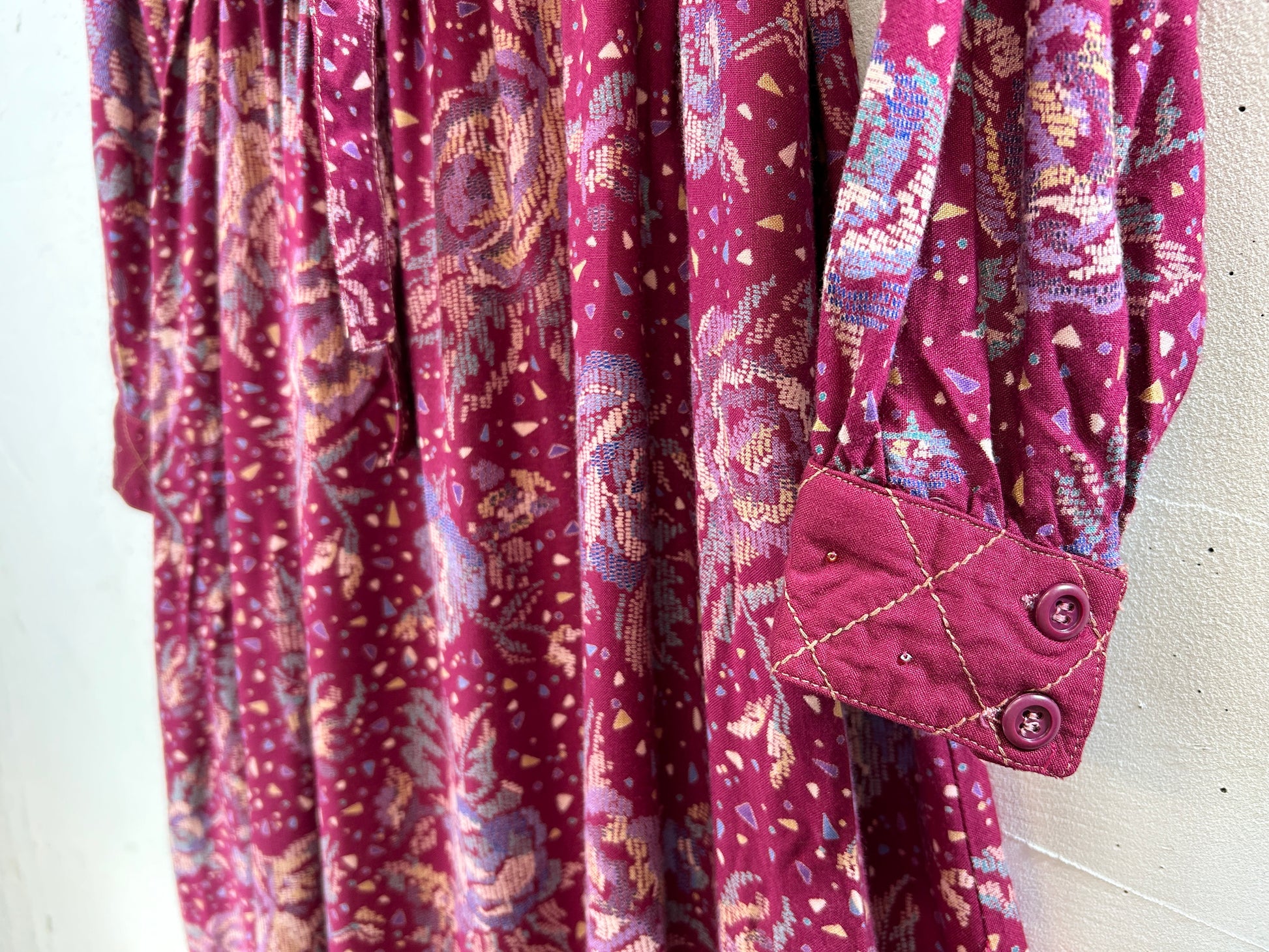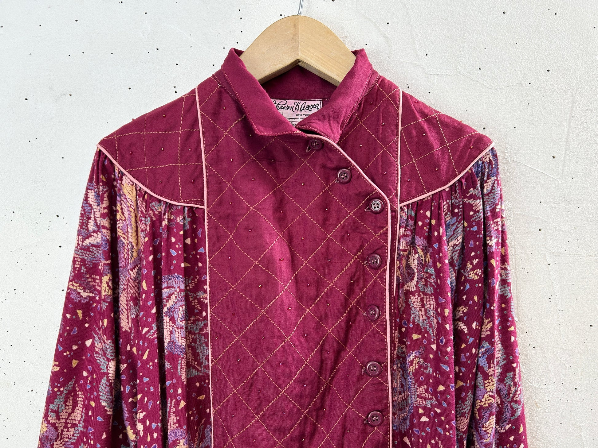 ボルドーボディ、幾何学なフラワープリント、胸のパイピング切り替えにはビーズが施されて非常に手の込んだ丁寧な1着。