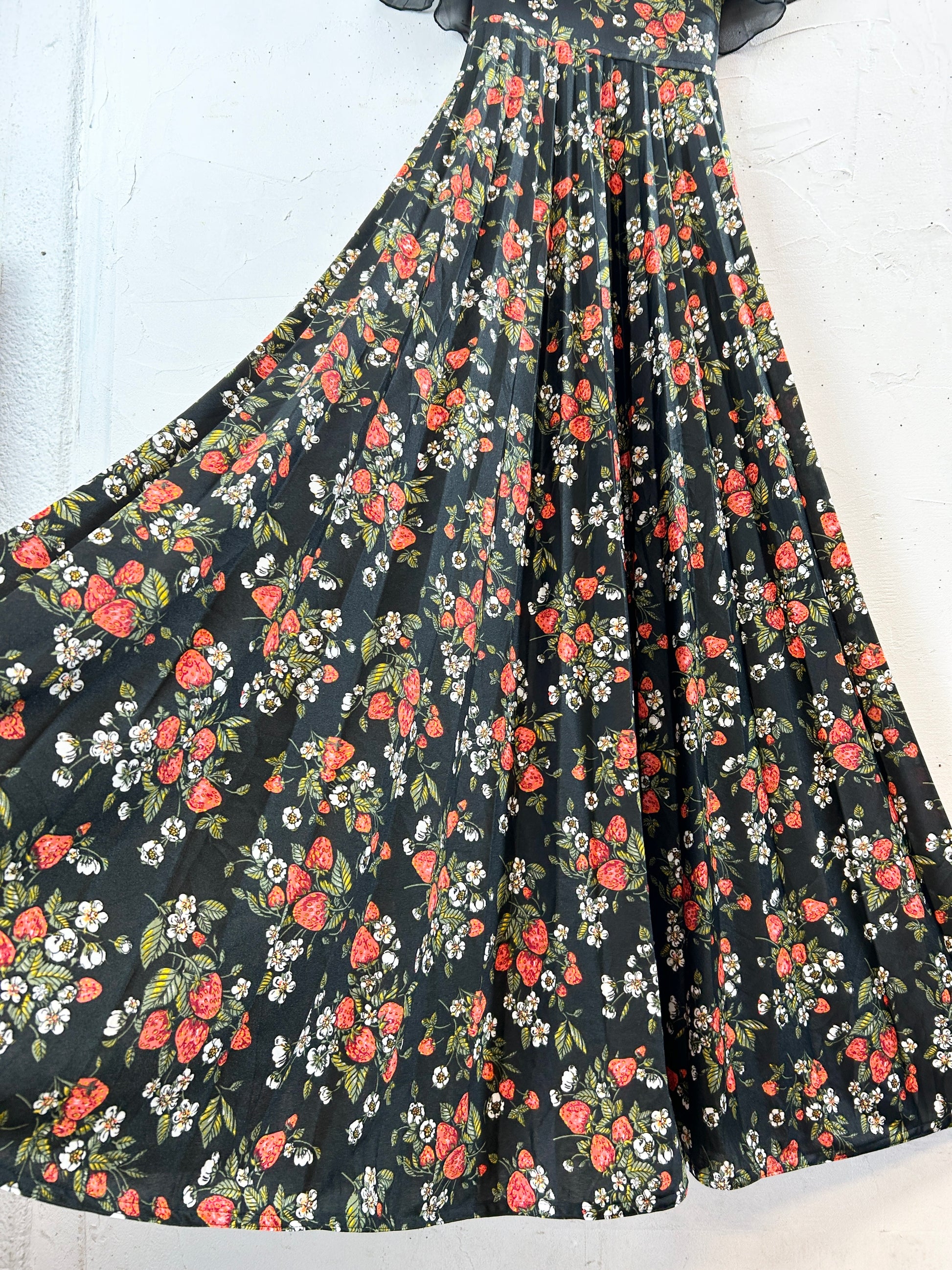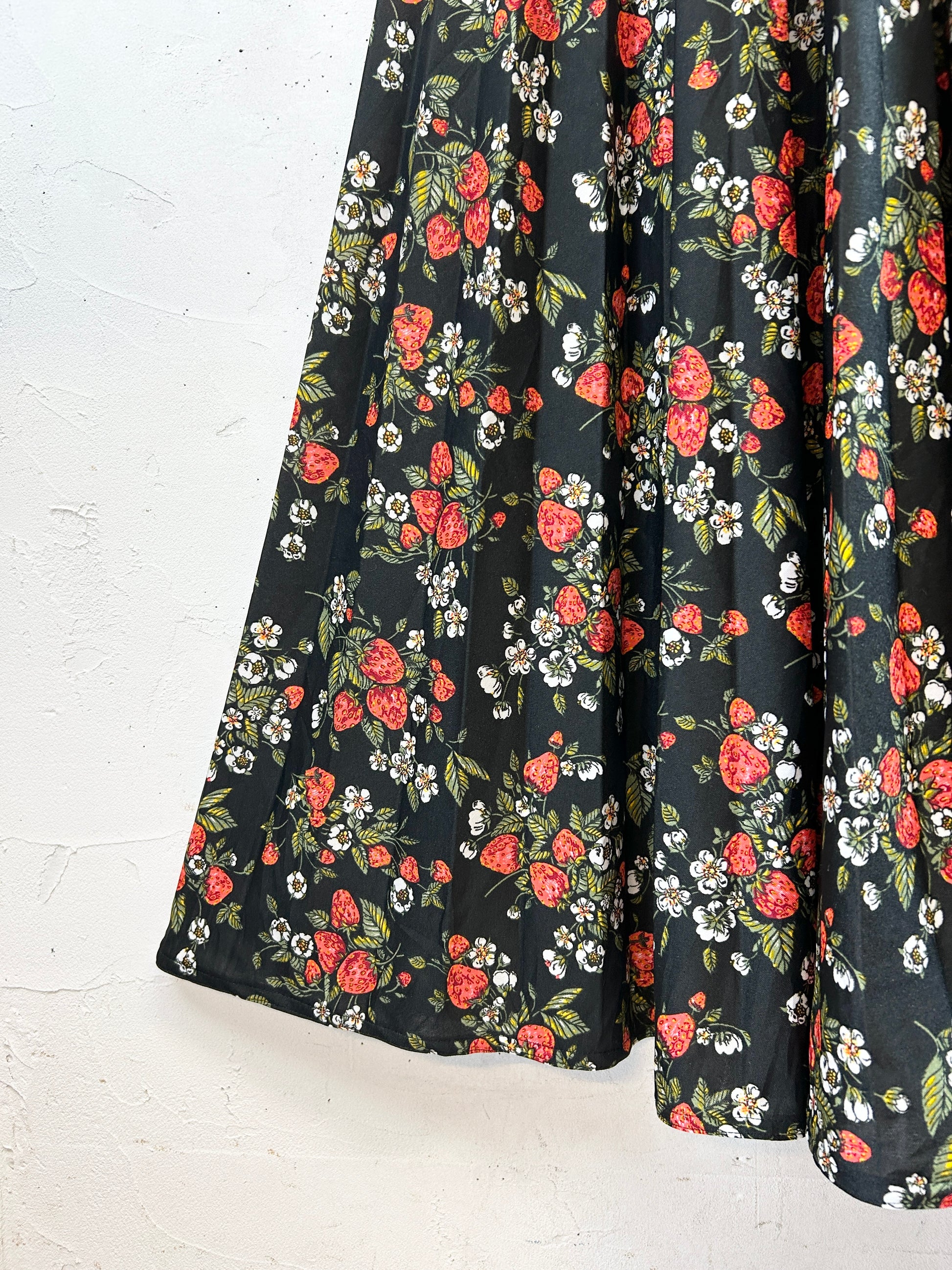 黒ボディにイチゴプリントの可愛らしいファブリックが用いられた1着。