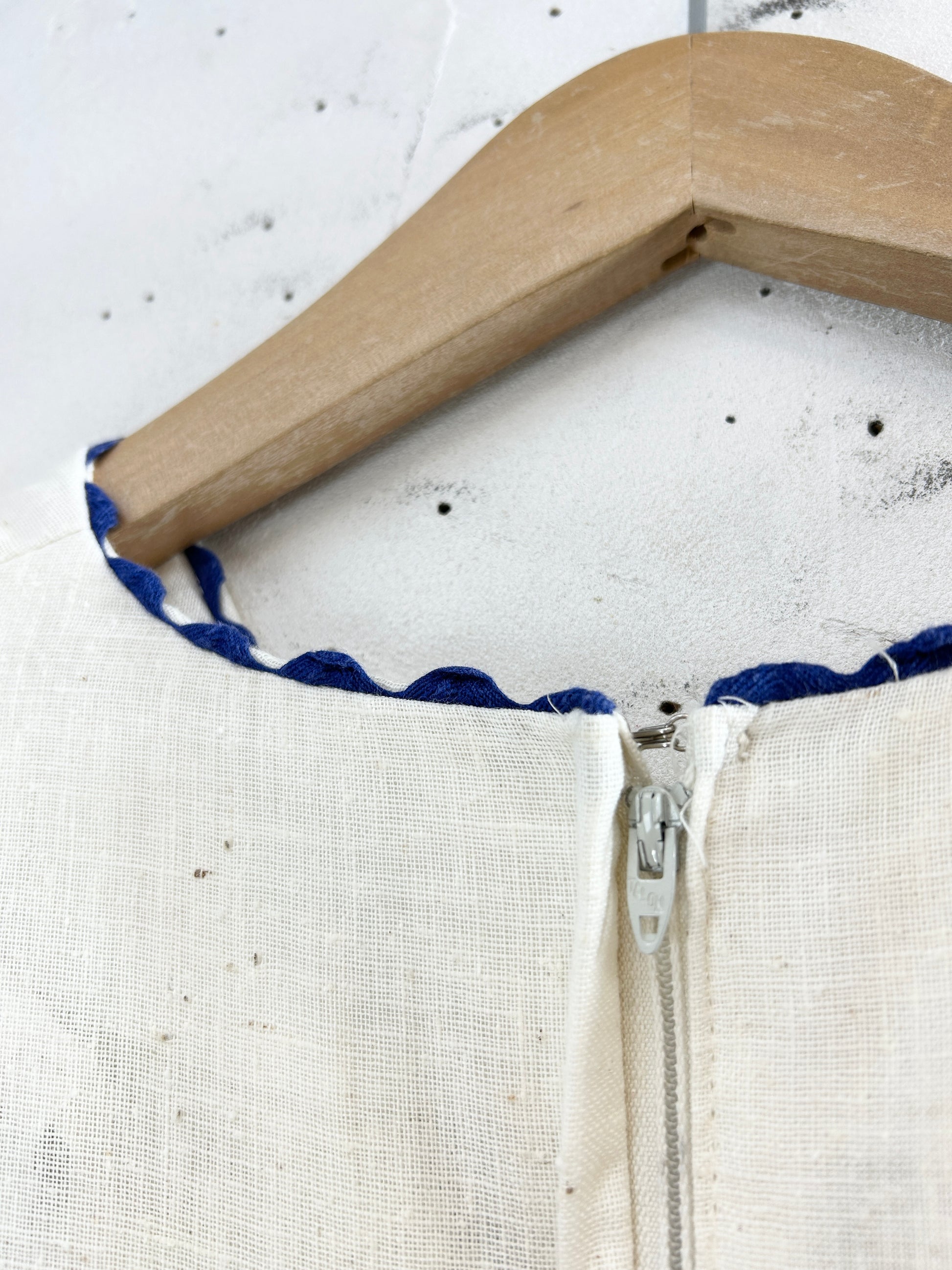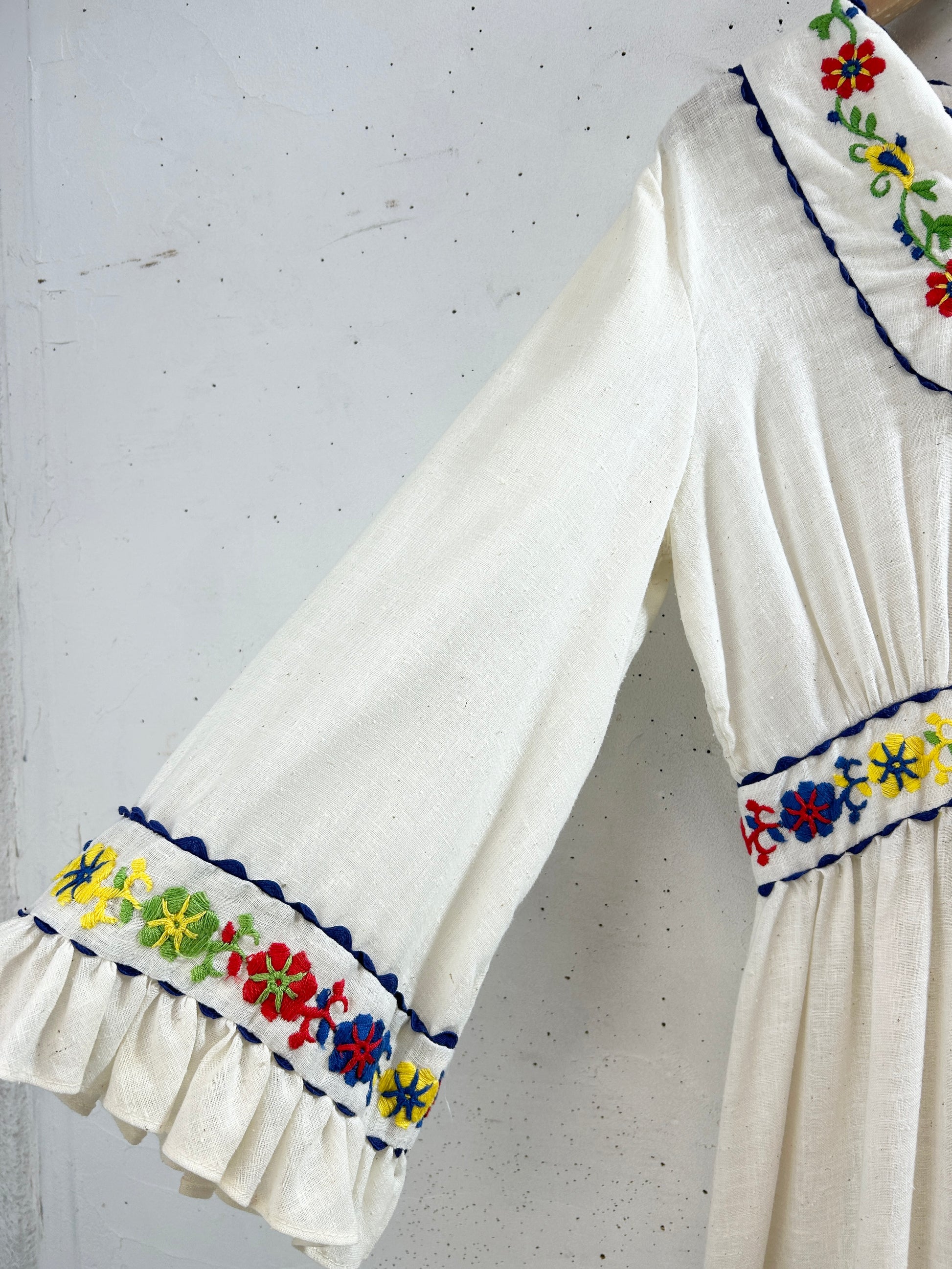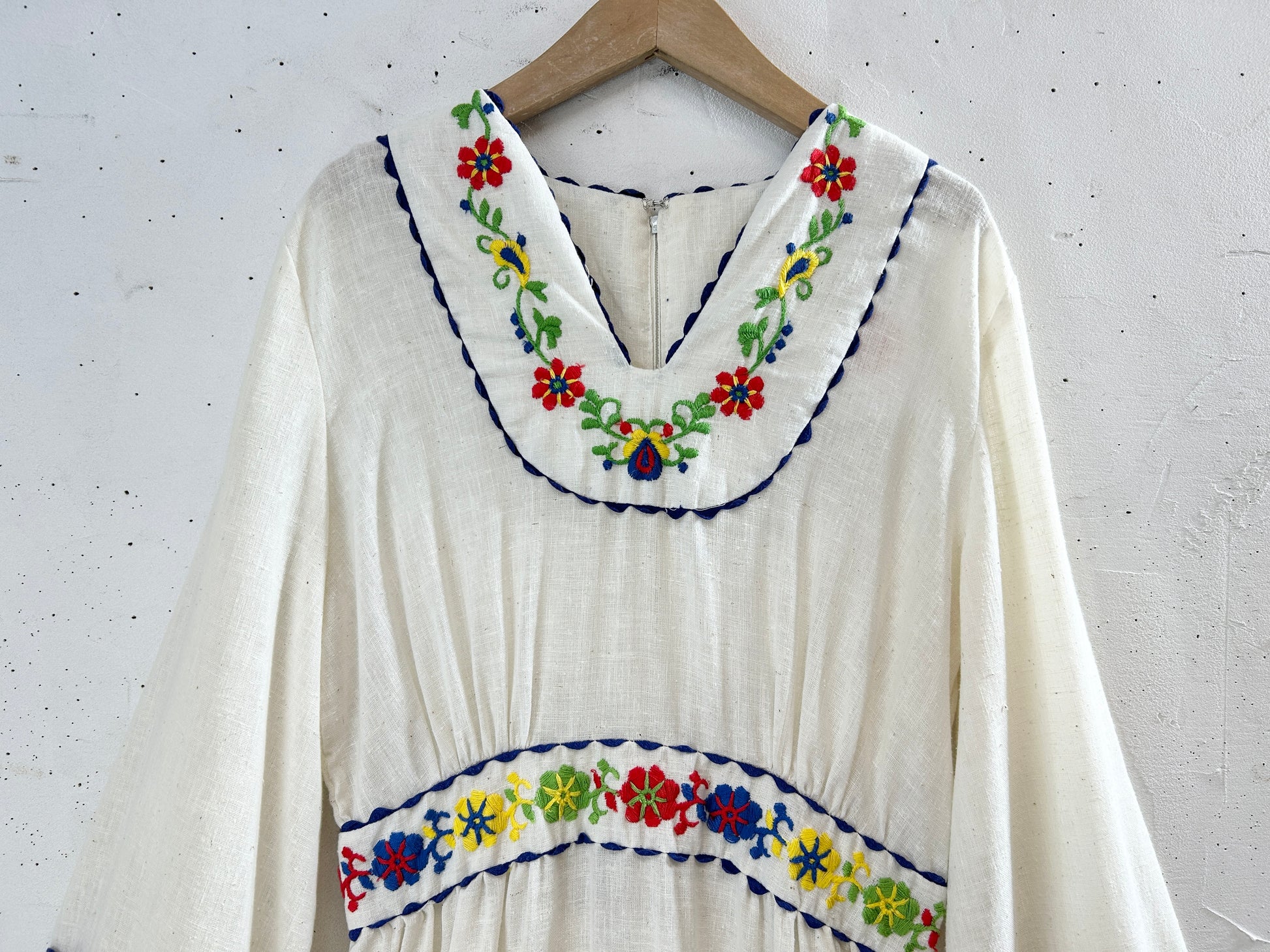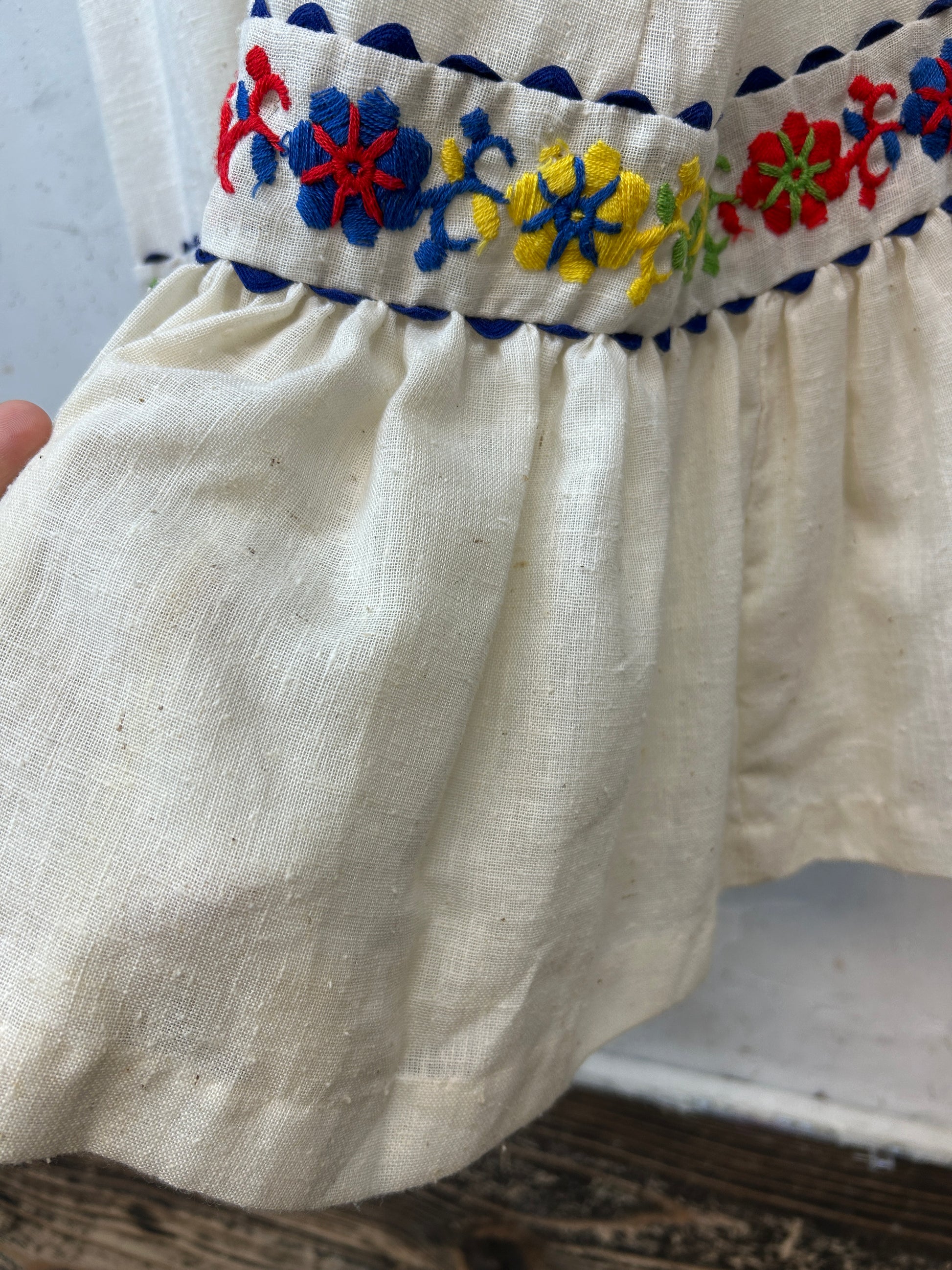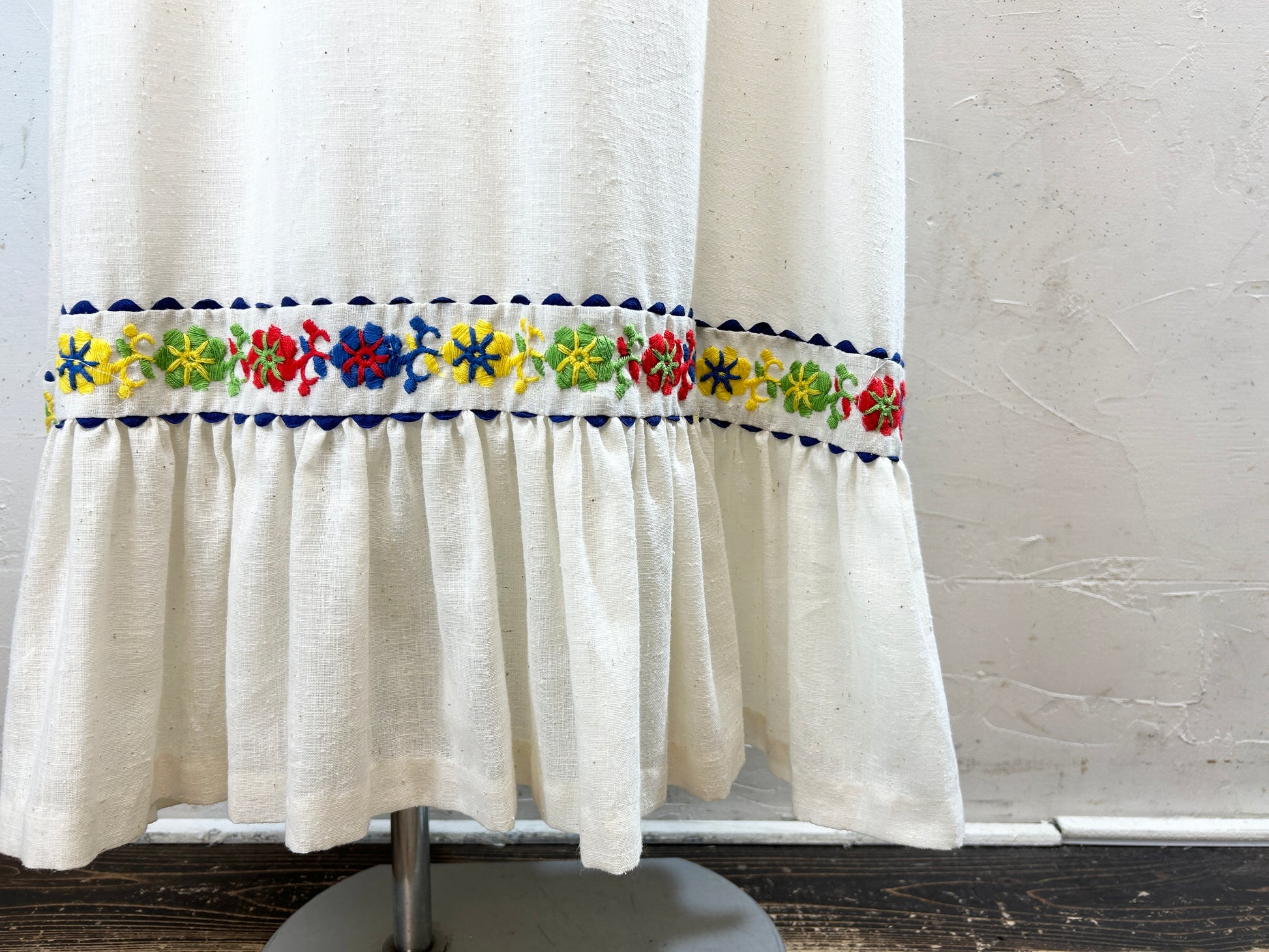 オフホワイトの粗いナチュラルな生地に山道テープがフォークロアな1着です。
