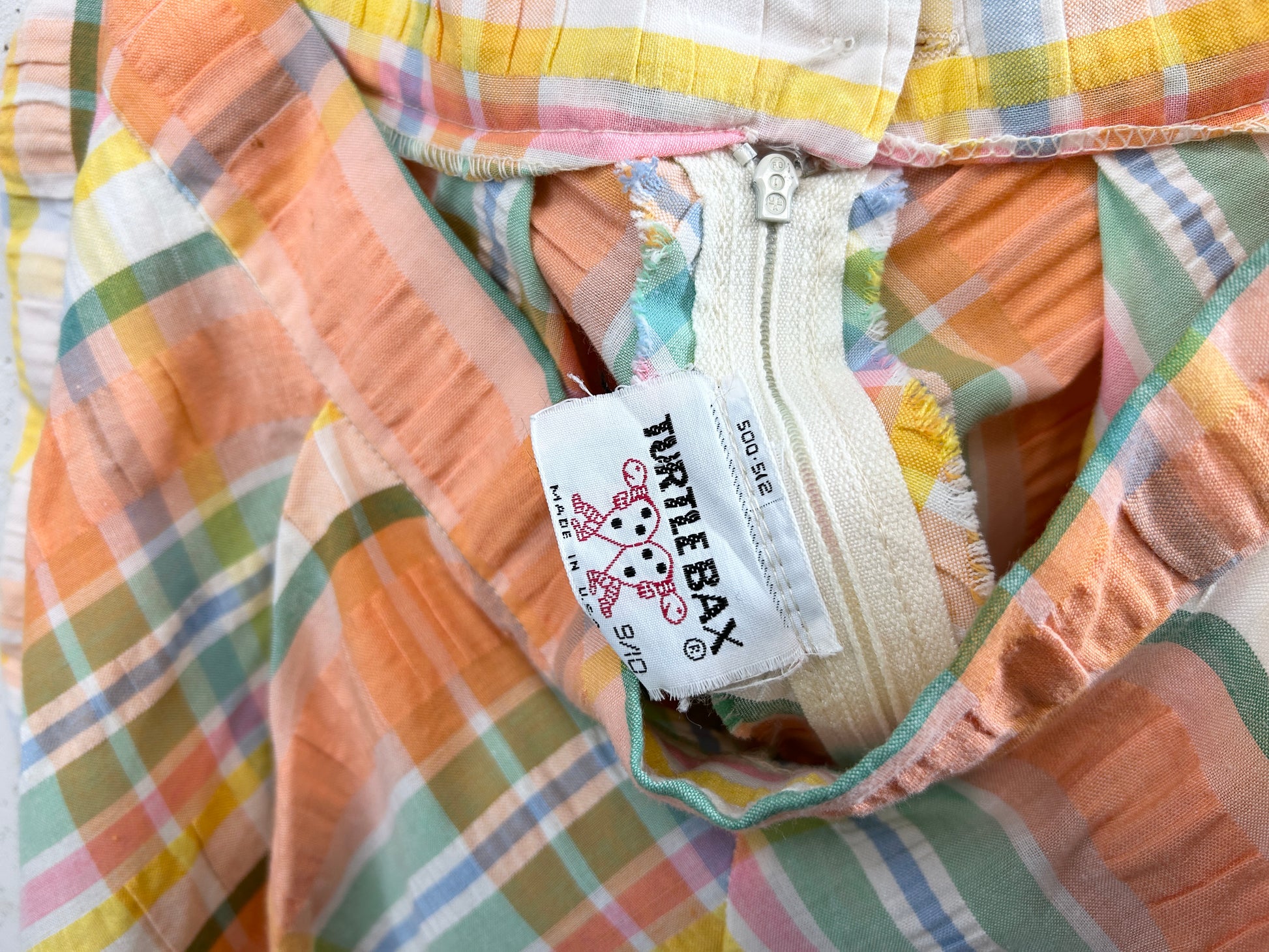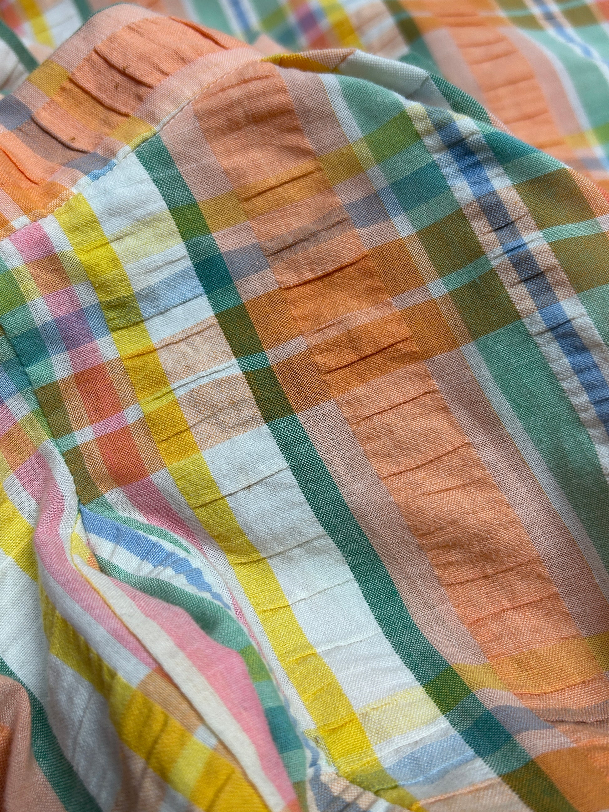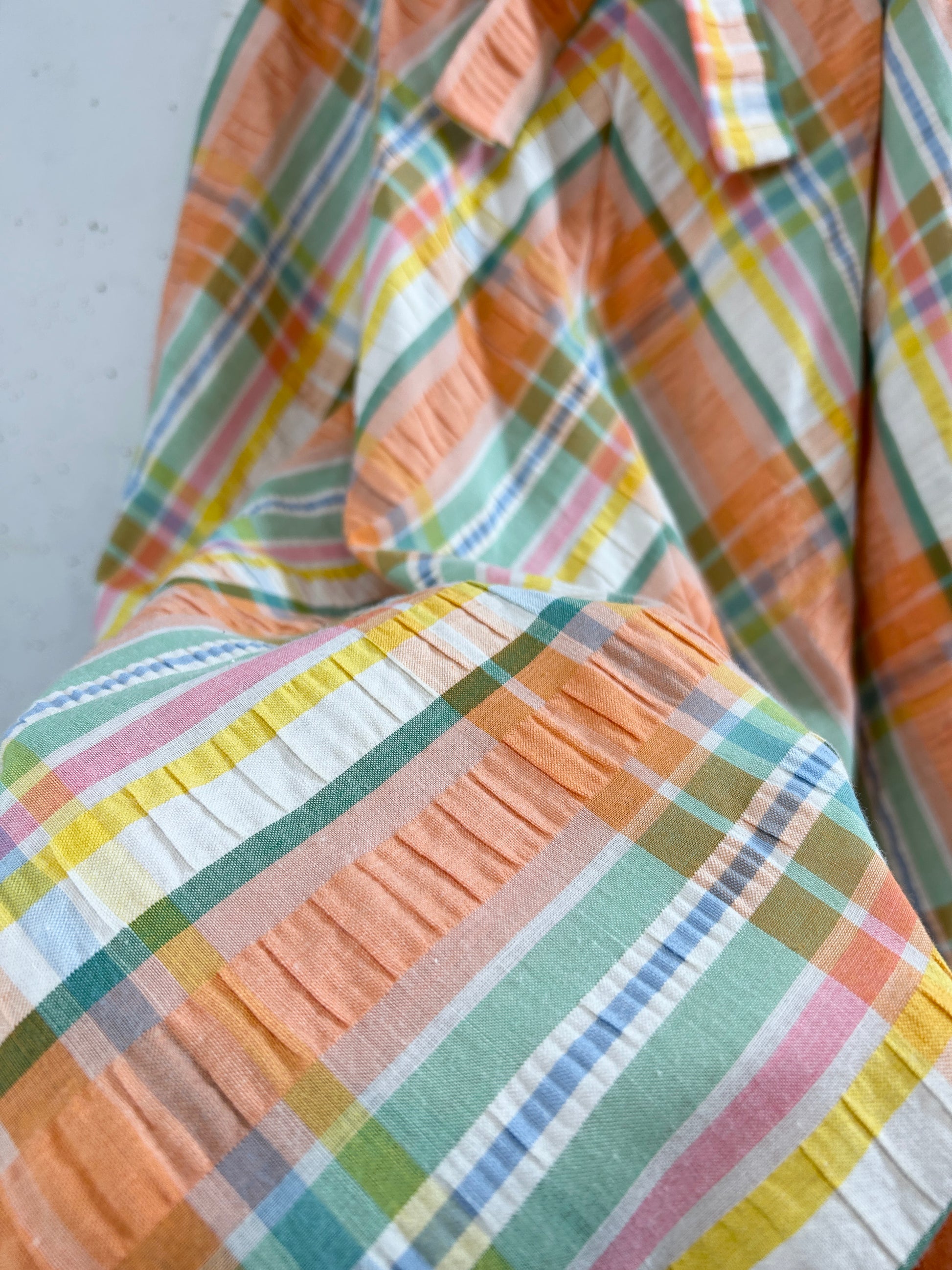 明るいカラーリングのマドラスチェックが鮮やかで目を引くアイテム。