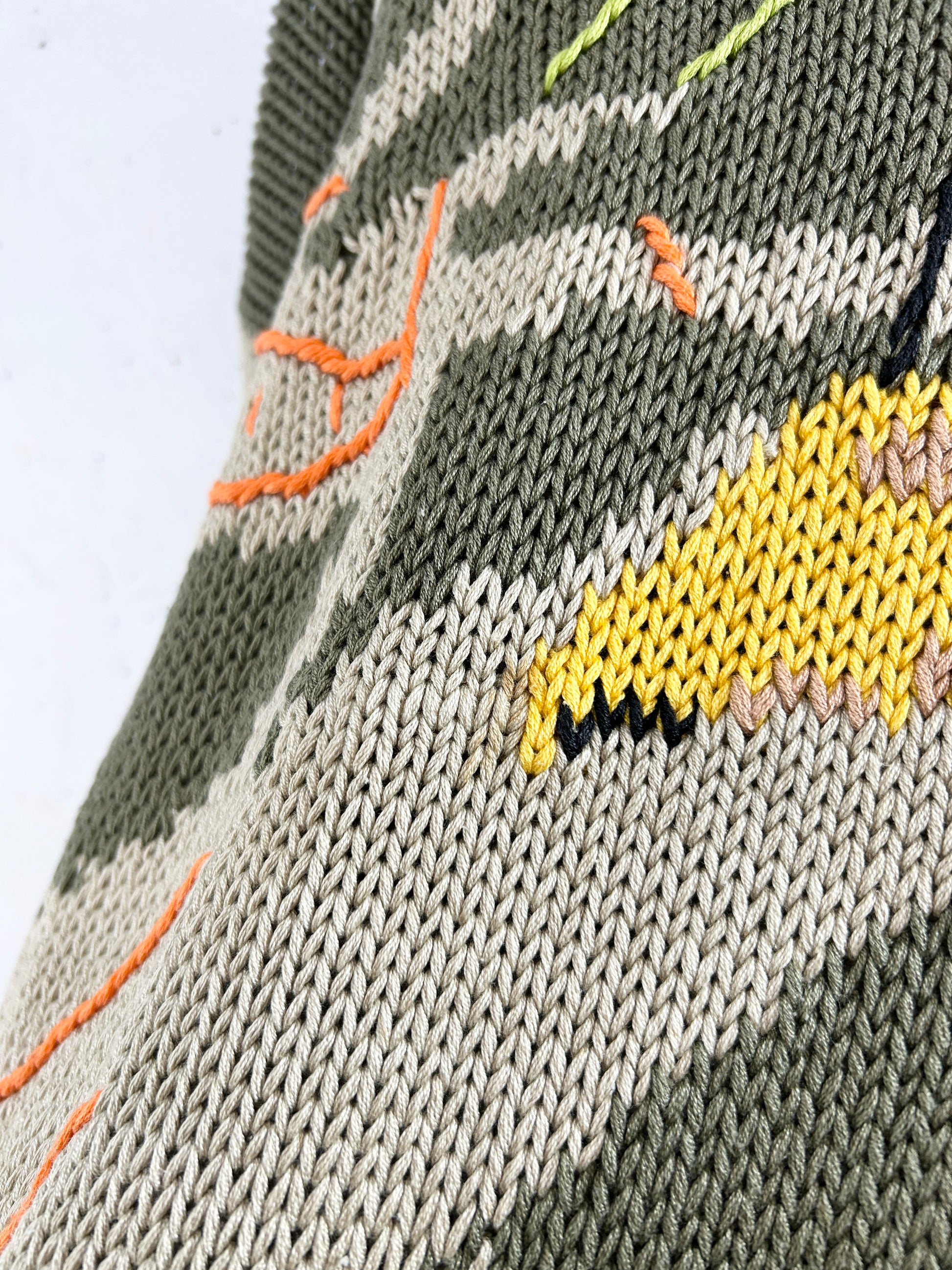 渋いボディカラーに鳥が映え、オレンジと黄緑のステッチも印象的です。