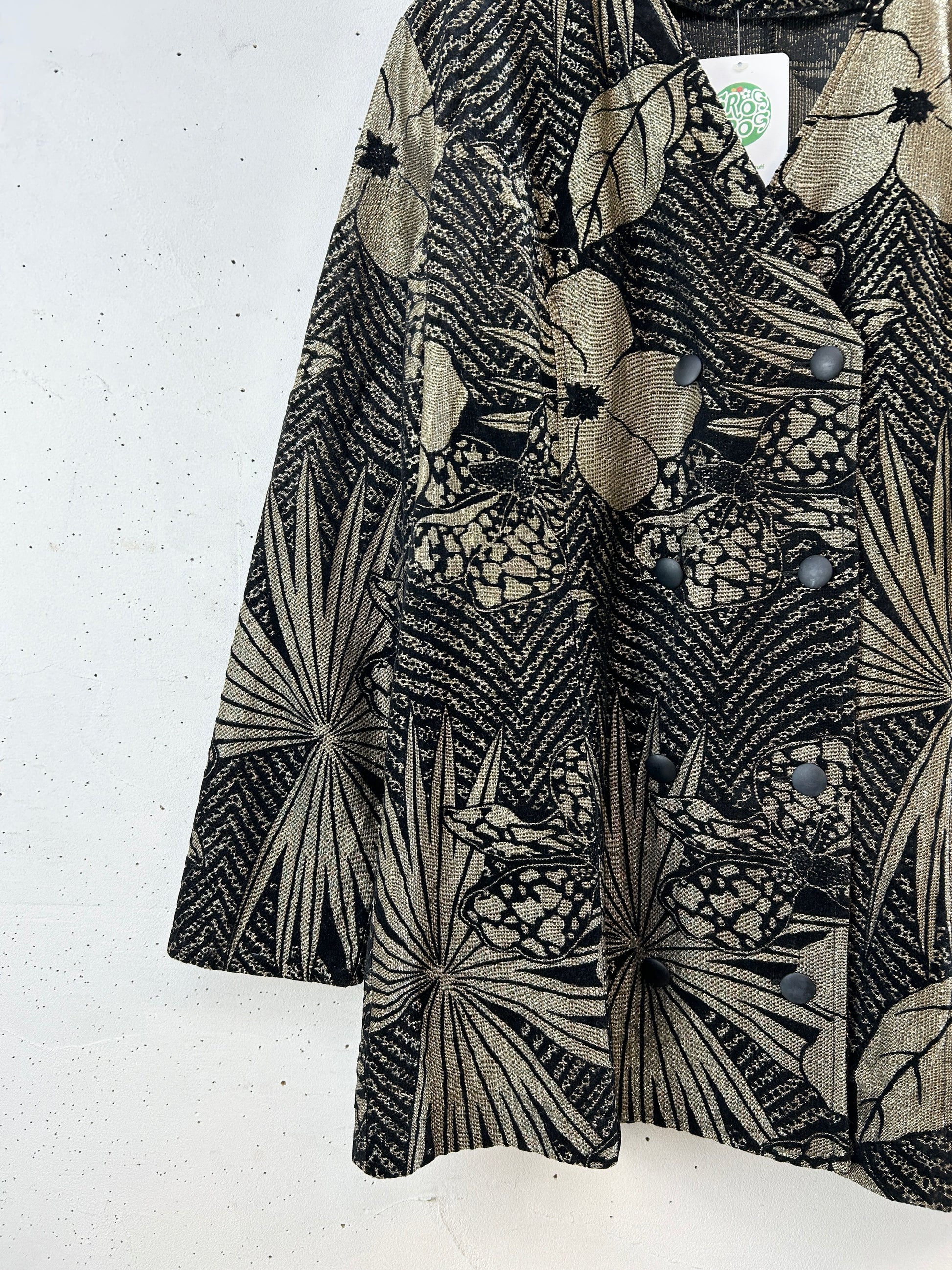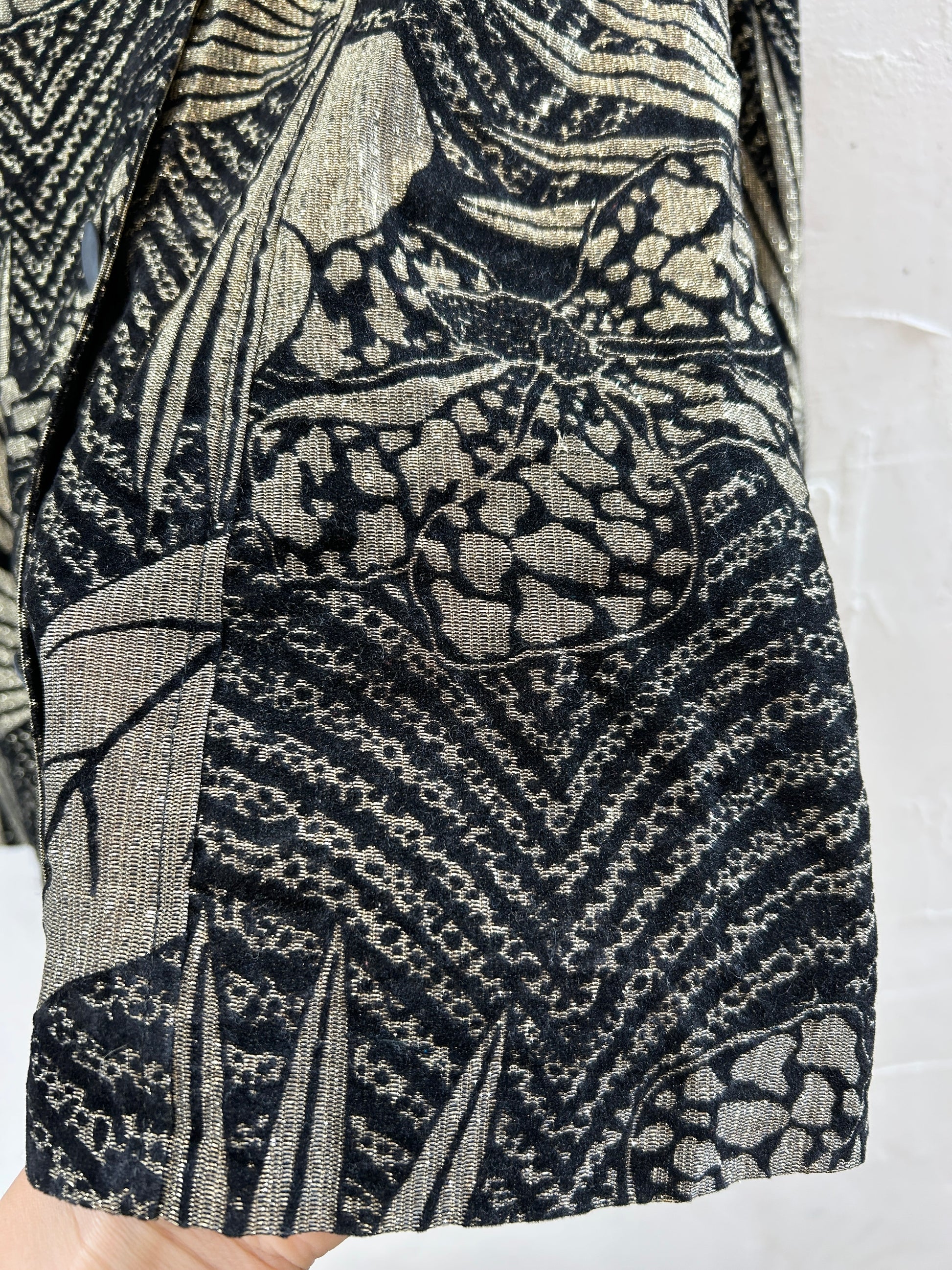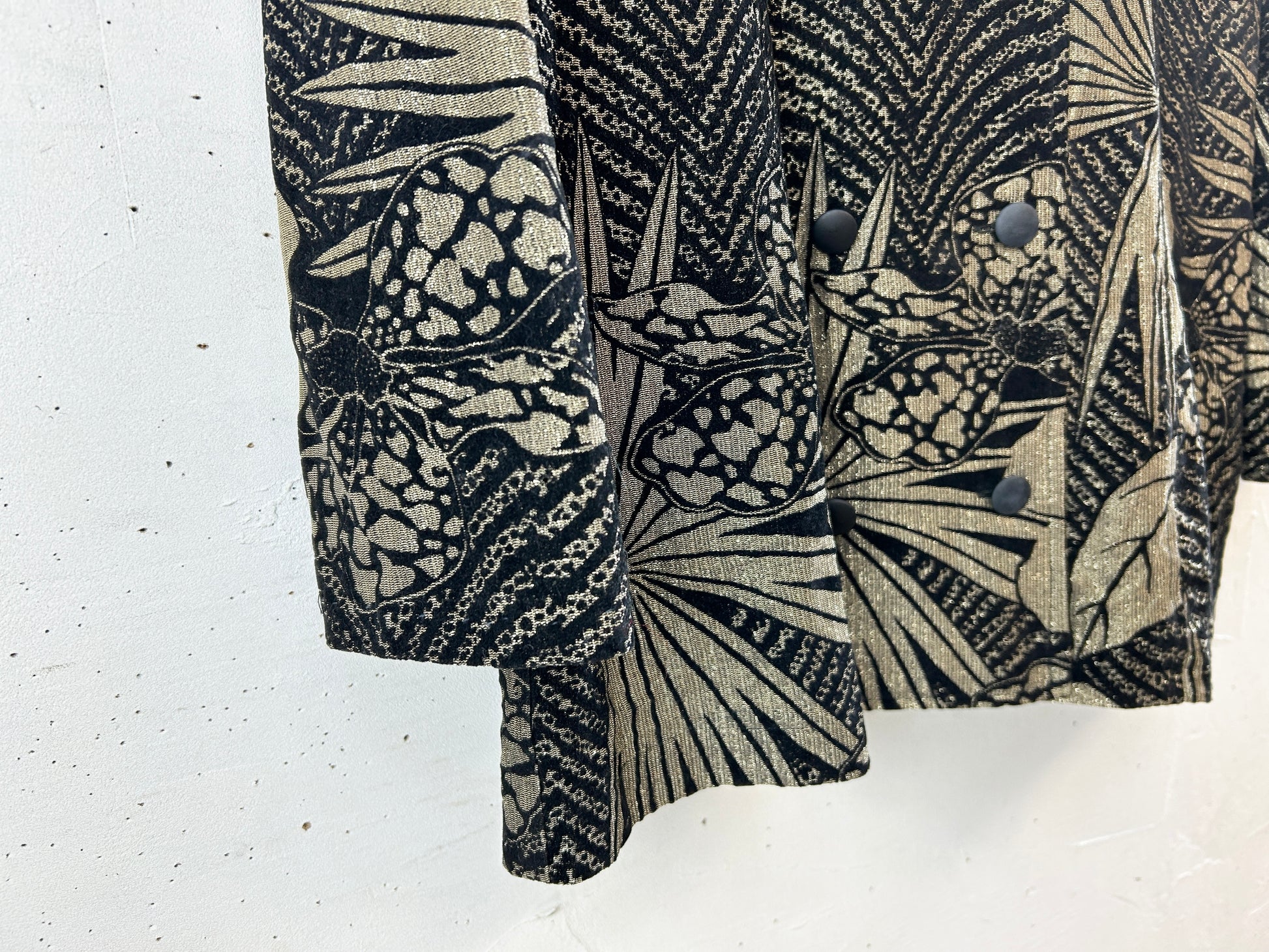 ノーカラー、フロントダブルボタンでゴールドラメとベロアの様な質感のコンビネーションがゴージャスな1着。