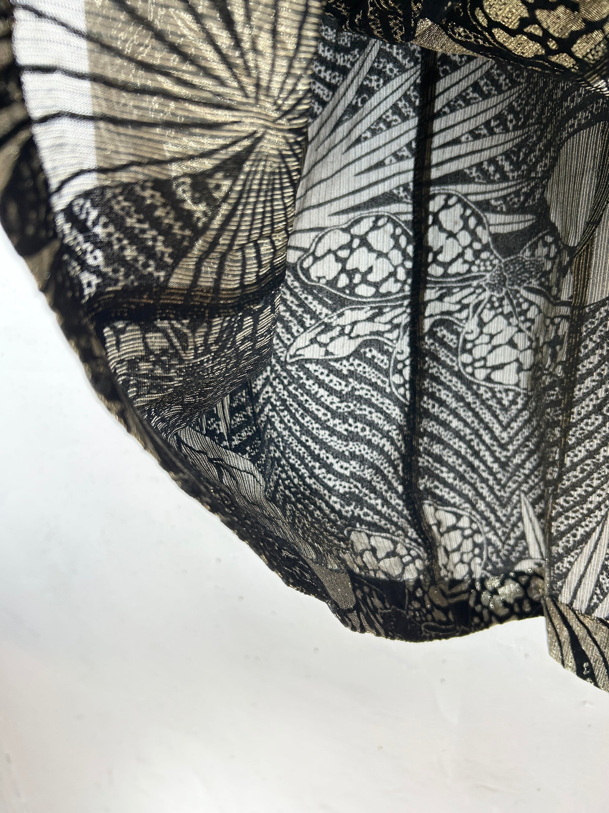 起毛感ある質感と、ゴールドラメのメタリックな相反する素材感が面白くUS古着らしいアイテムです。