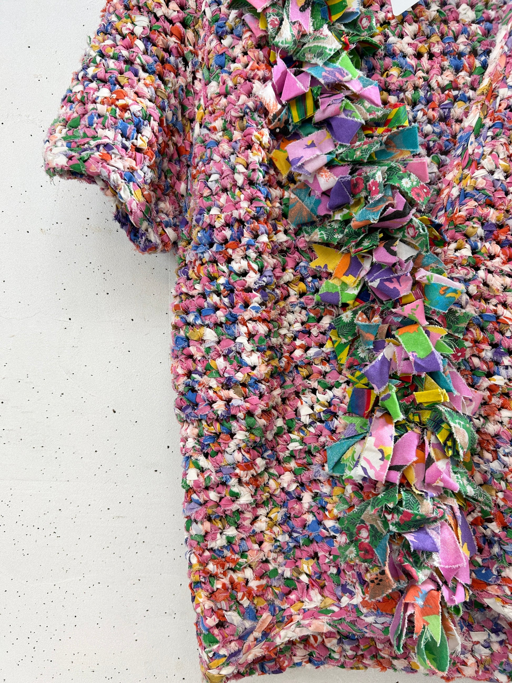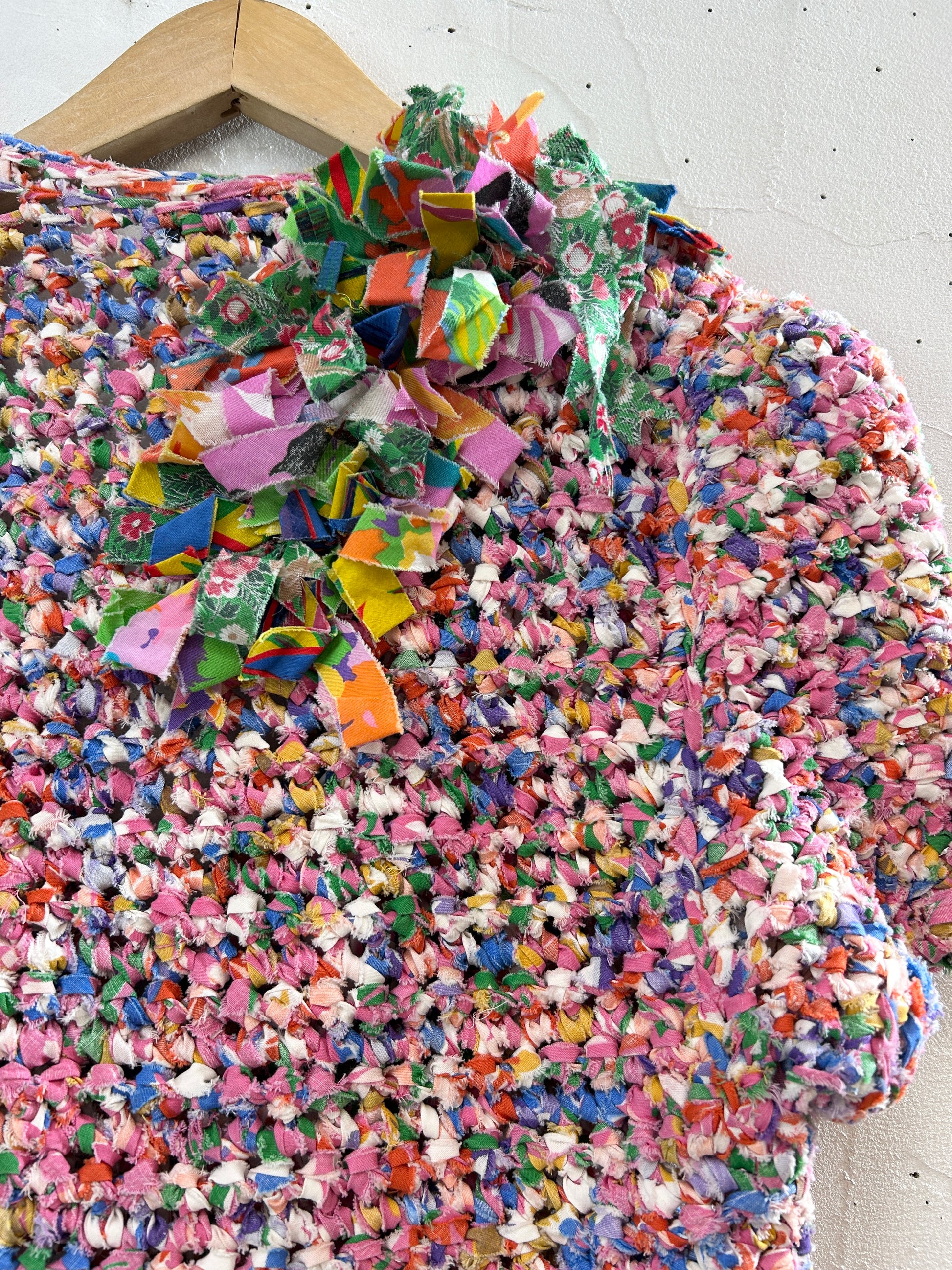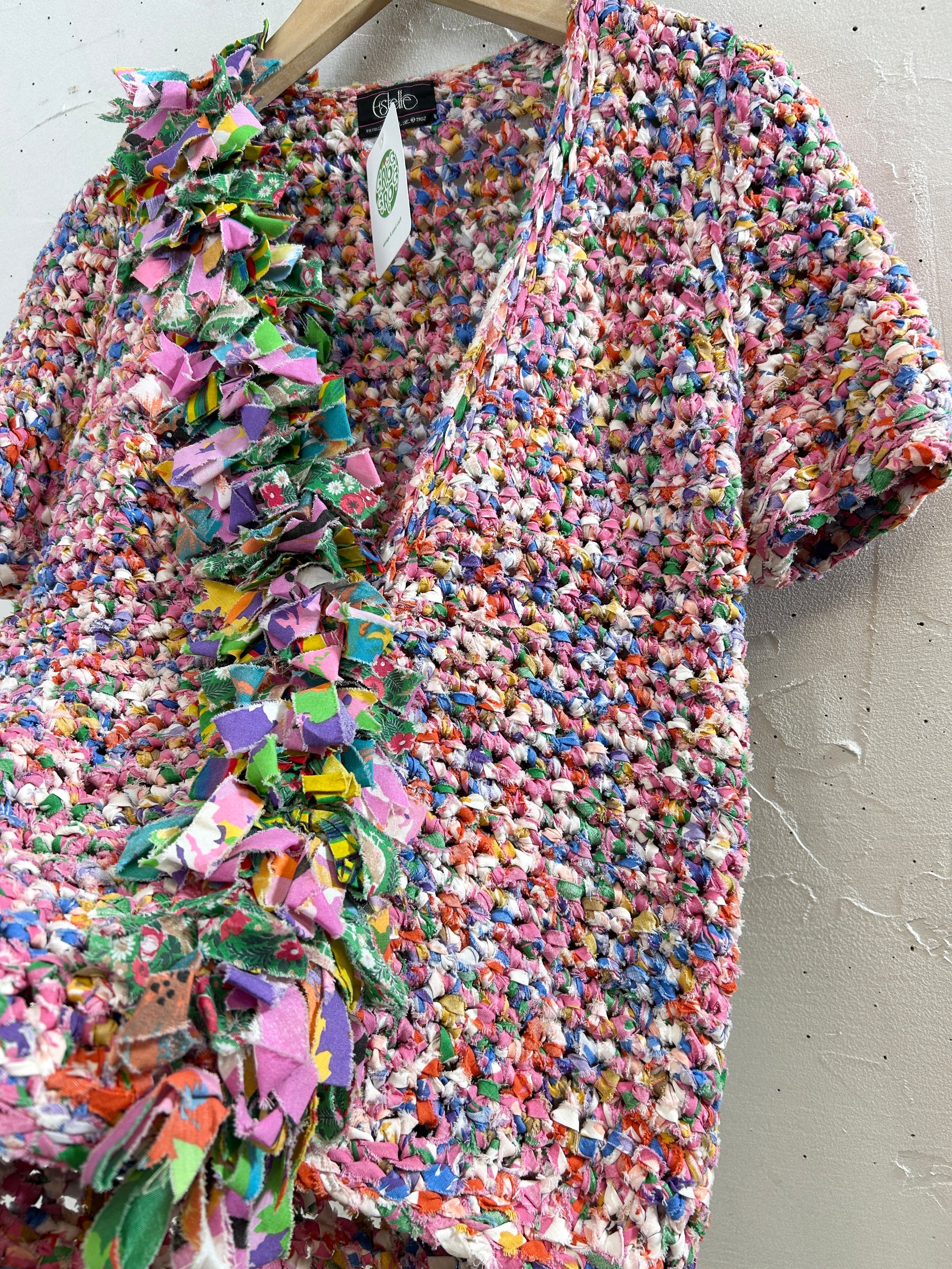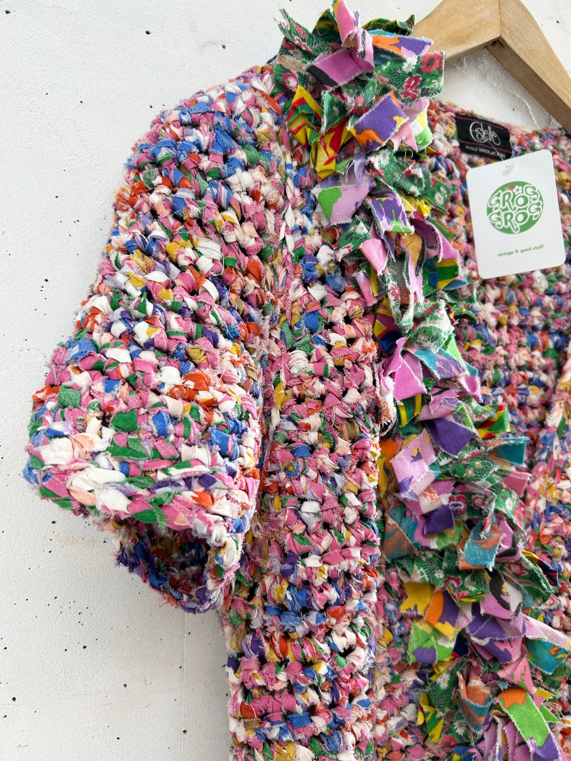 カラフルな裂き布が編まれた素敵なカーディガン。