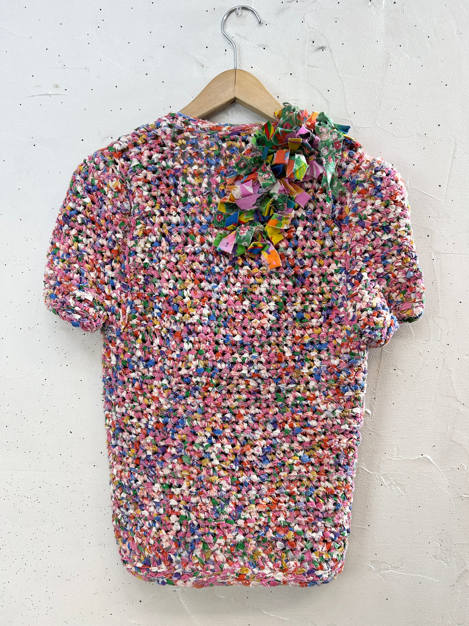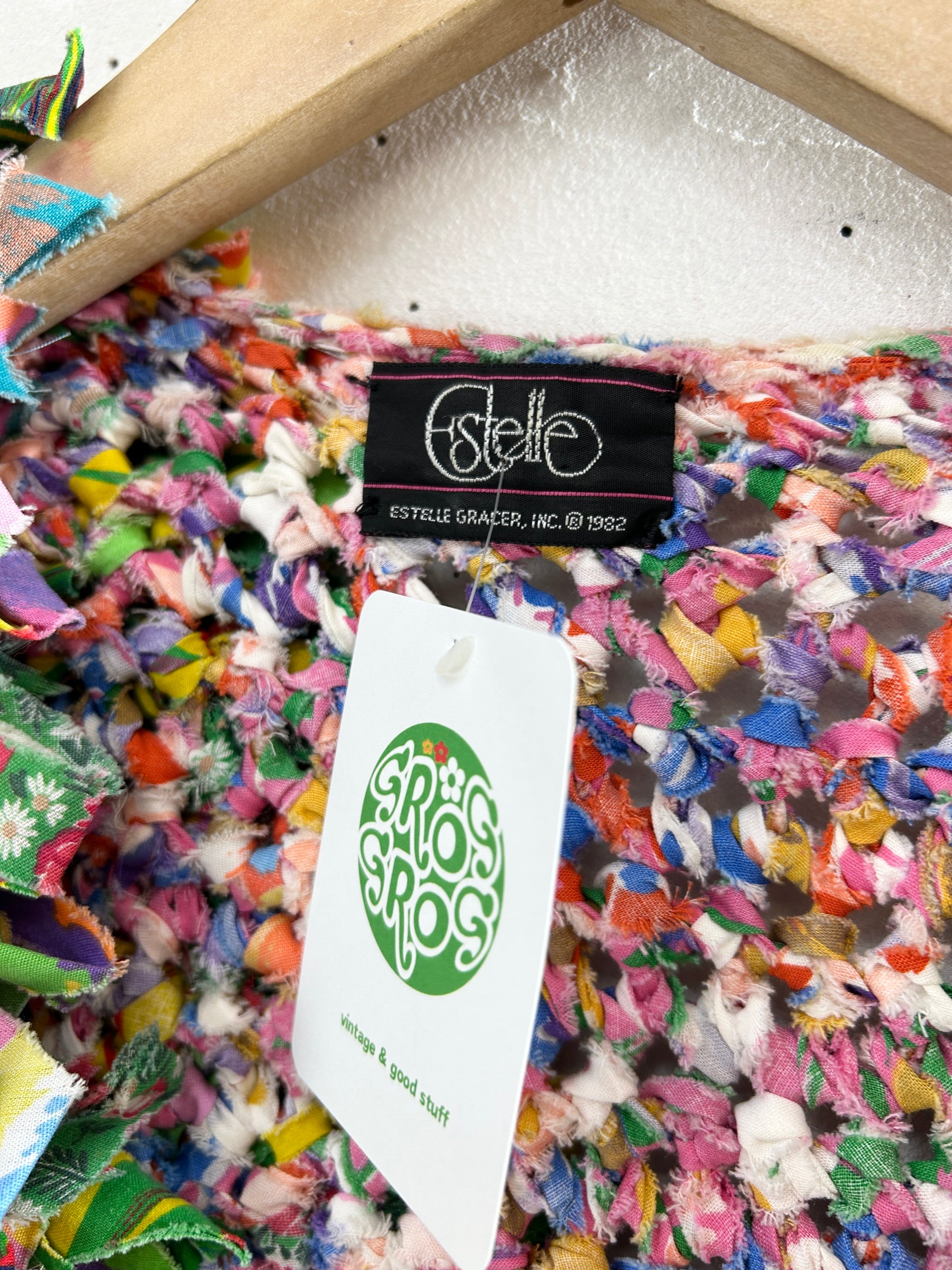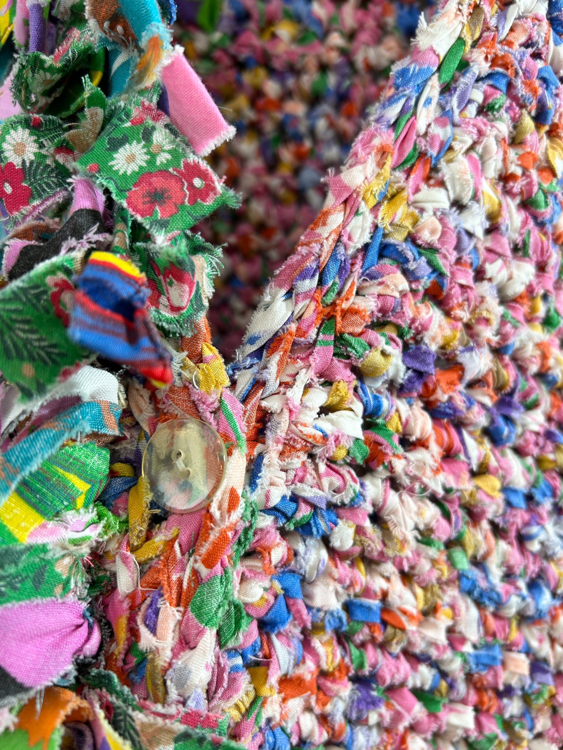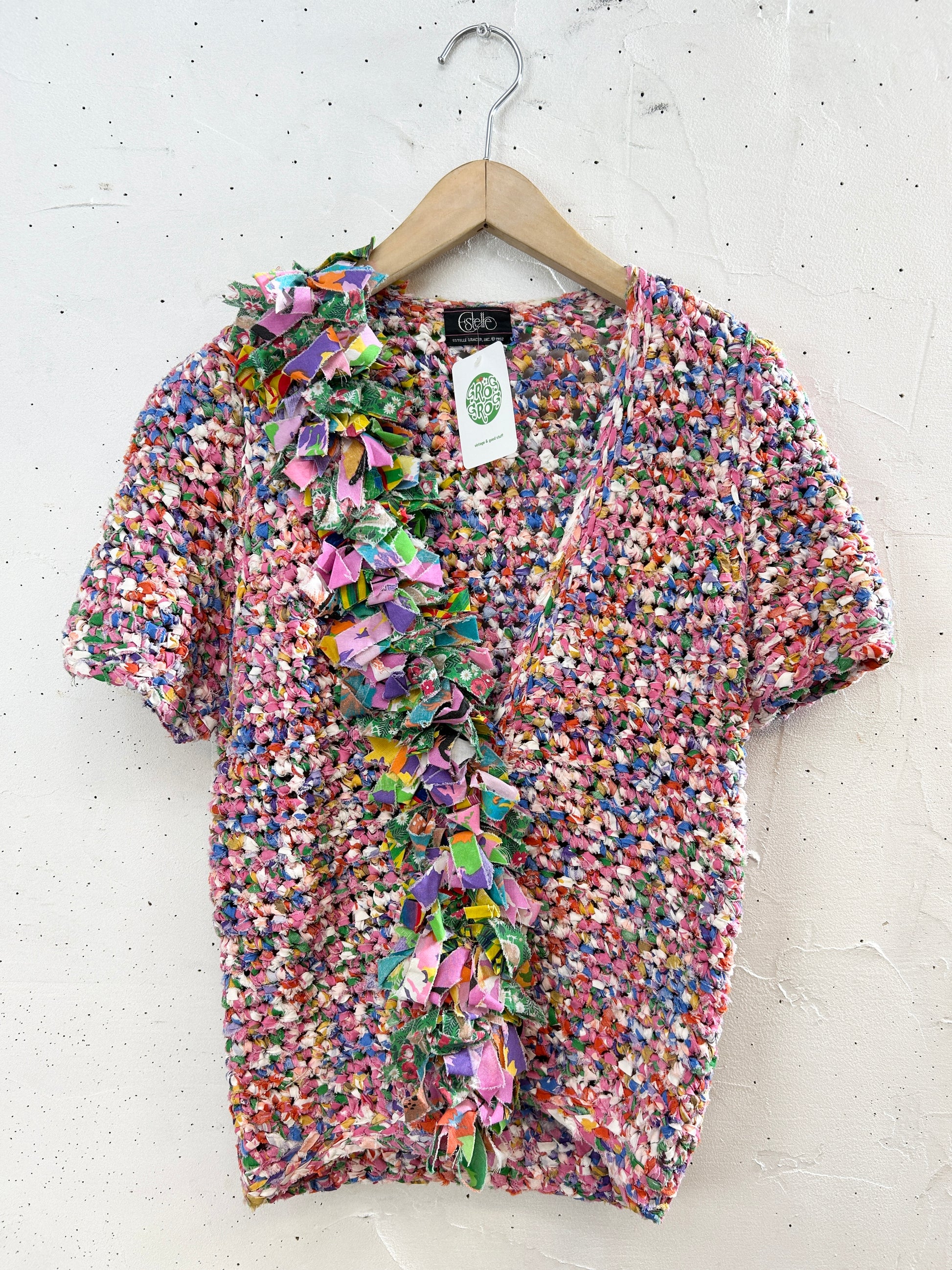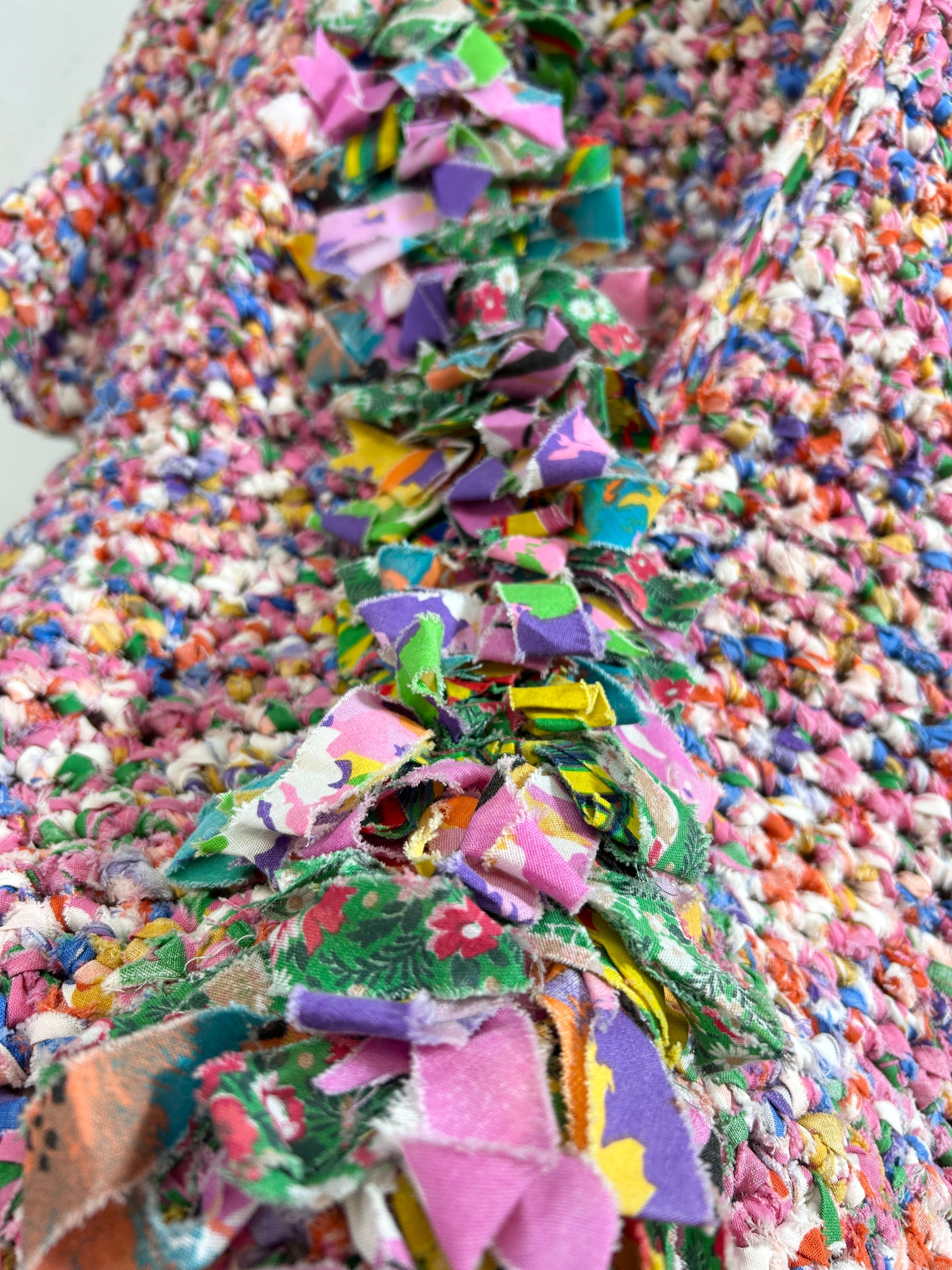カラフルな裂き布が編まれた素敵なカーディガン。