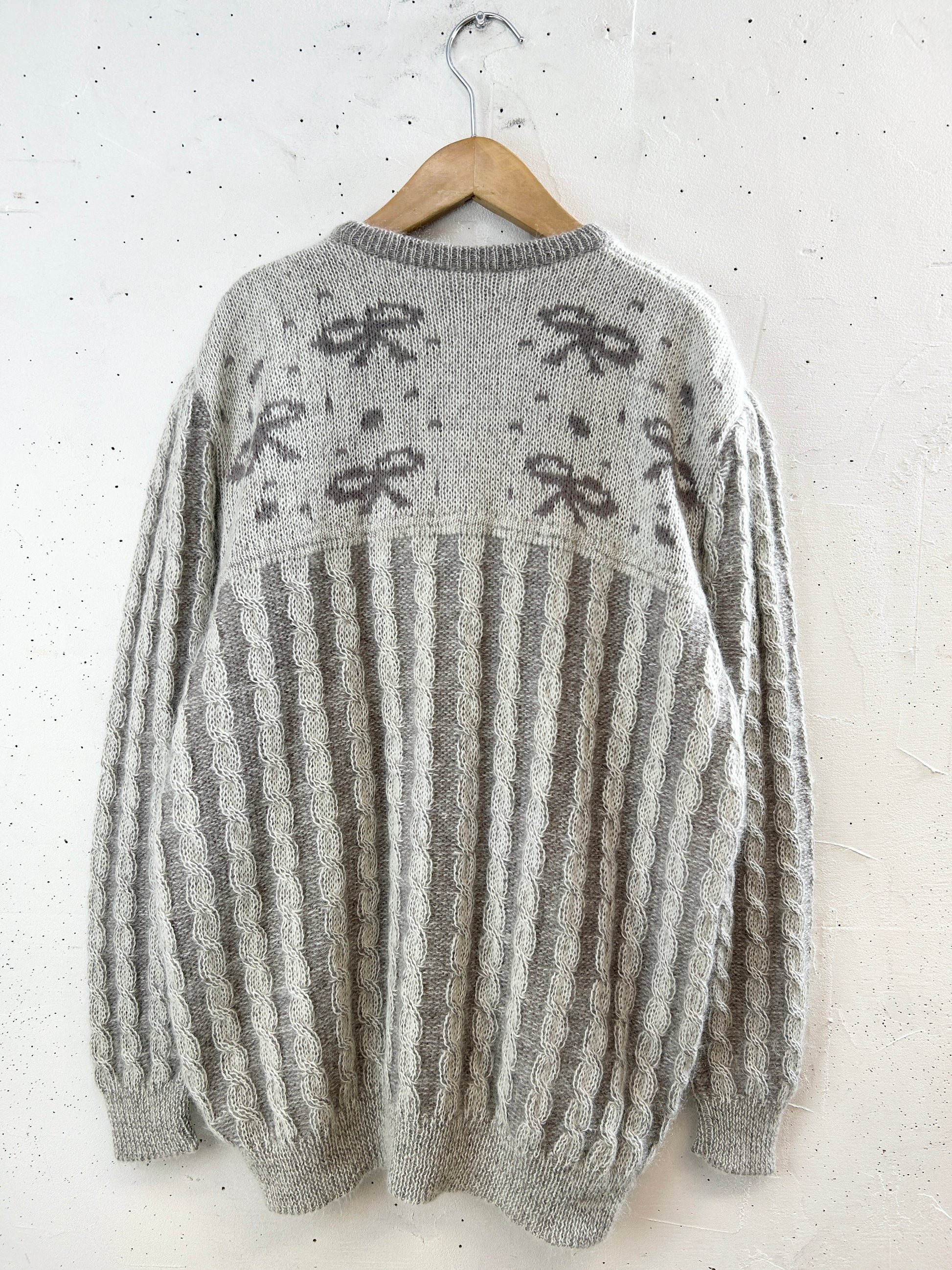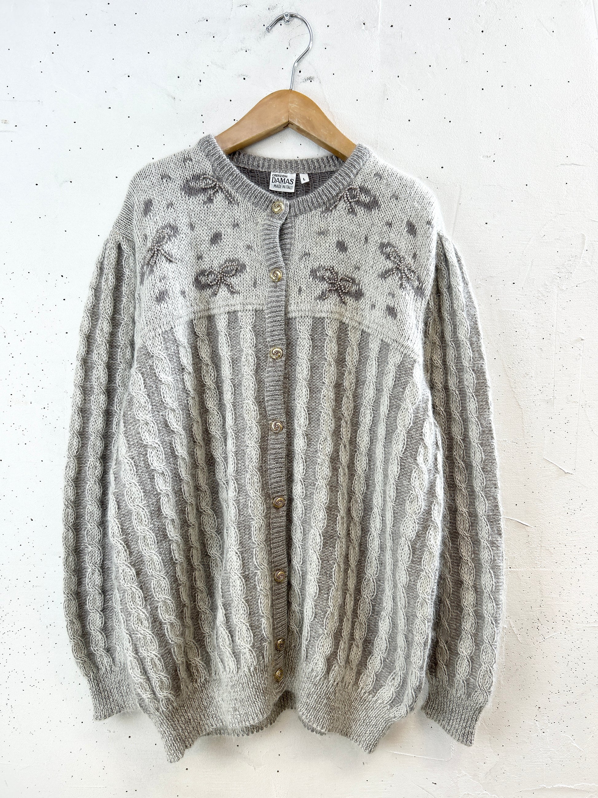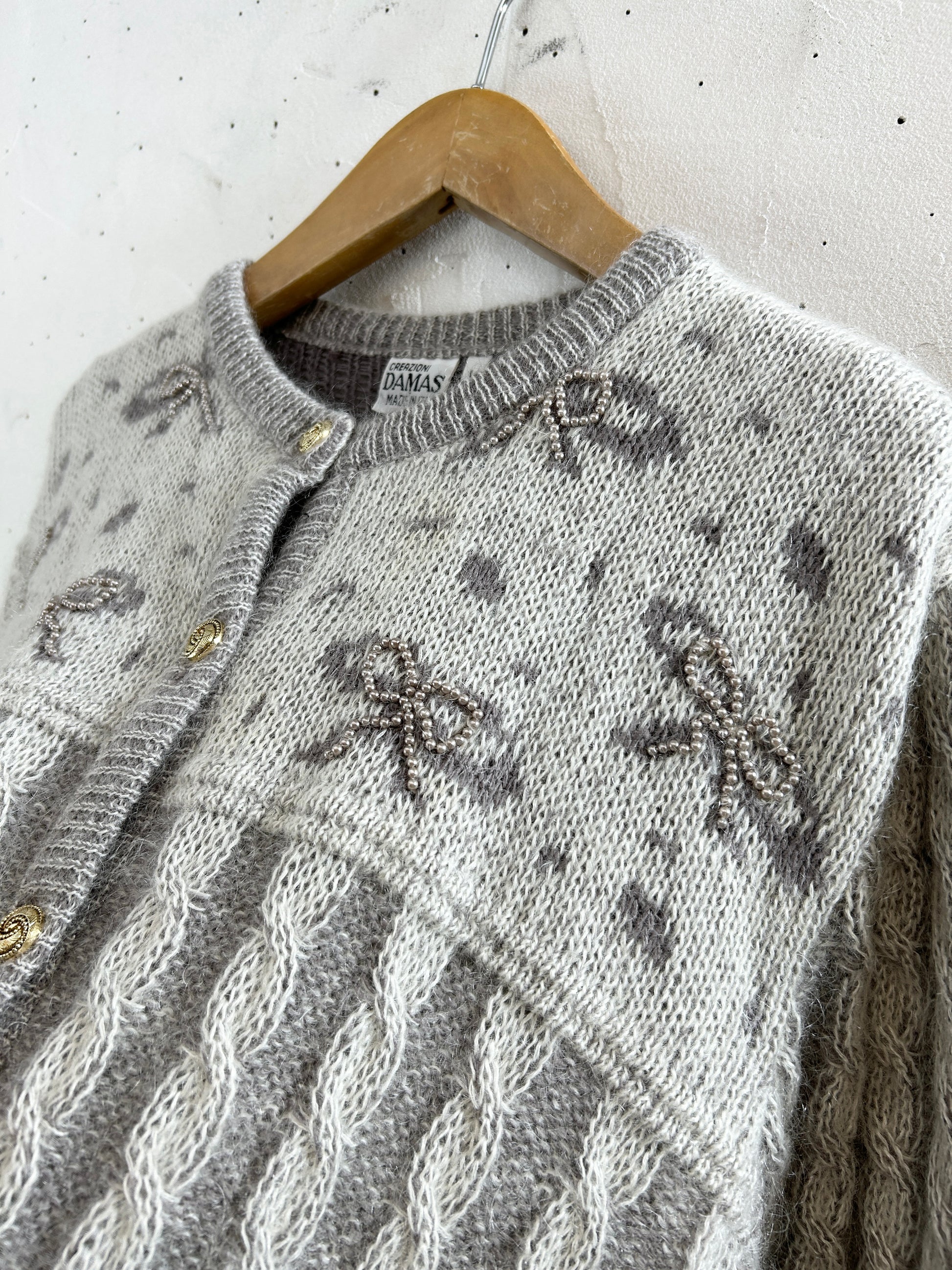 淡いカラーリングのこちらのアイテムは、編みが美しく表現されており、肩あたりのリボンのビーズ装飾が素敵な1着です。