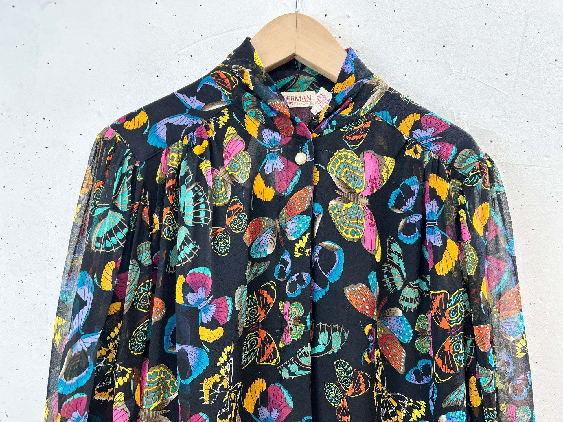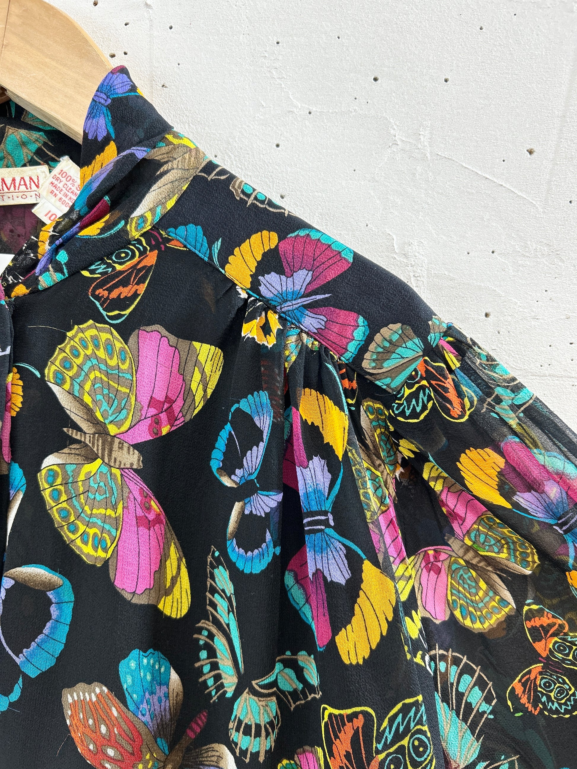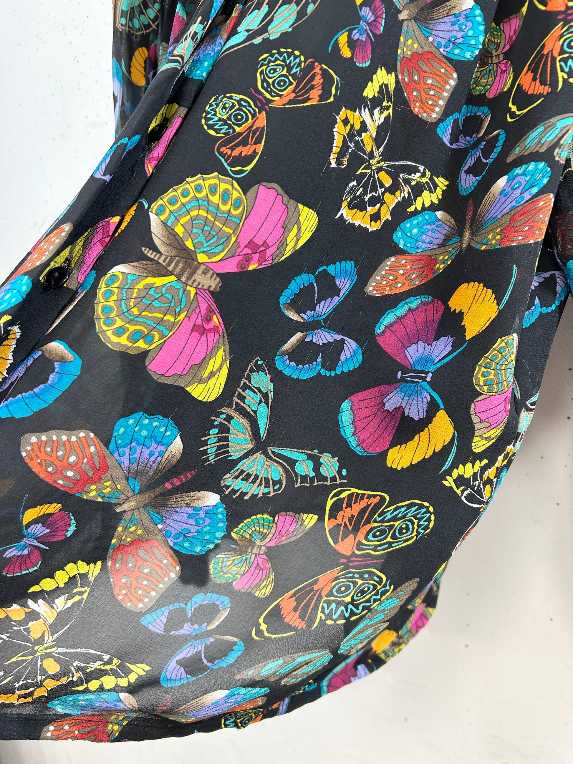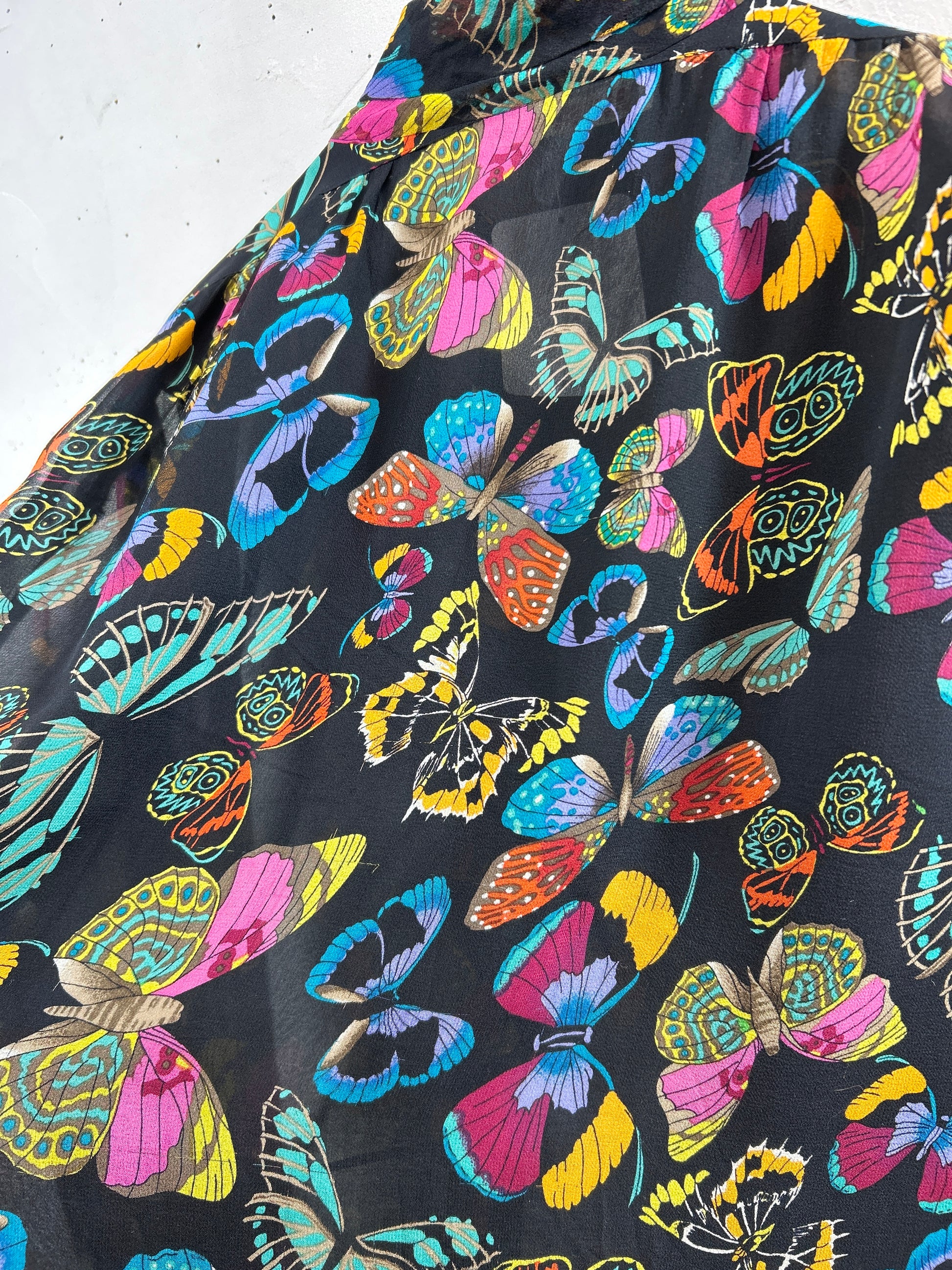 黒ボディにカラフルなバタフライプリントが目を奪います。