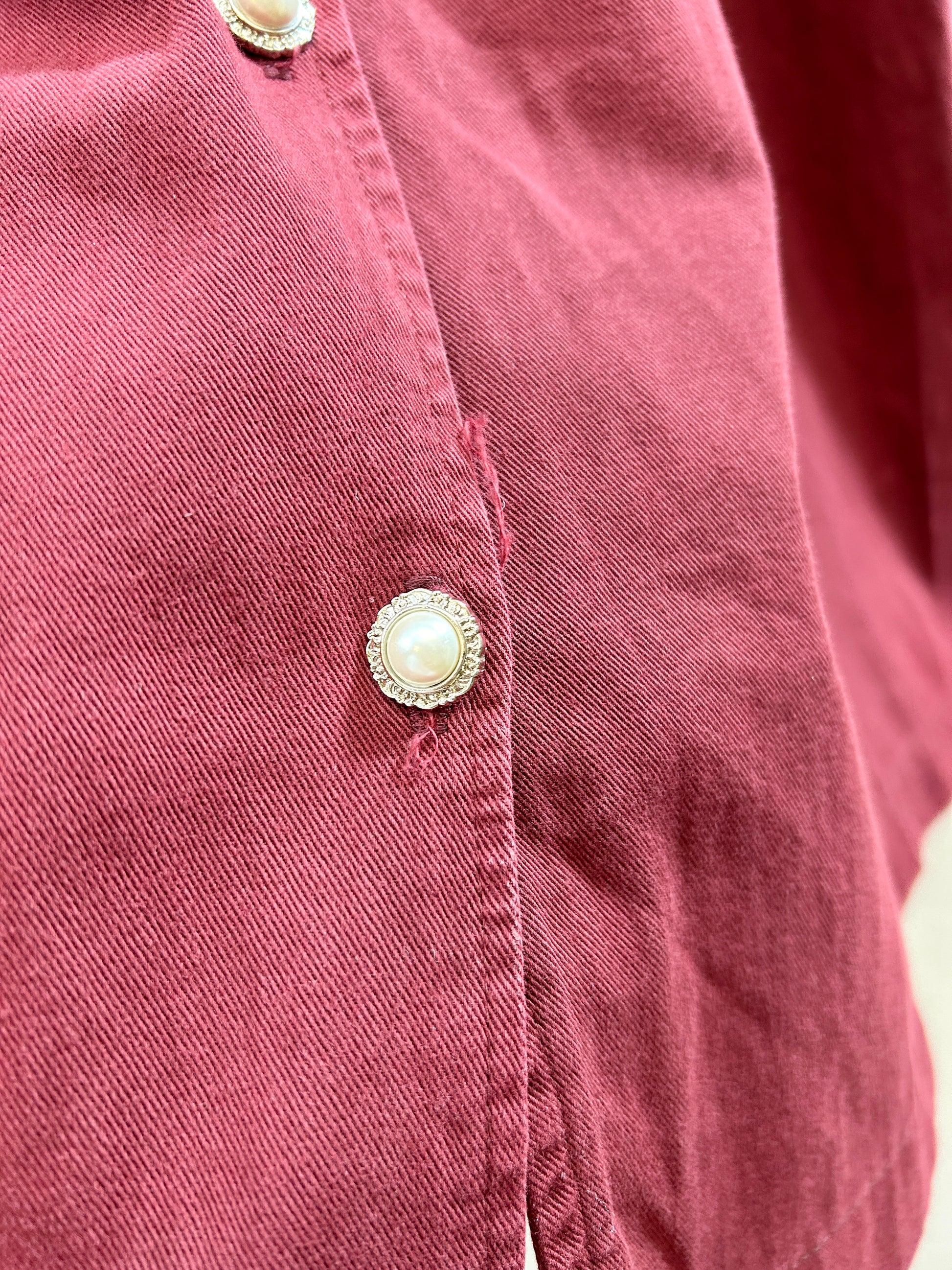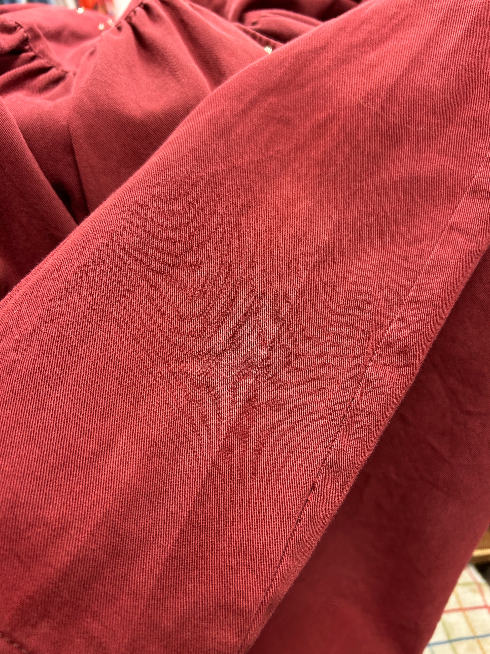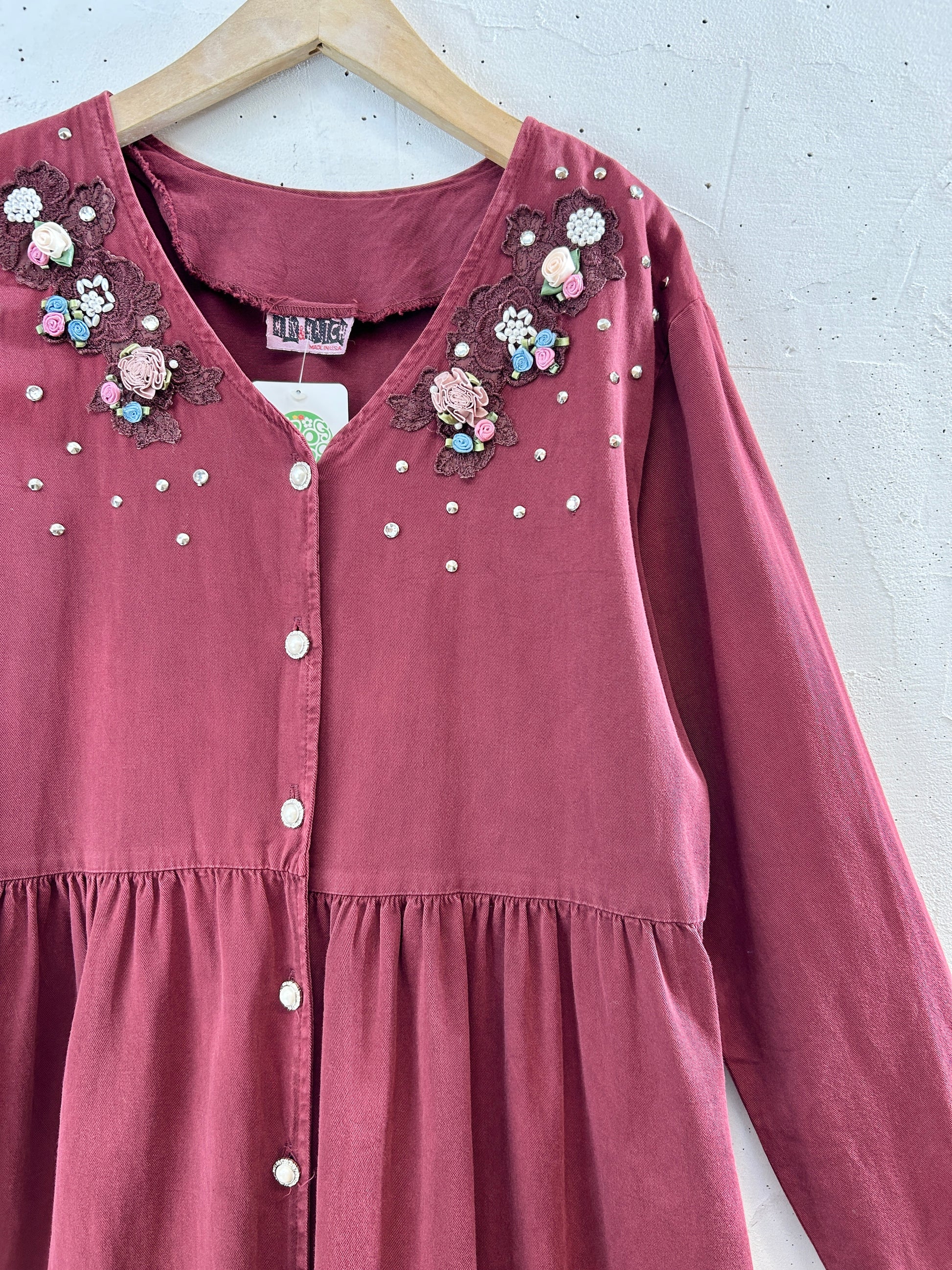 ボルドーカラーのコットンボディにキラキラとスタッヅやレース、お花やラインストーン等の装飾が素敵な1着。