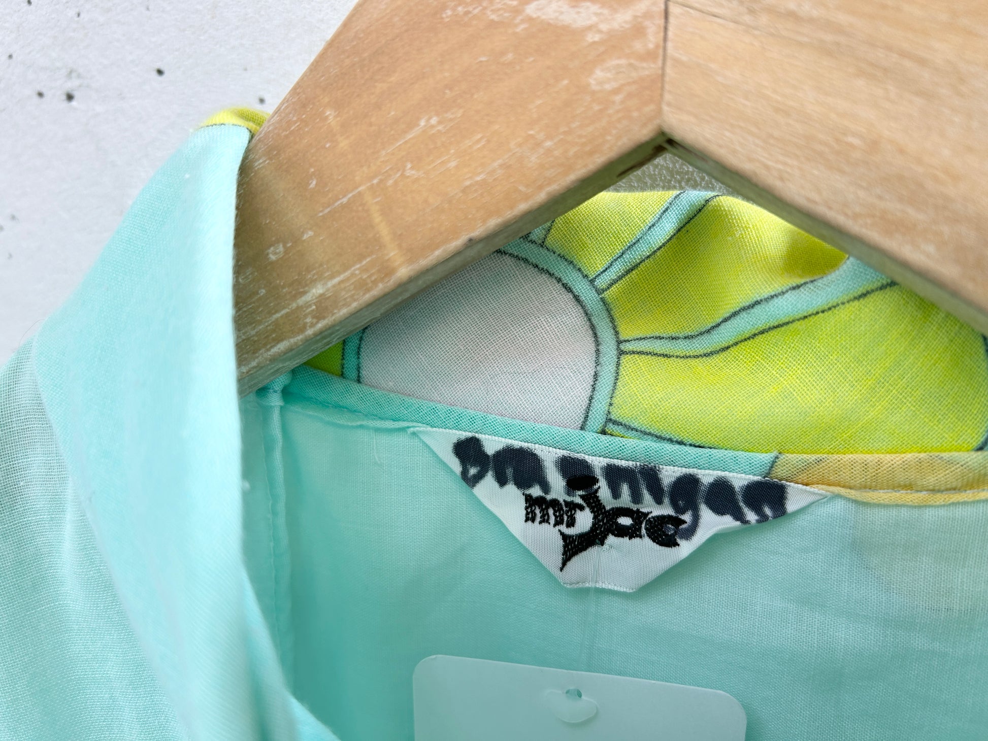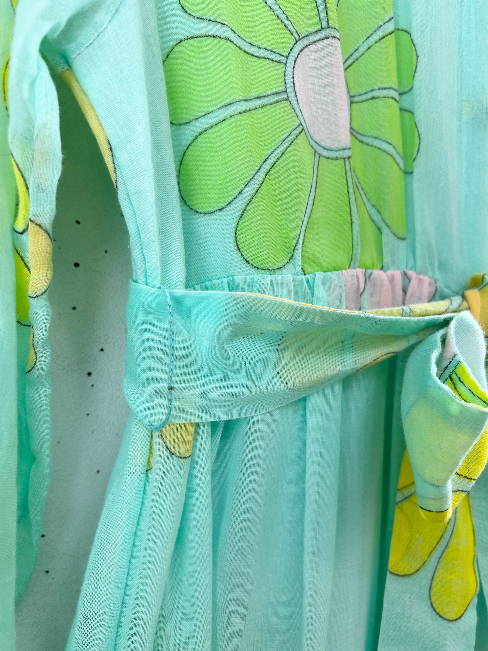 透け感あるガーゼの様な素材感、水色ボディに緑と黄色のお花プリントが可愛いアイテム。