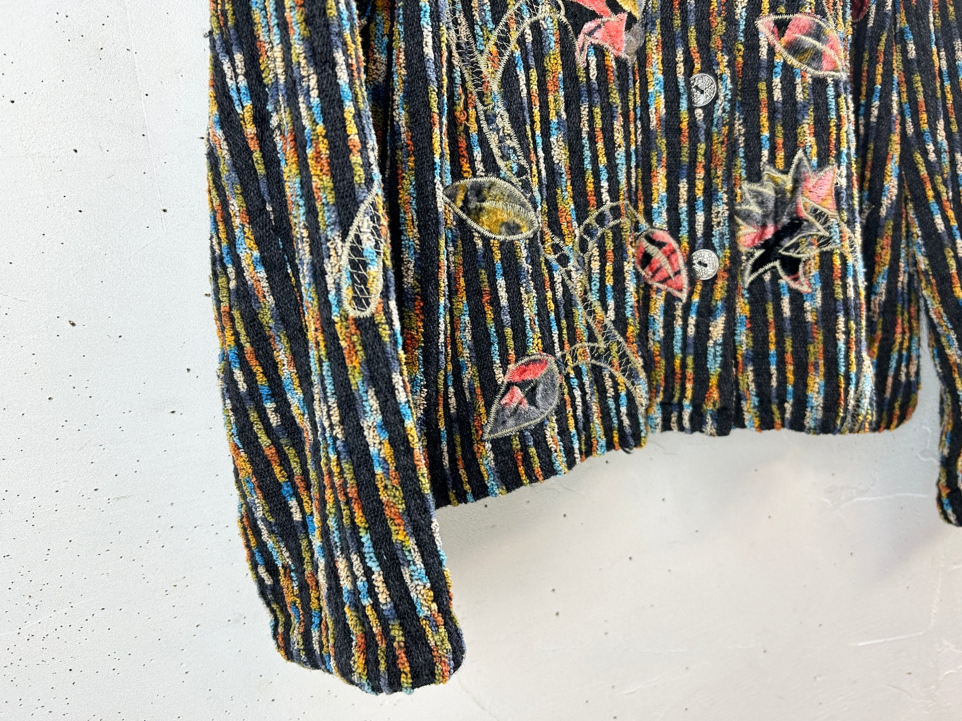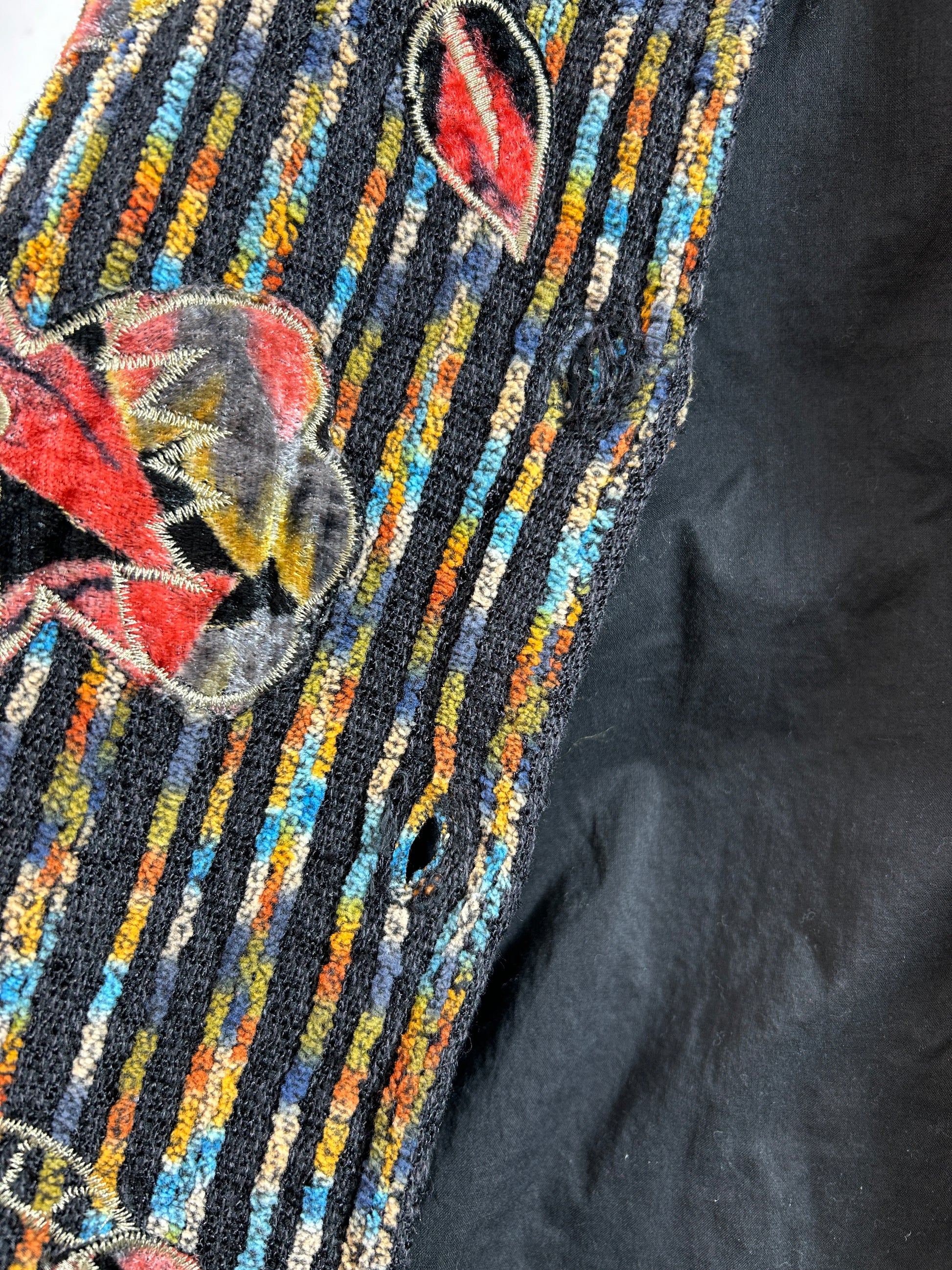 ブラックボディに、パイルのようなカラフルな装飾と、ベロアのパッチが重厚感たっぷりの1着。