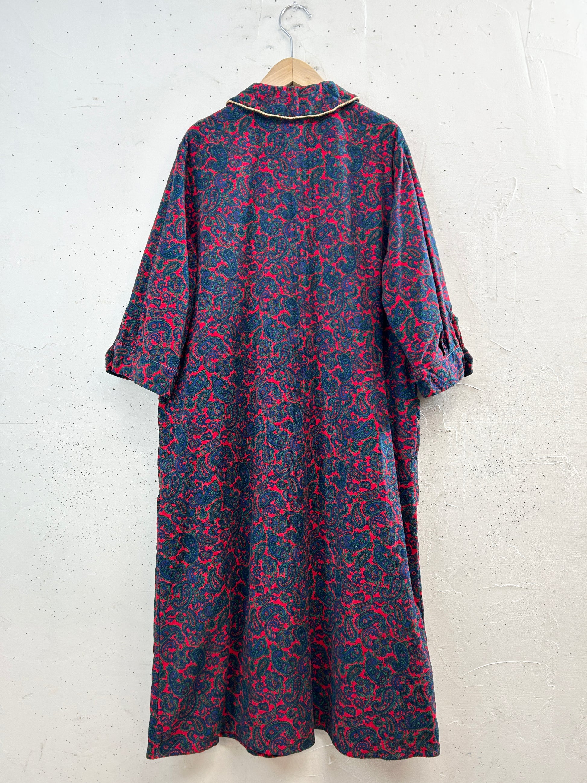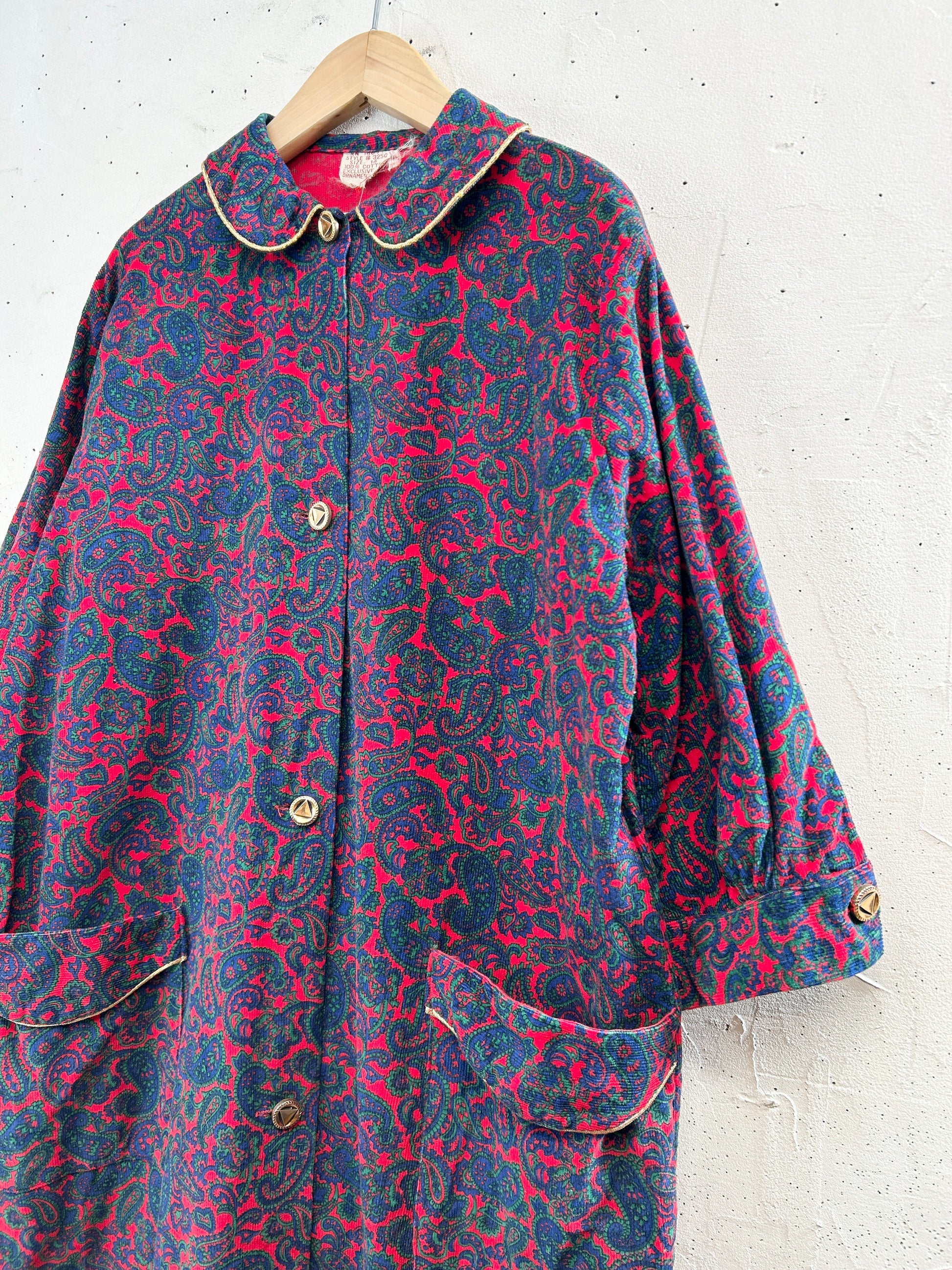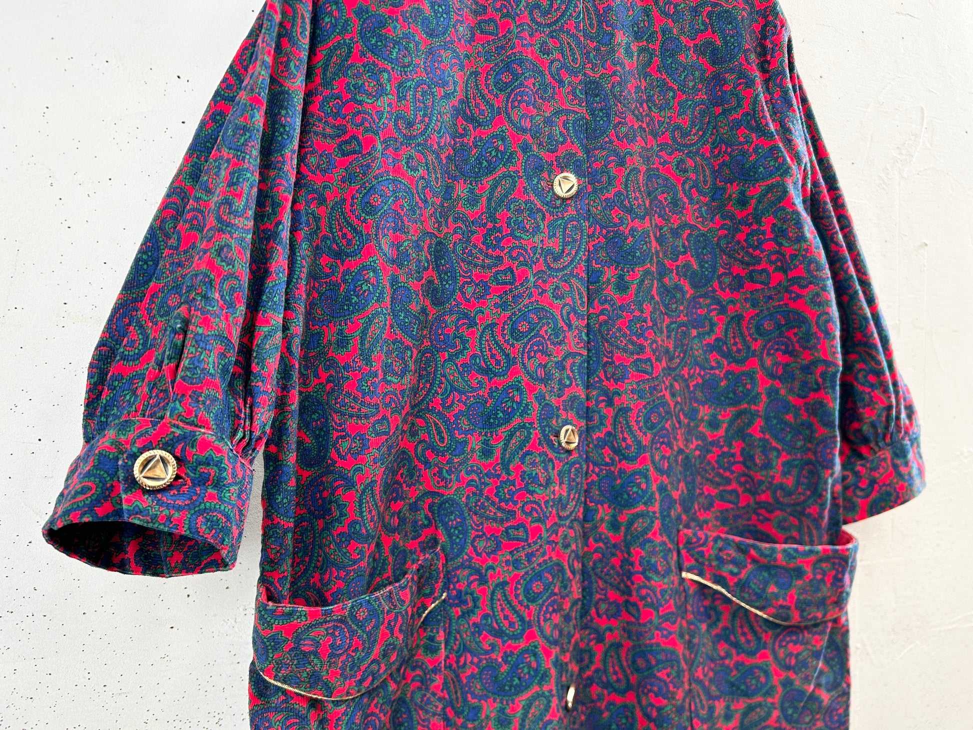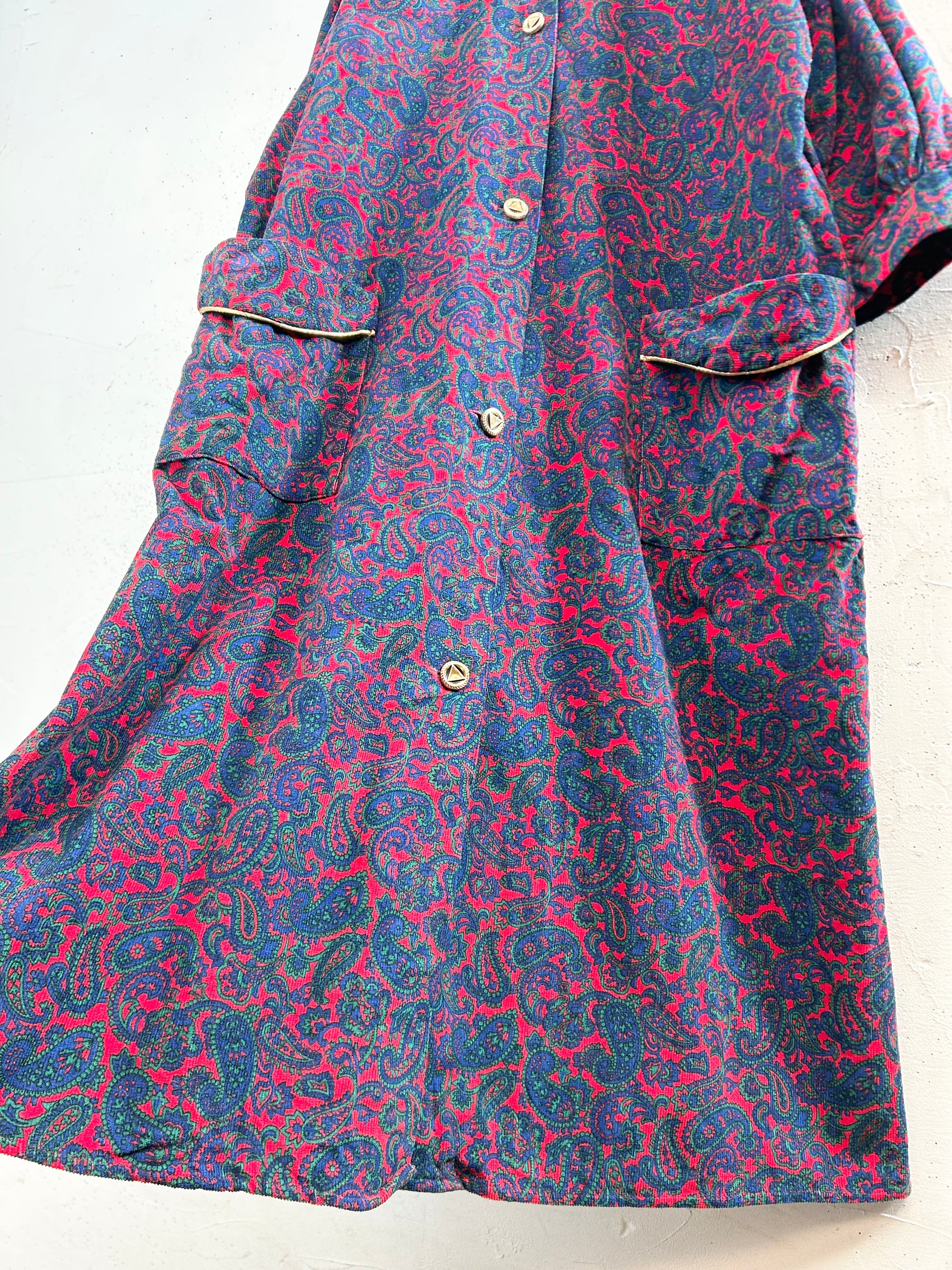 ペイズリーのオリエンタルな雰囲気のテキスタイルにゴールドのパイピングが豪華な1着。