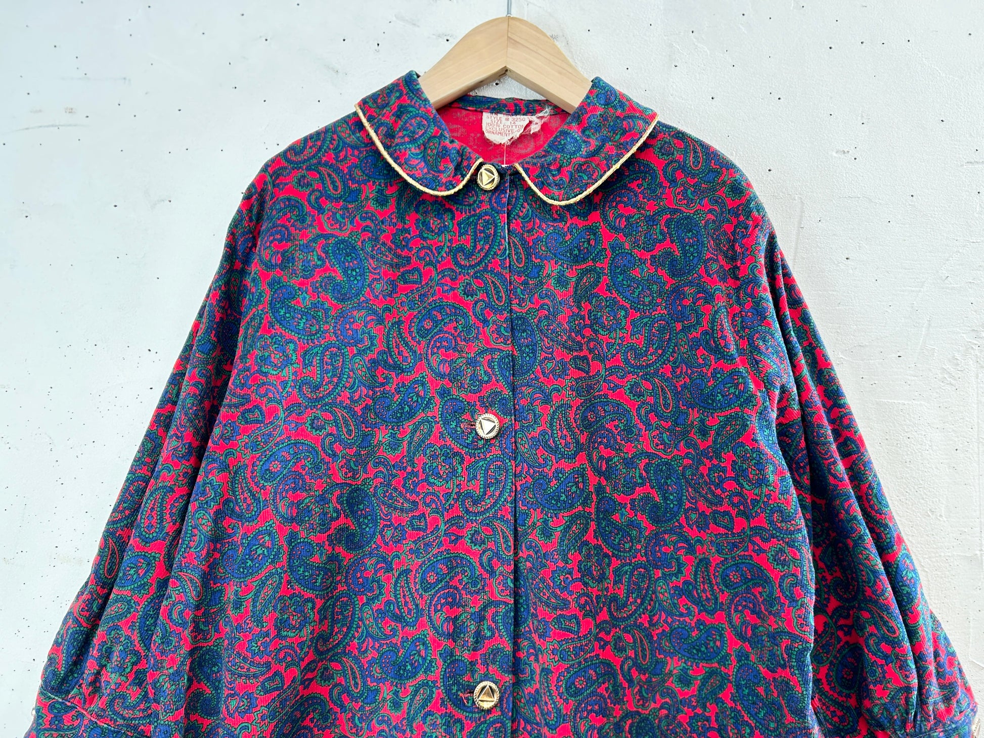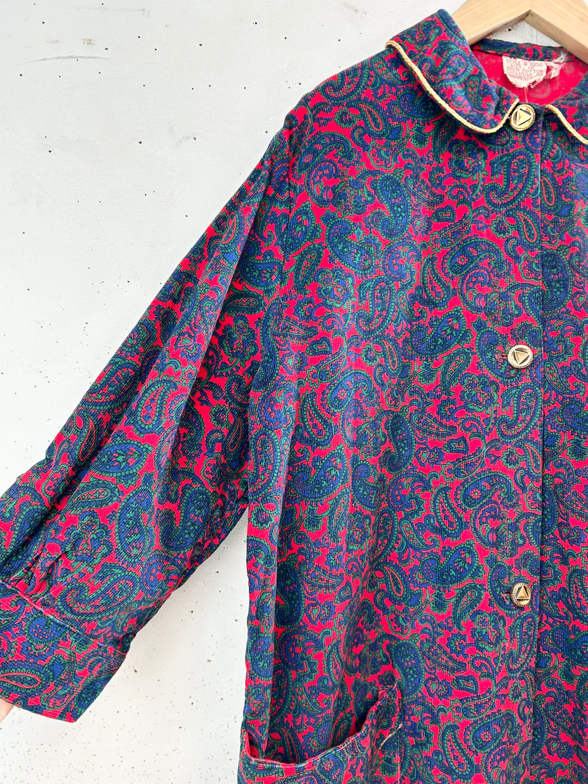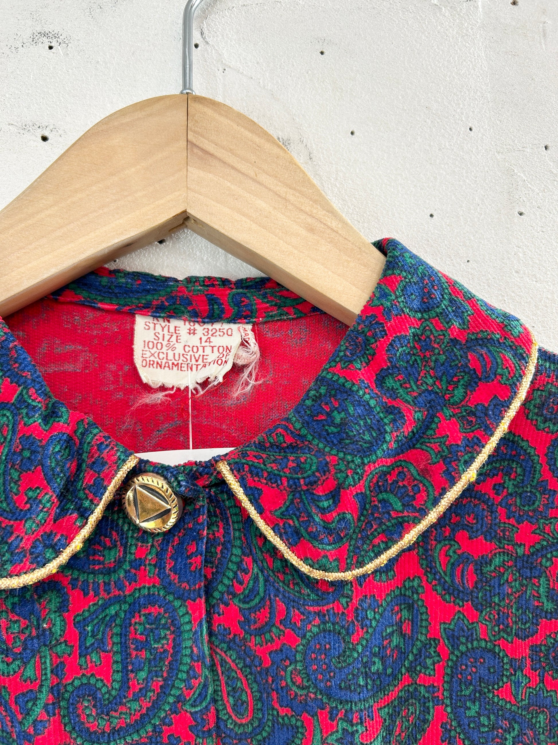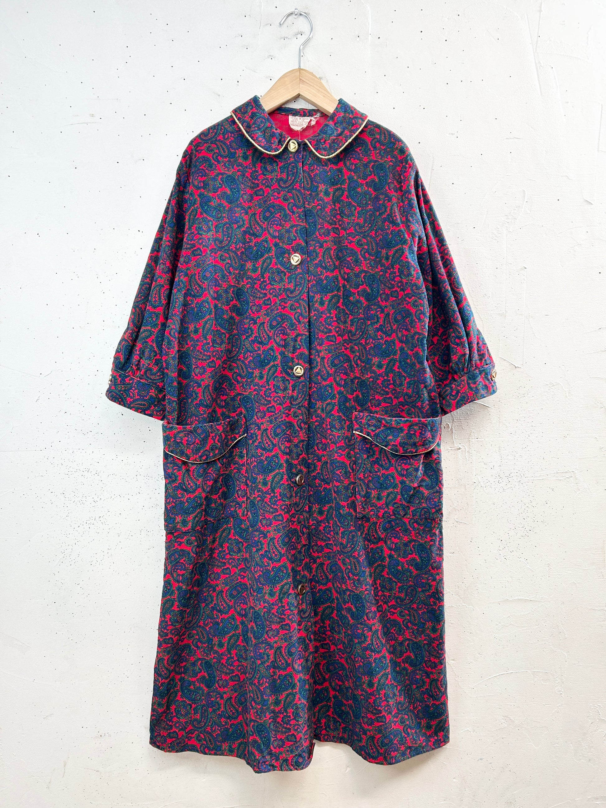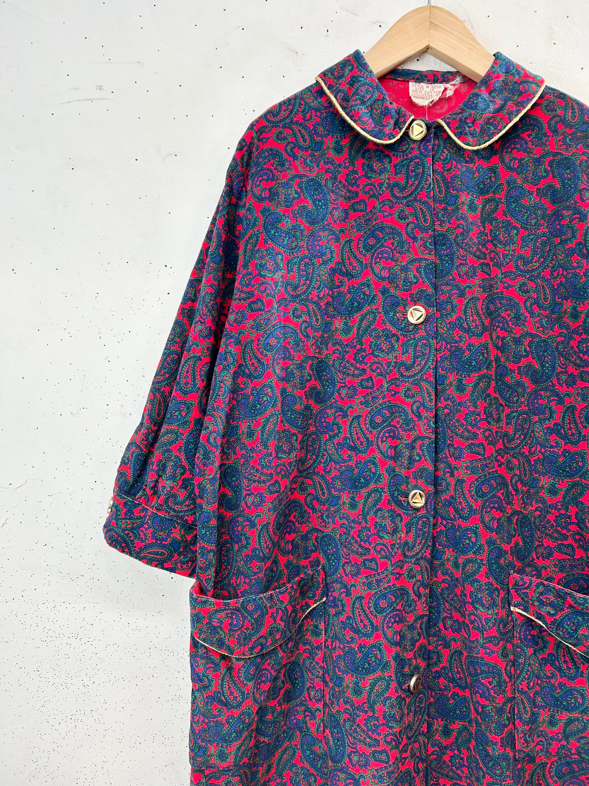 ペイズリーのオリエンタルな雰囲気のテキスタイルにゴールドのパイピングが豪華な1着。