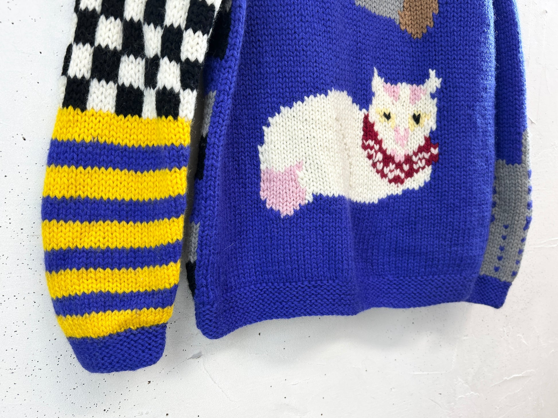 配色もデザインもゆるい猫の表情もたまらないニットセーター。