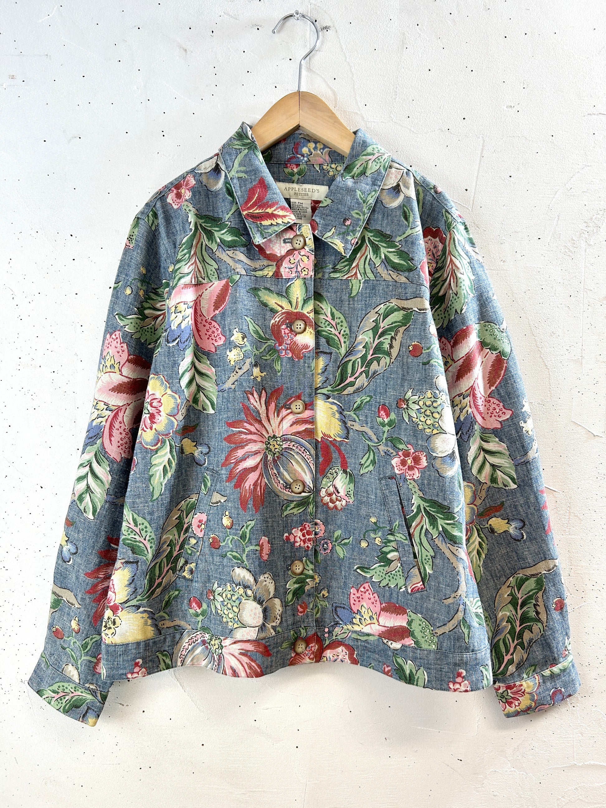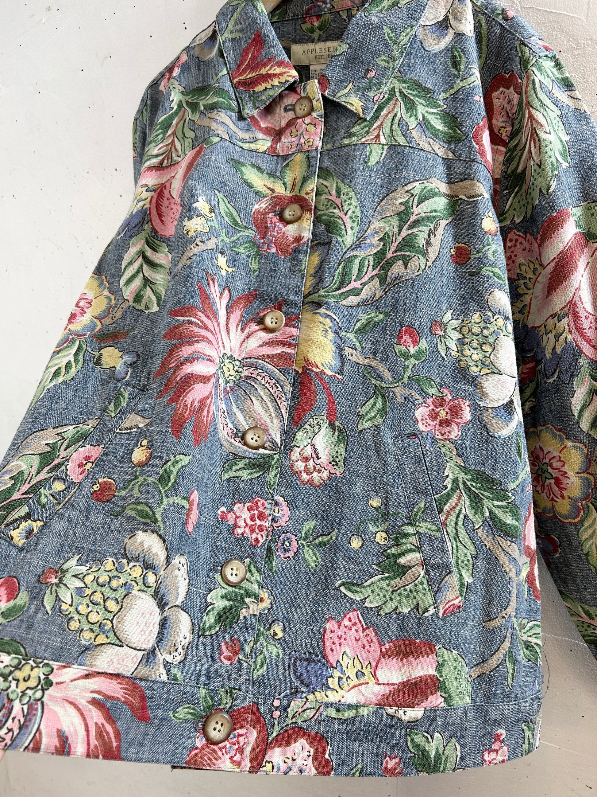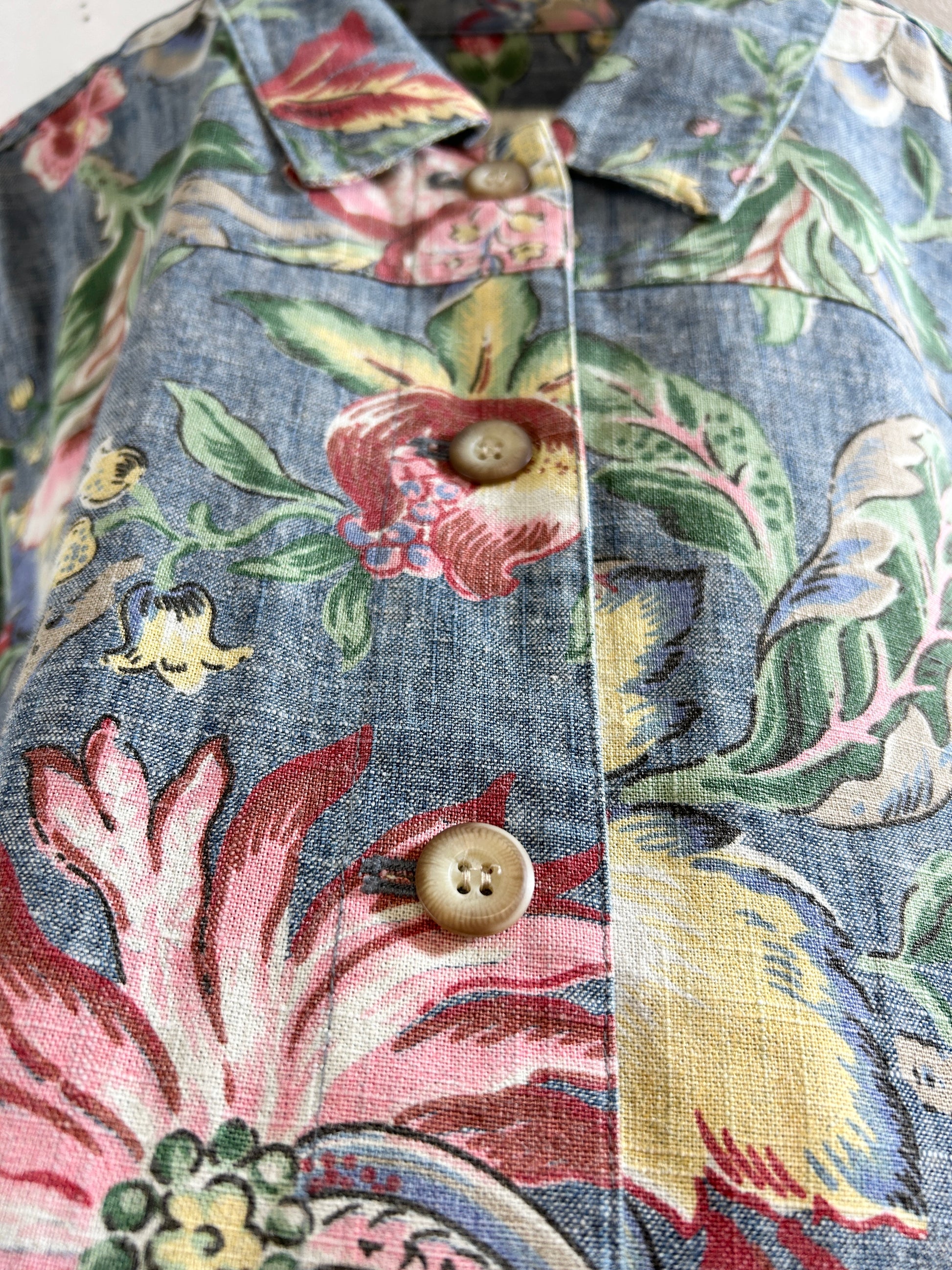 シャンブレーのようなボディに華やかなフラワープリントが大胆で素敵です。