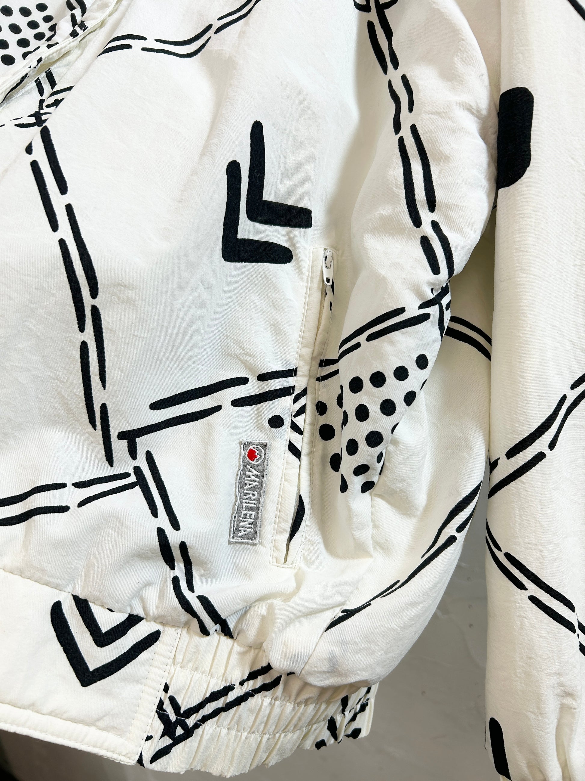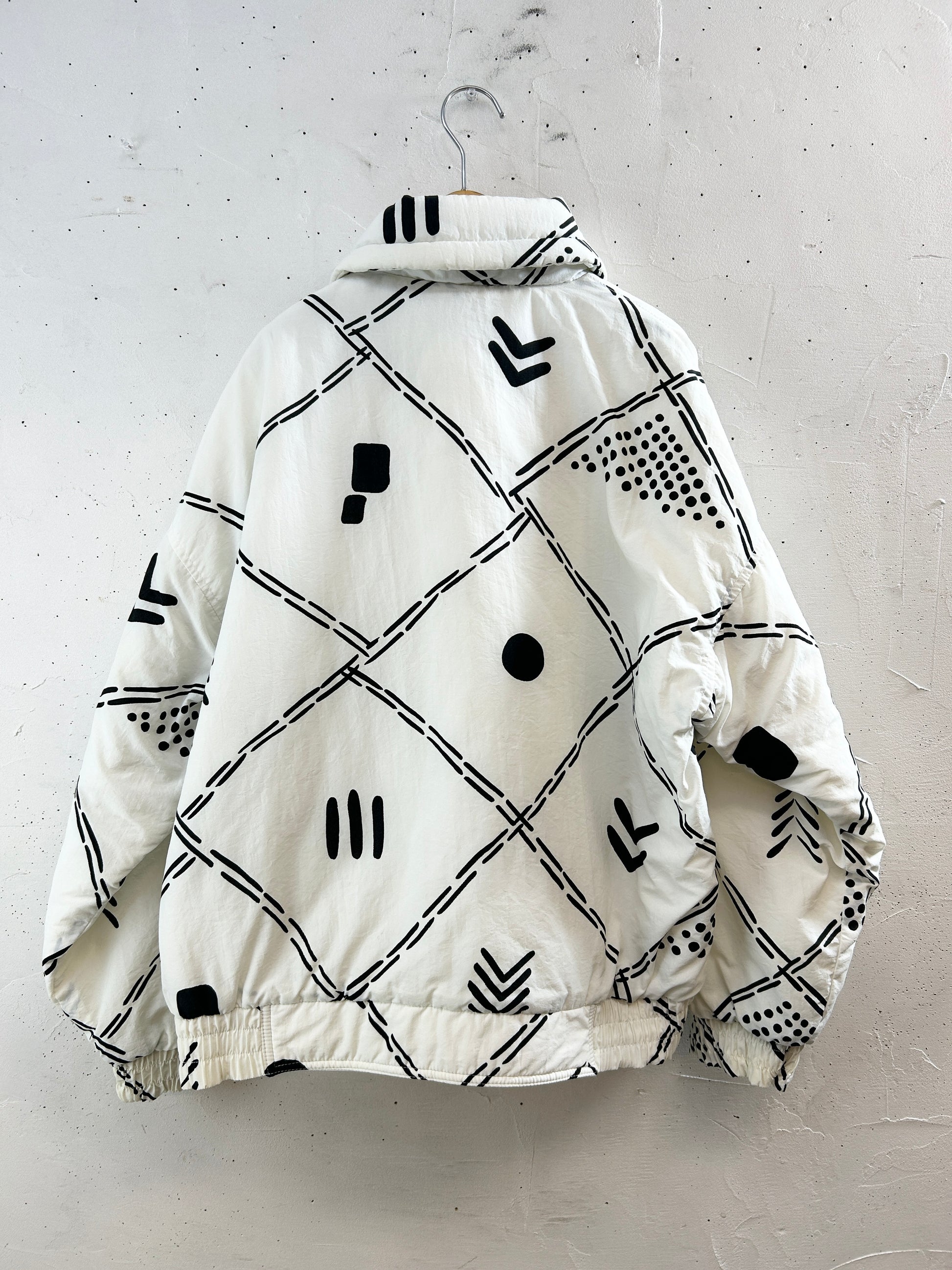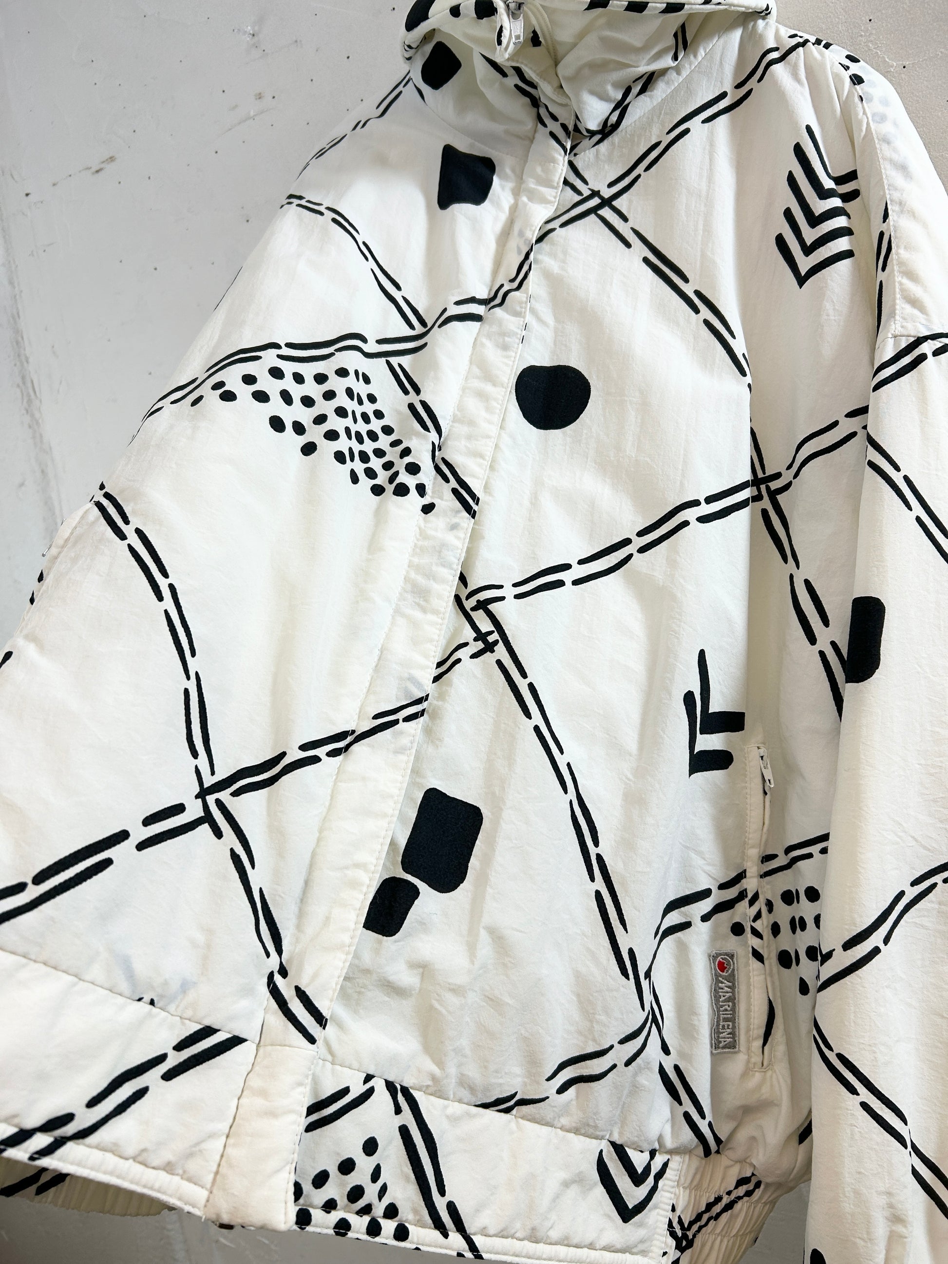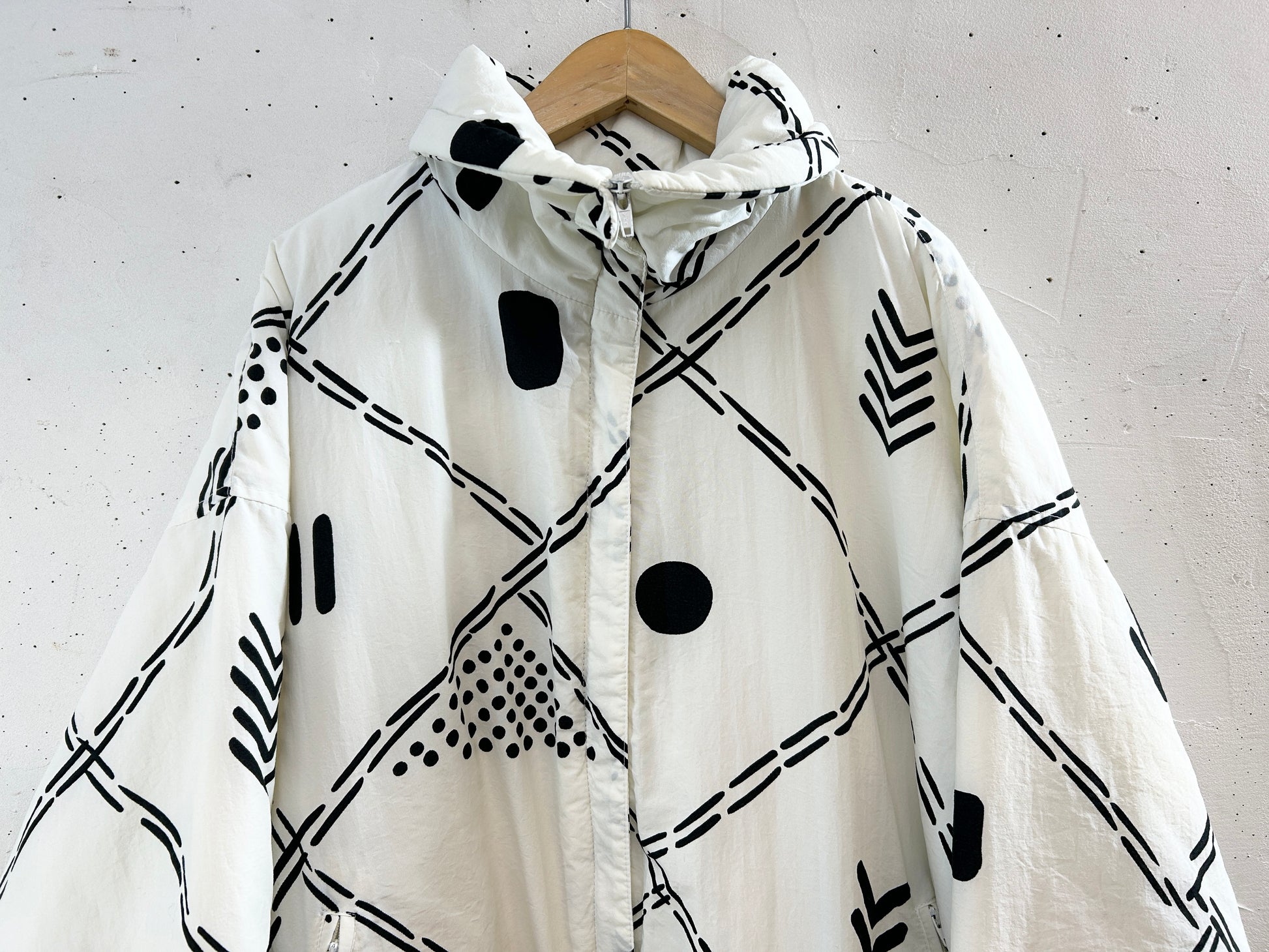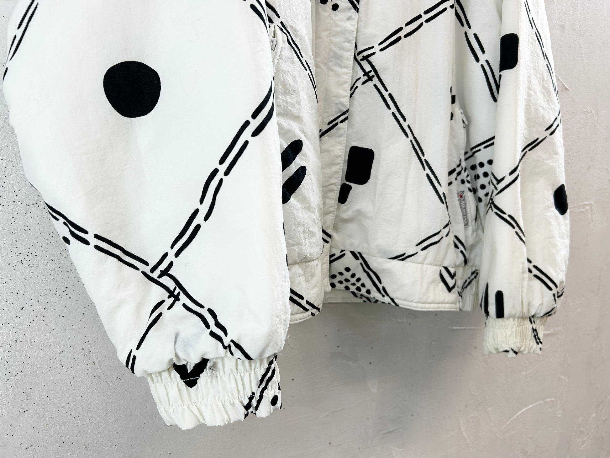 ホワイトボディにネイビーの幾何学柄、中綿の入るキルティングブルゾン。