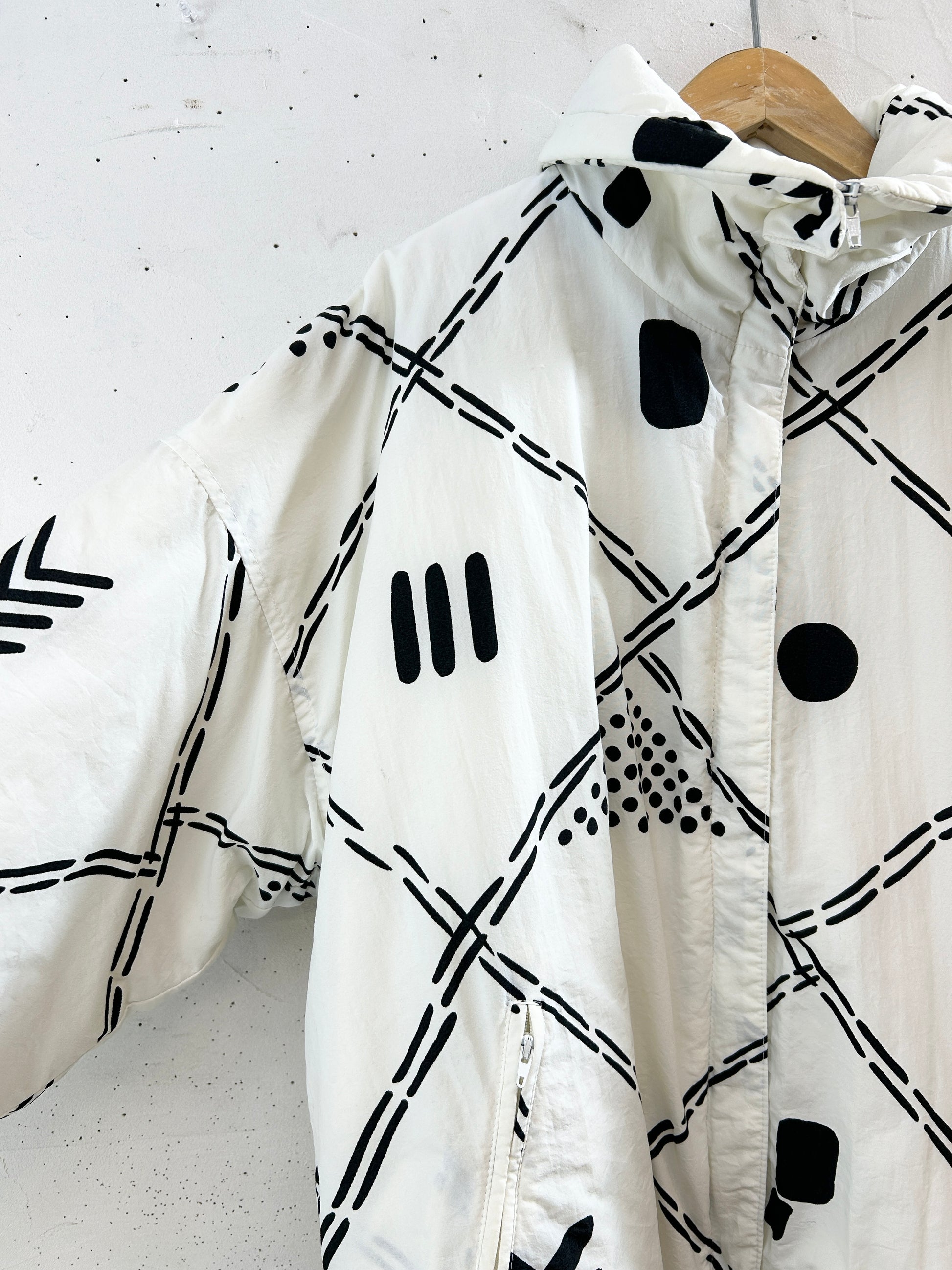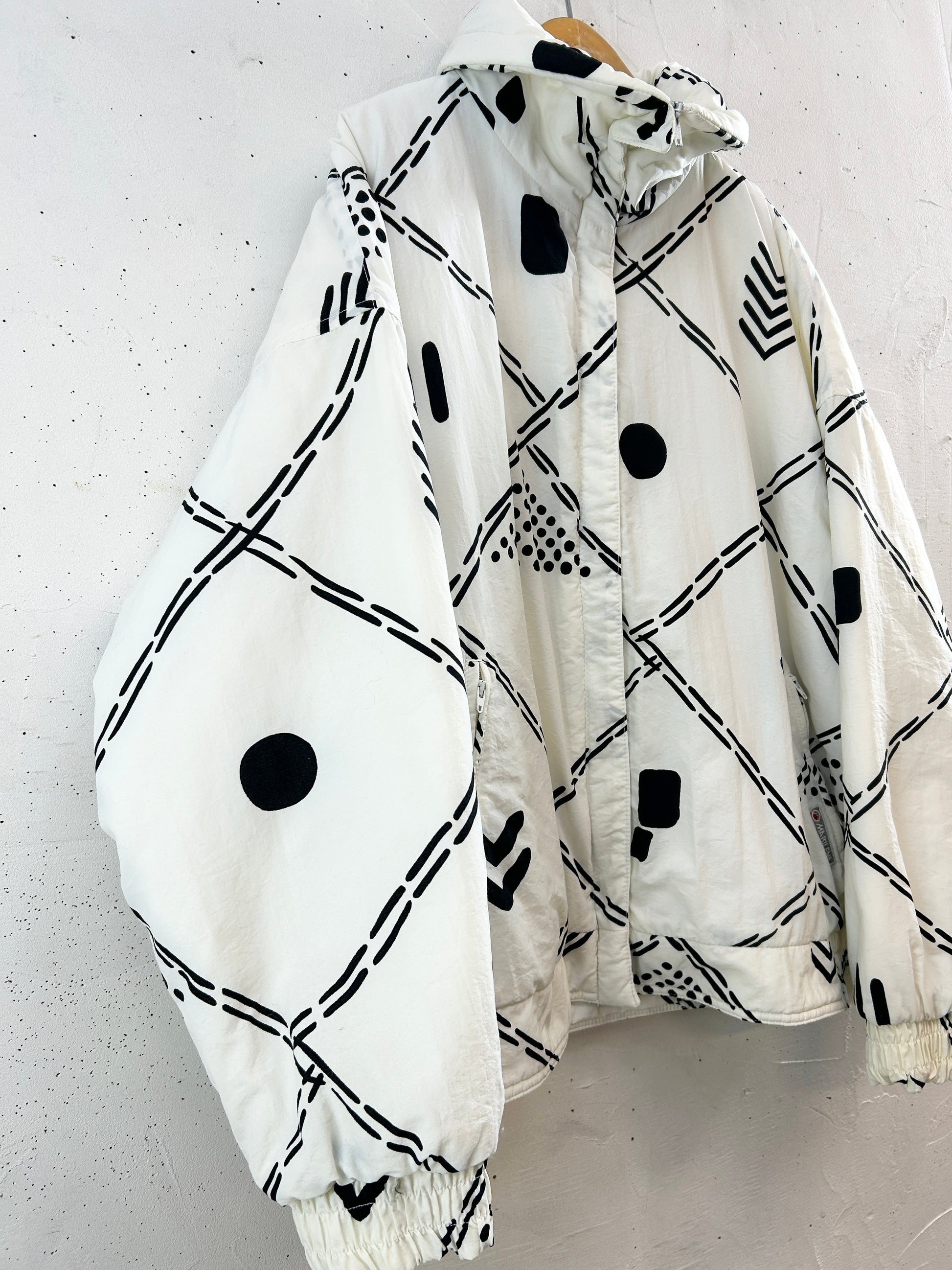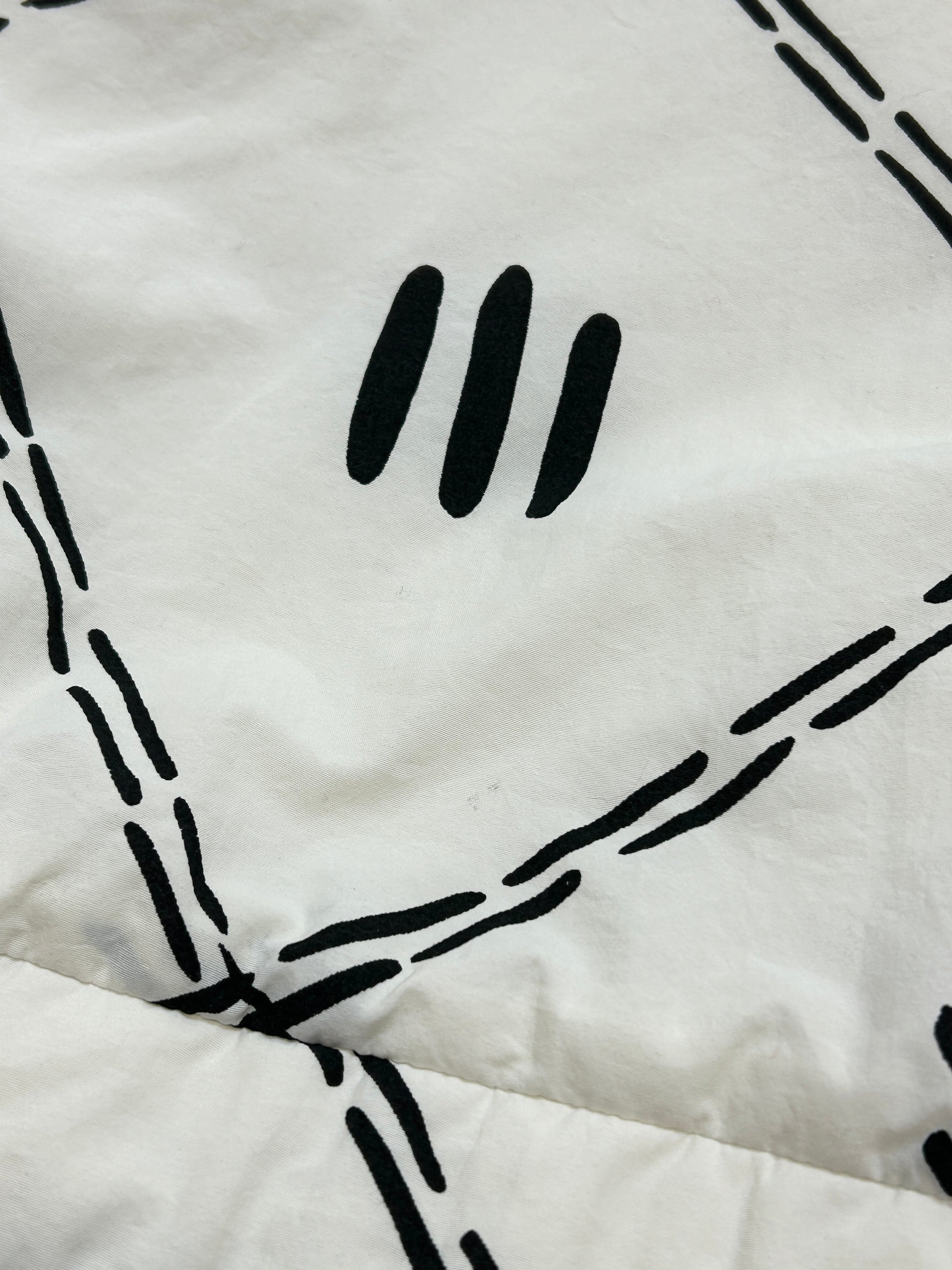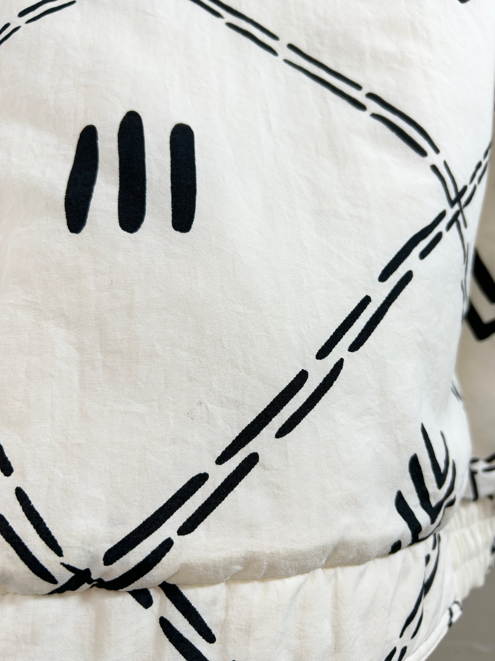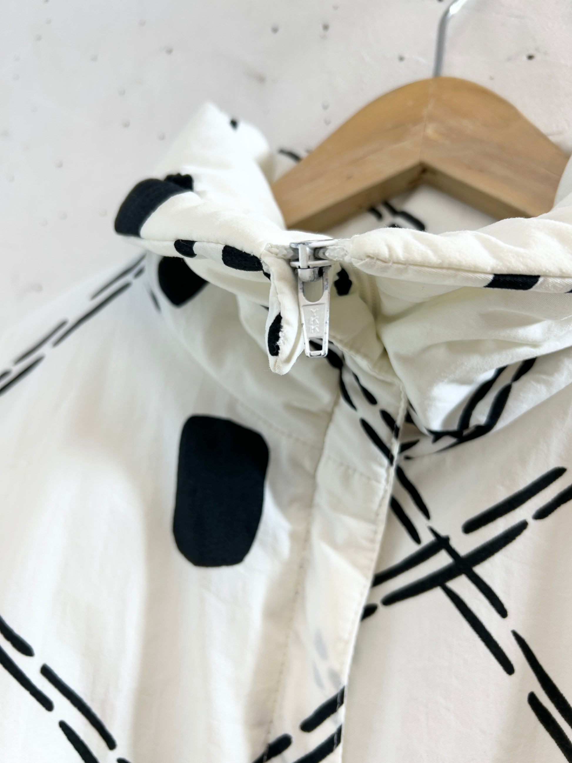 ホワイトボディにネイビーの幾何学柄、中綿の入るキルティングブルゾン。