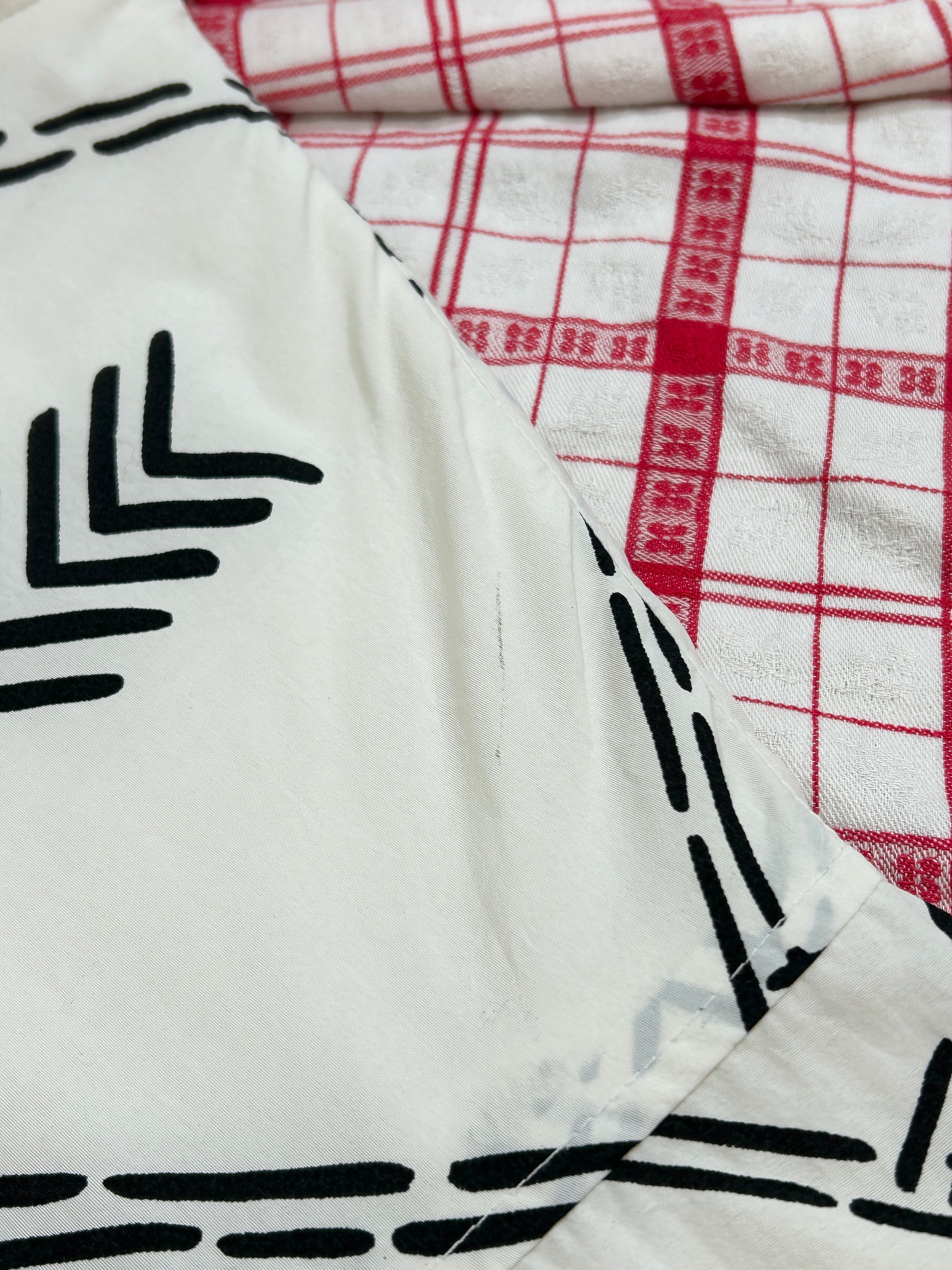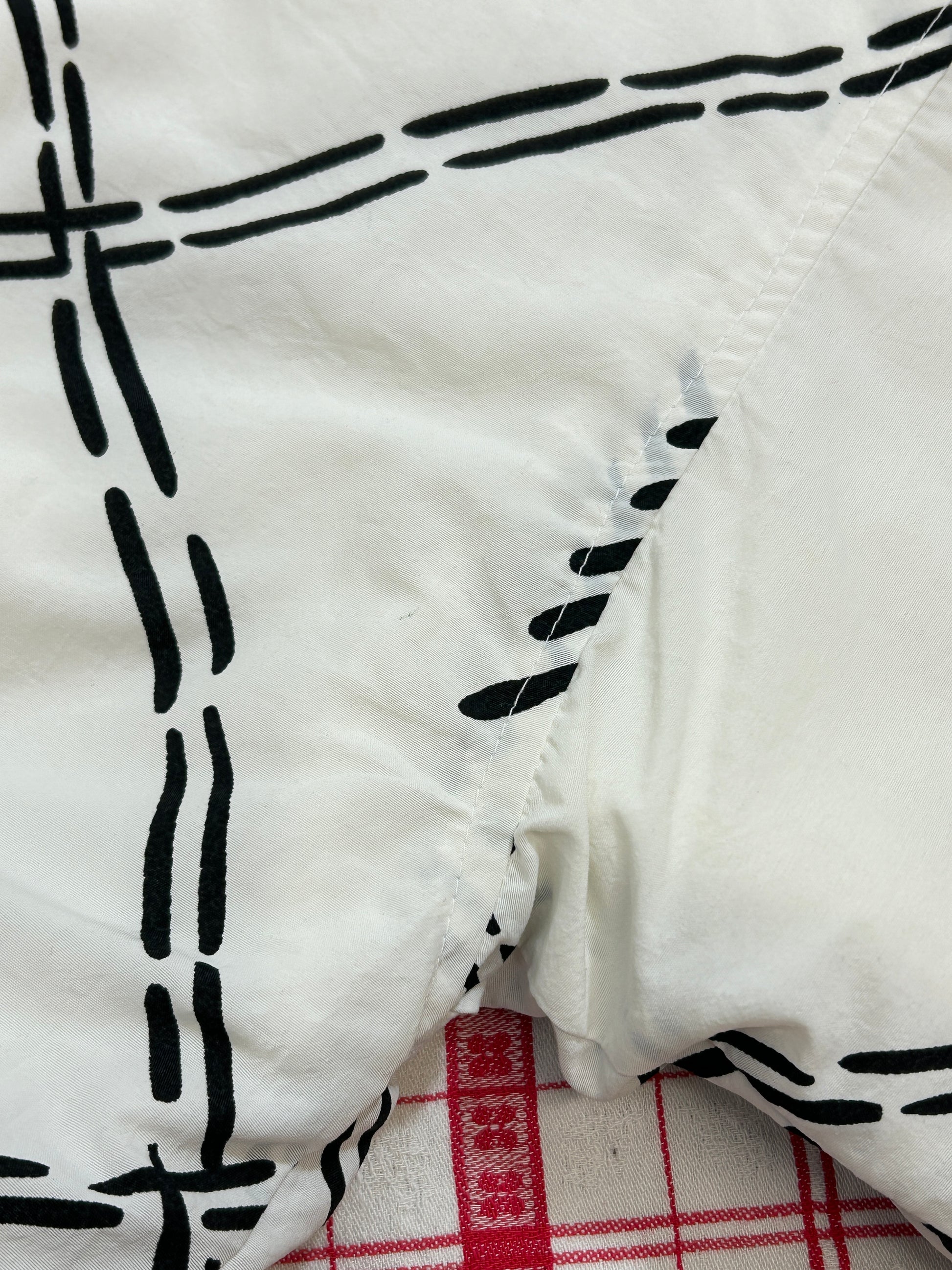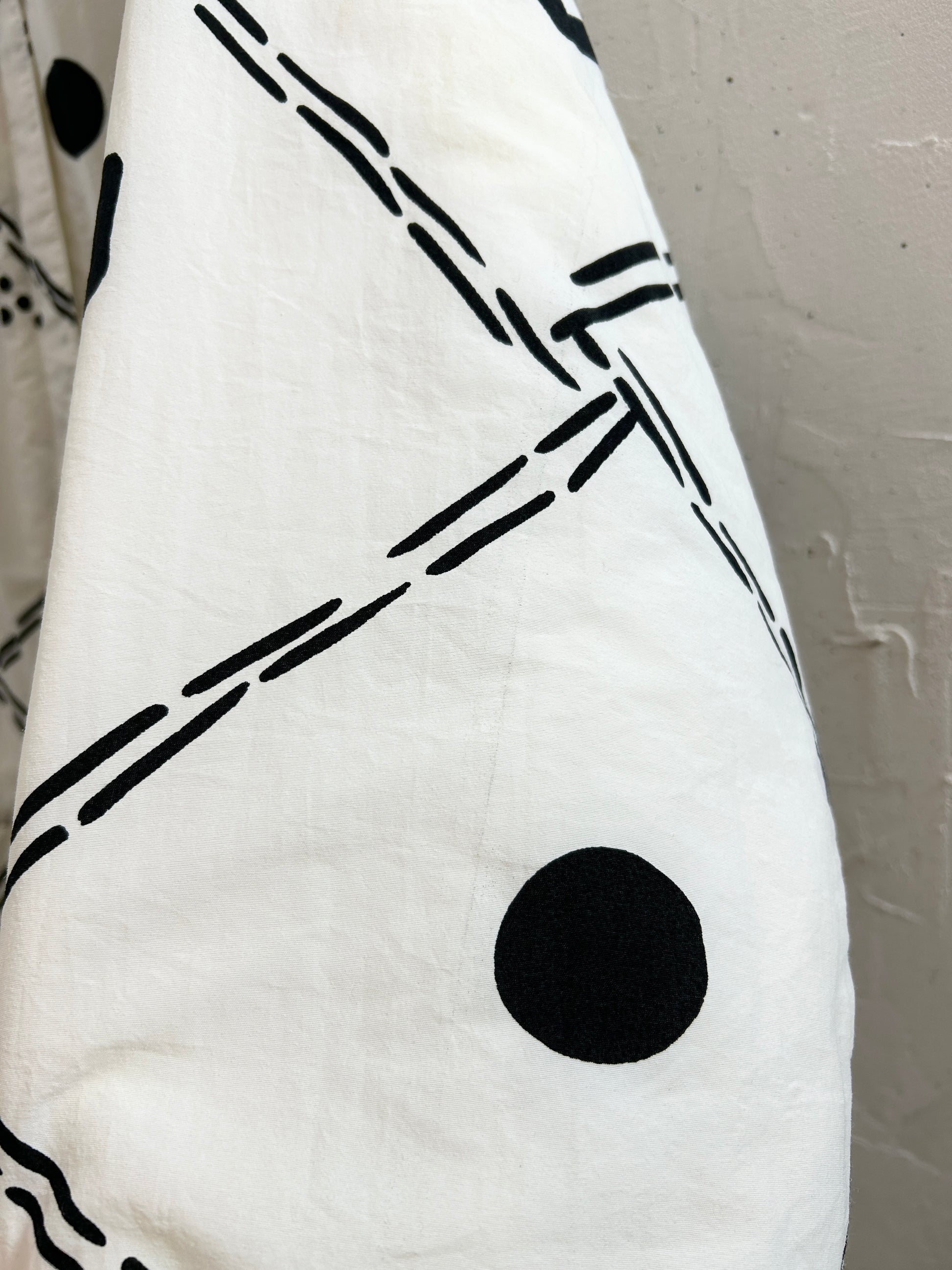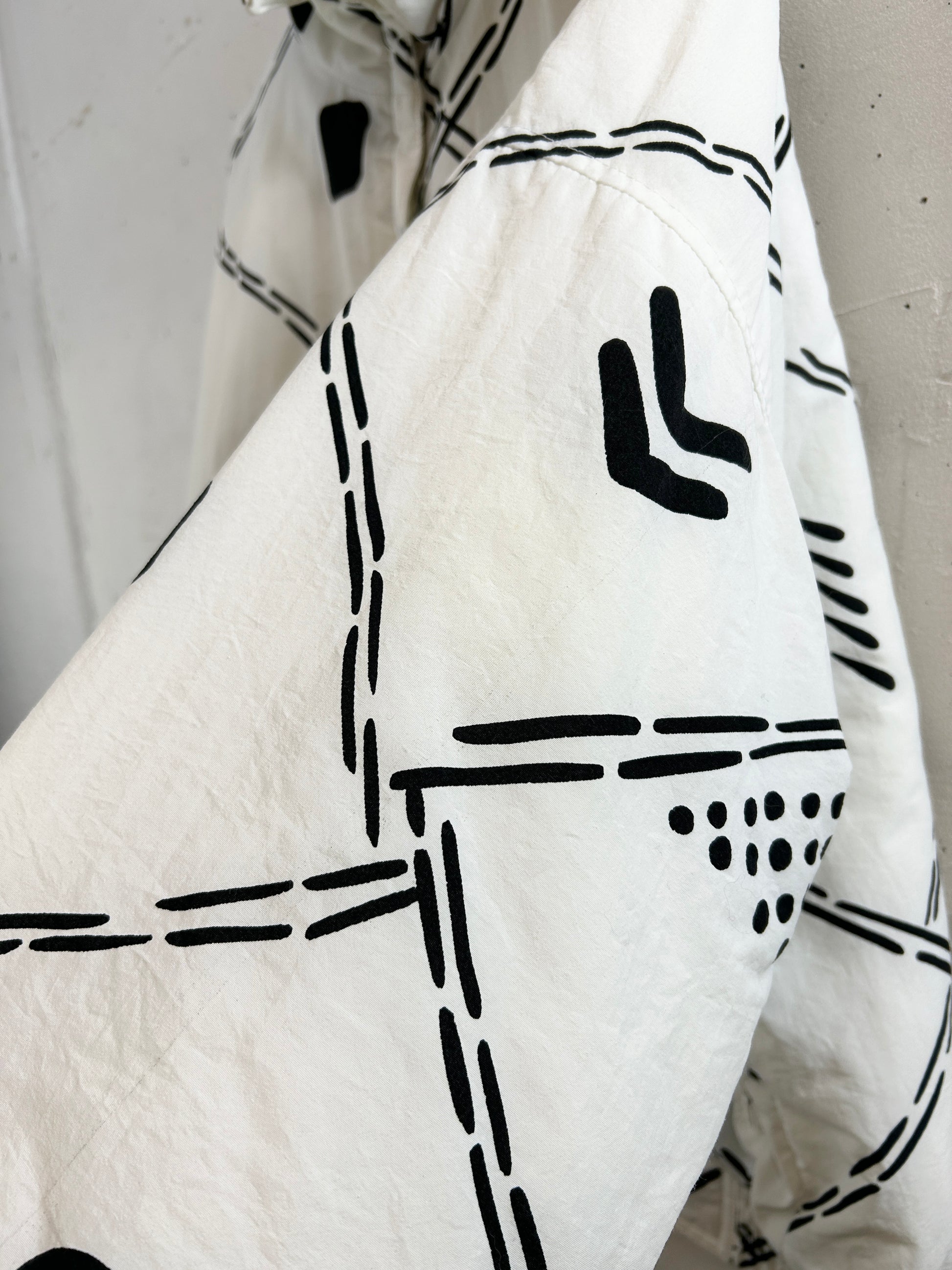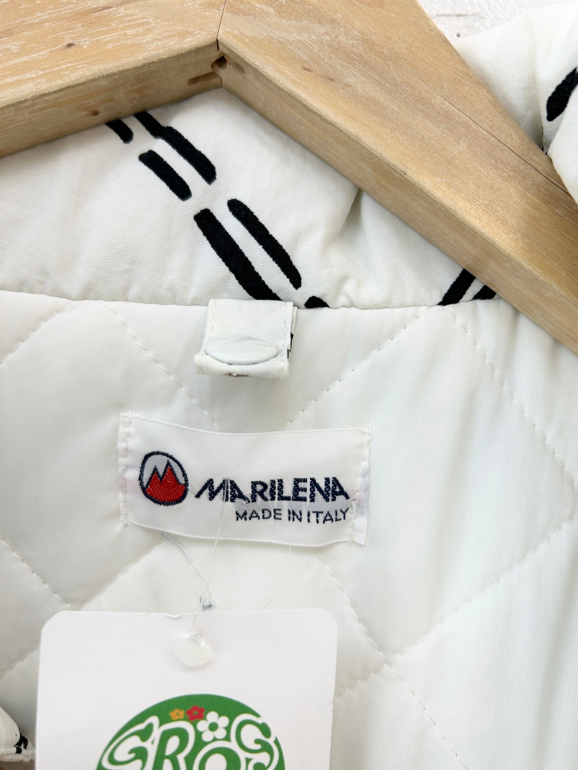 ホワイトボディにネイビーの幾何学柄、中綿の入るキルティングブルゾン。