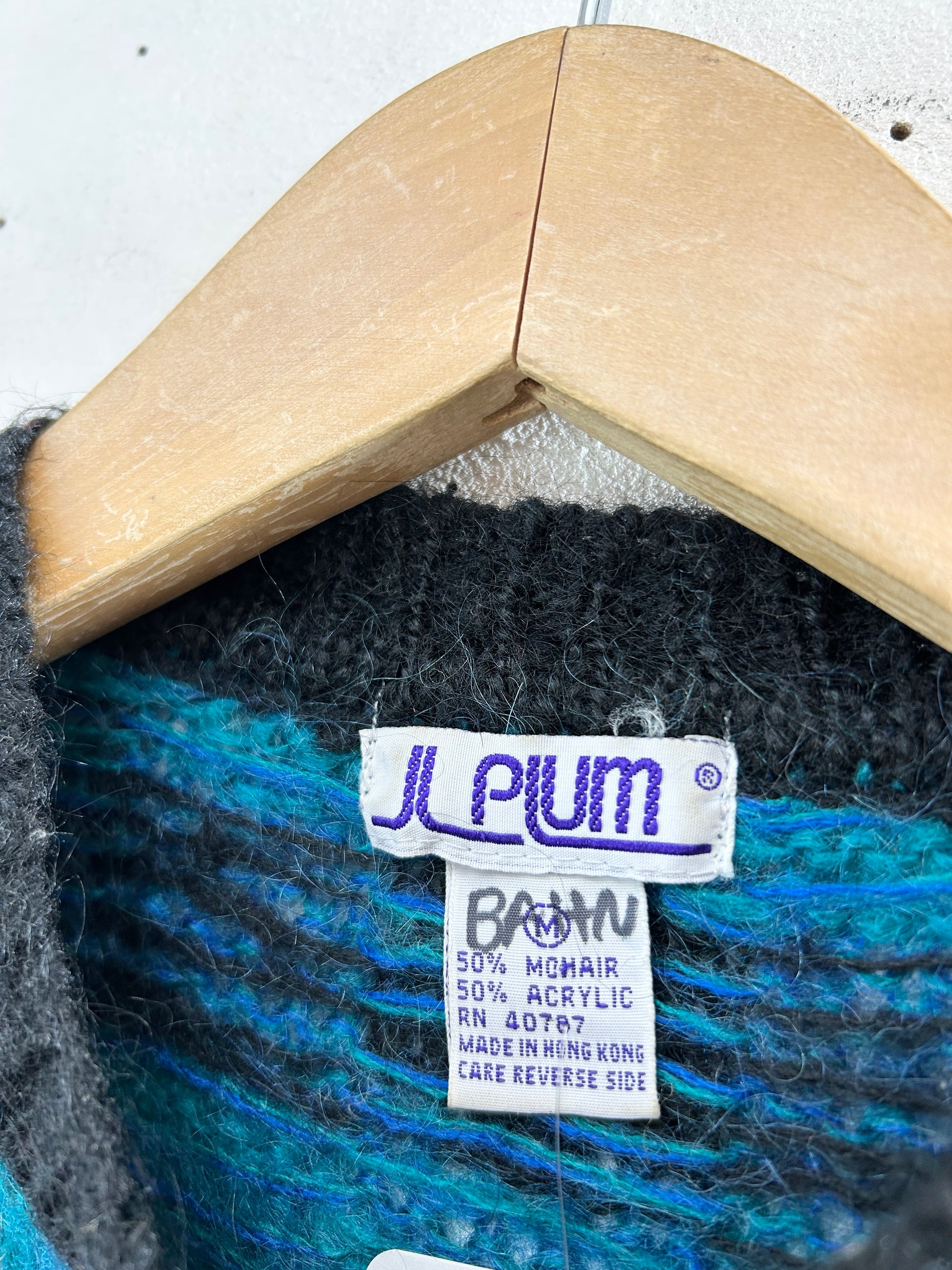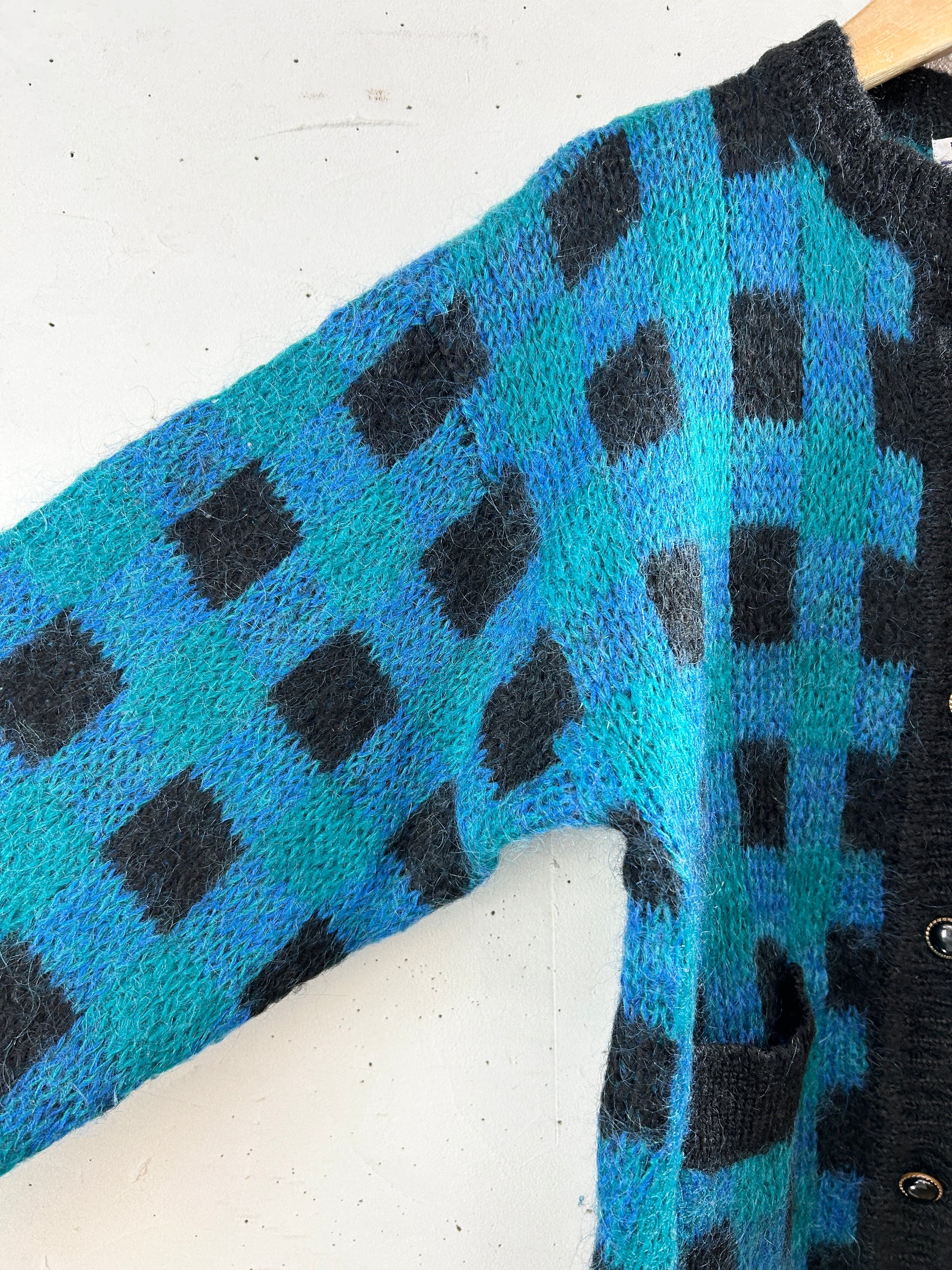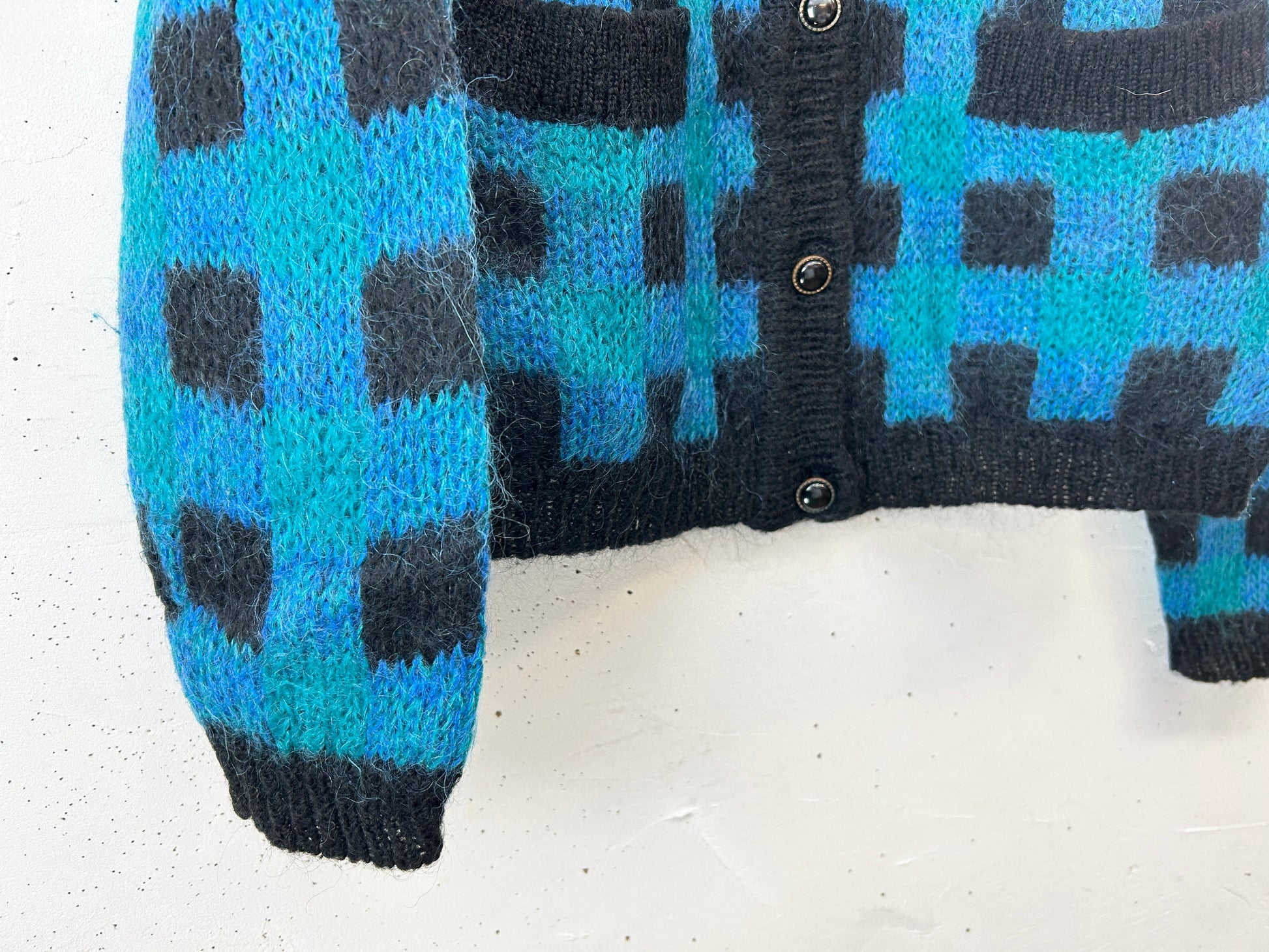 モヘアの風合い抜群のニットカーディガン。緑や青のブロックチェックに黒が効いてます。