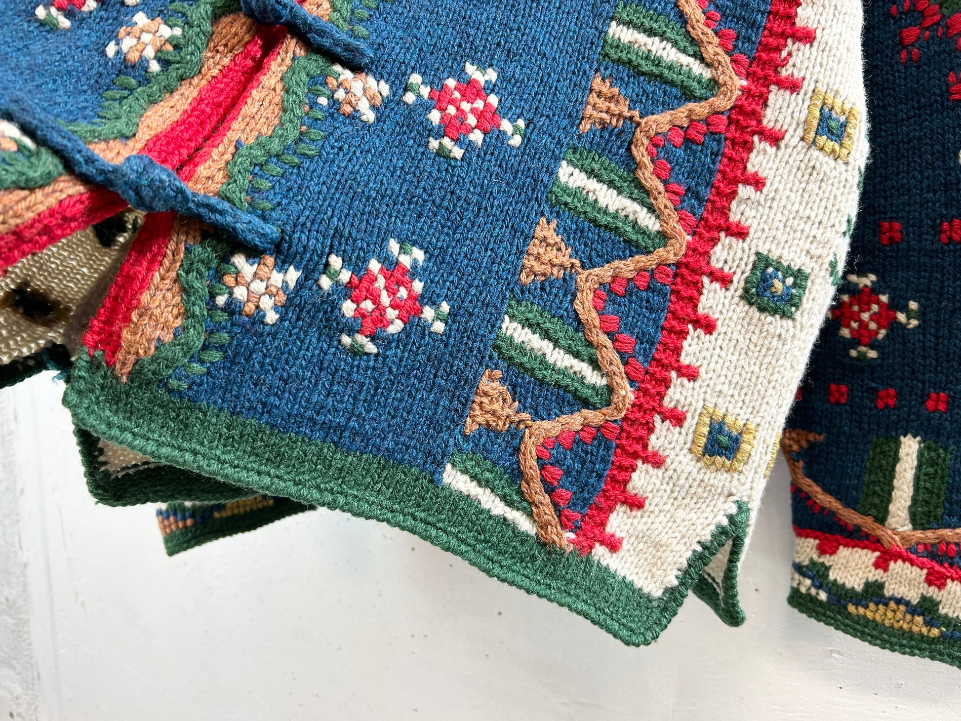 少しグリーンみのあるブルーボディ、カラフルな幾何学デザイン、フロントのチャイナボタンがアクセントのアイテム。