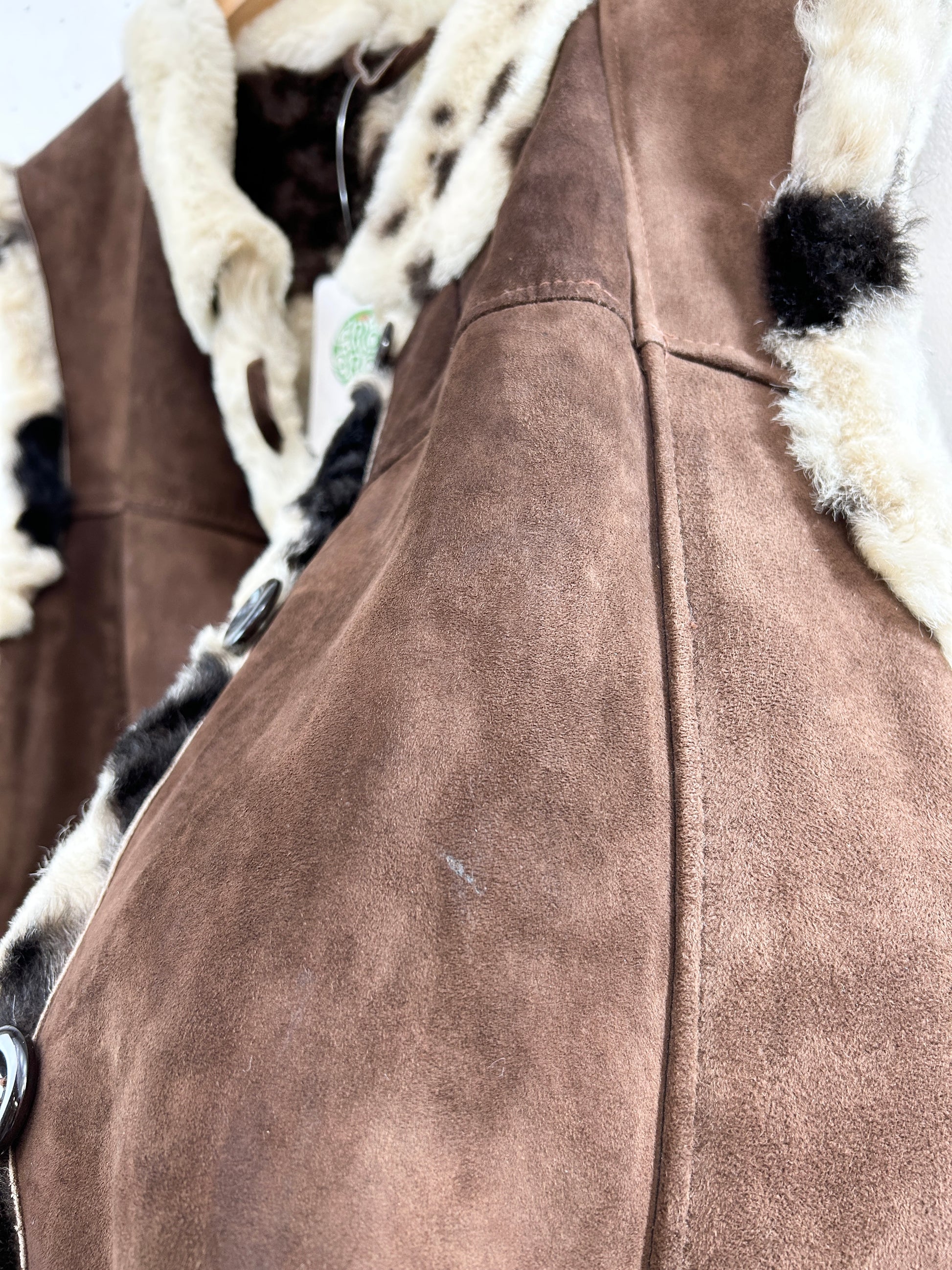 焦茶のスウェード、ブチの毛並みが意外と無く、素敵な1着。