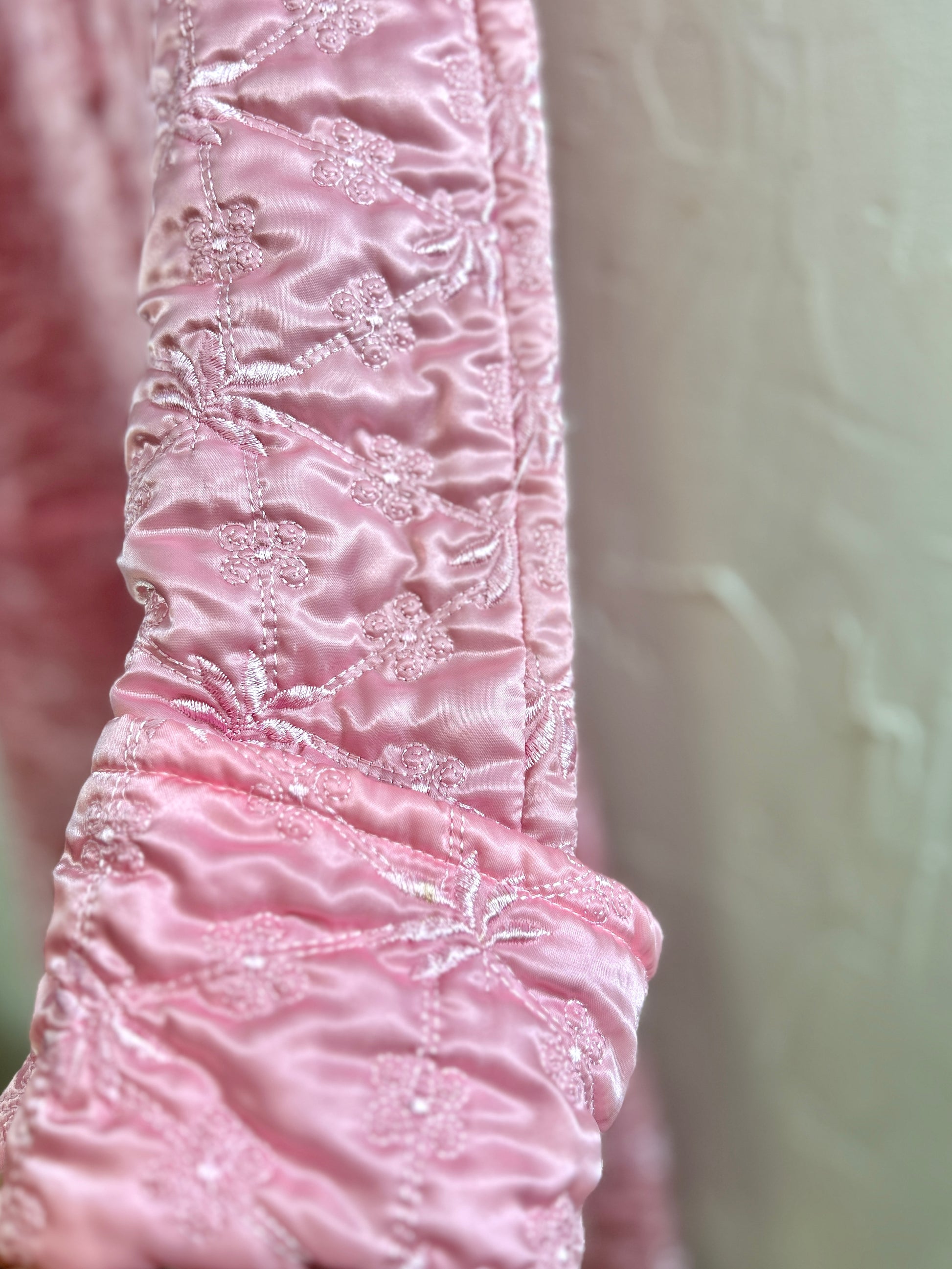 少し光沢のある素材感が華やかで、葉っぱのようなお花のようなステッチが非常に可愛いです。