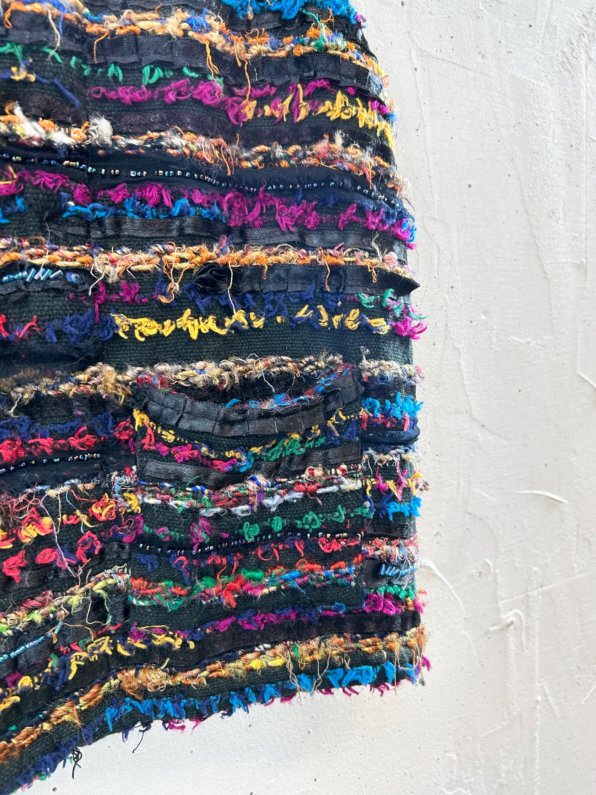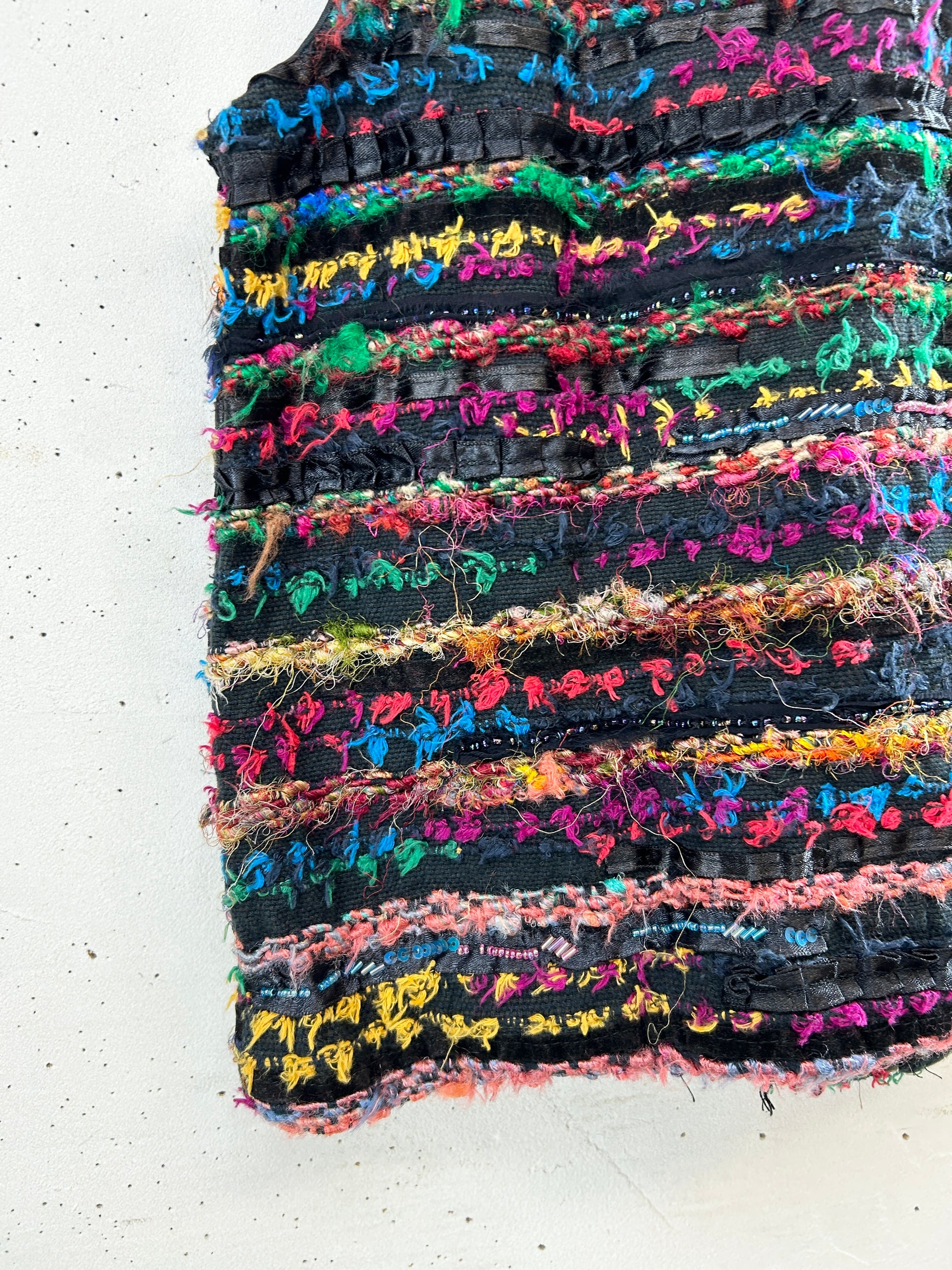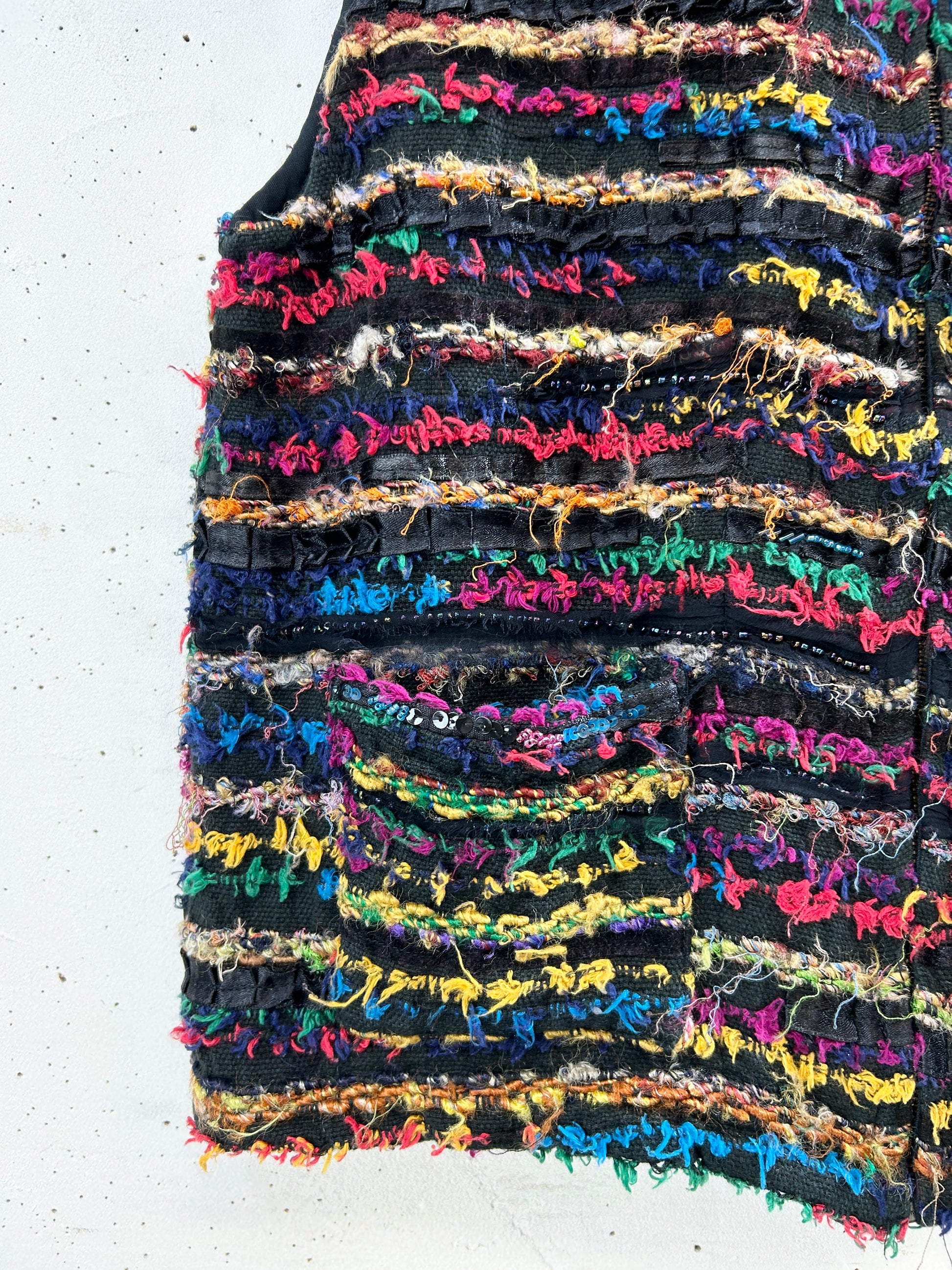 カラフルな毛糸やサテンテープ、ビーズやスパンコールと言った装飾がデザインされており非常に目を惹く1着です。