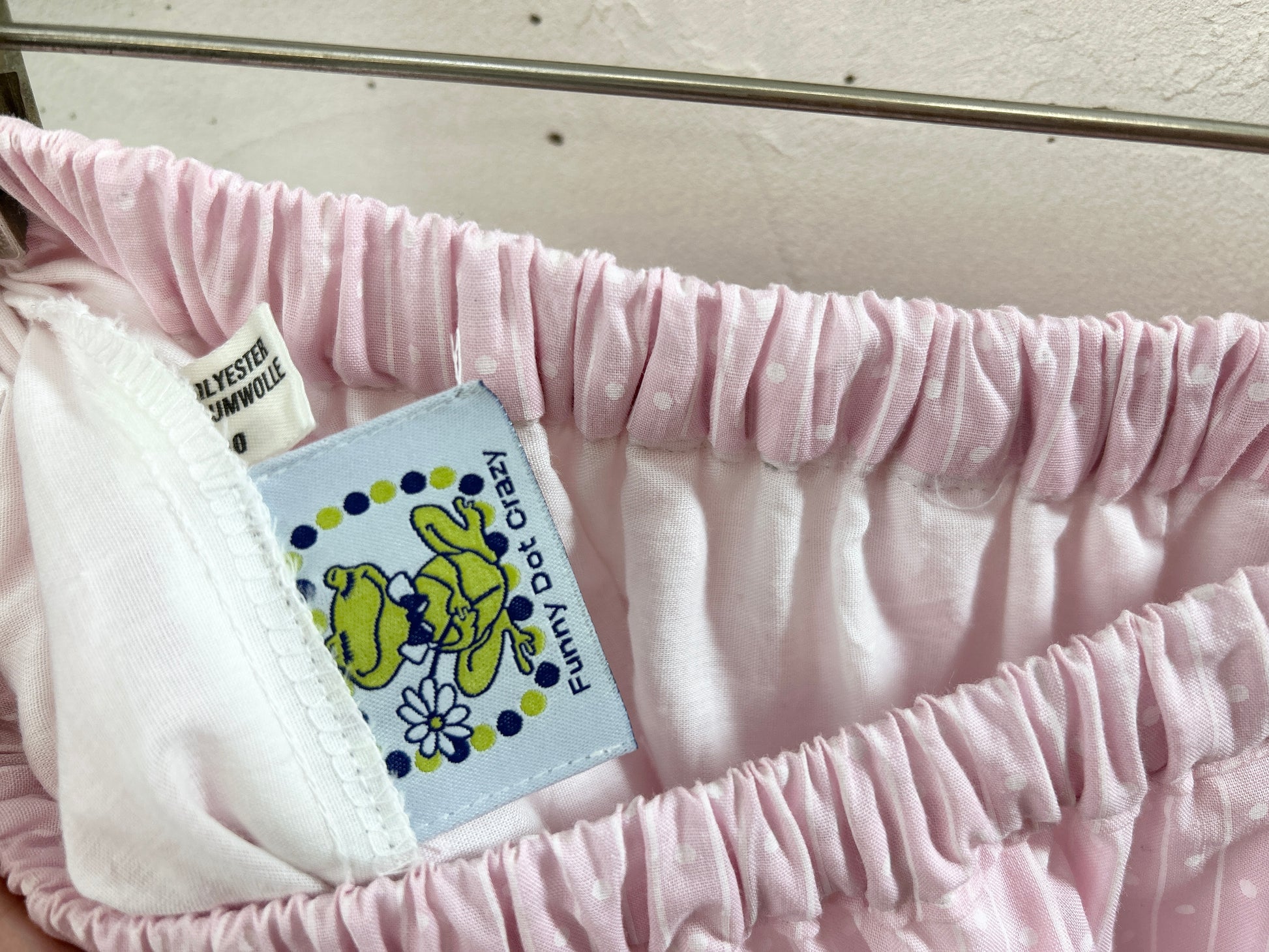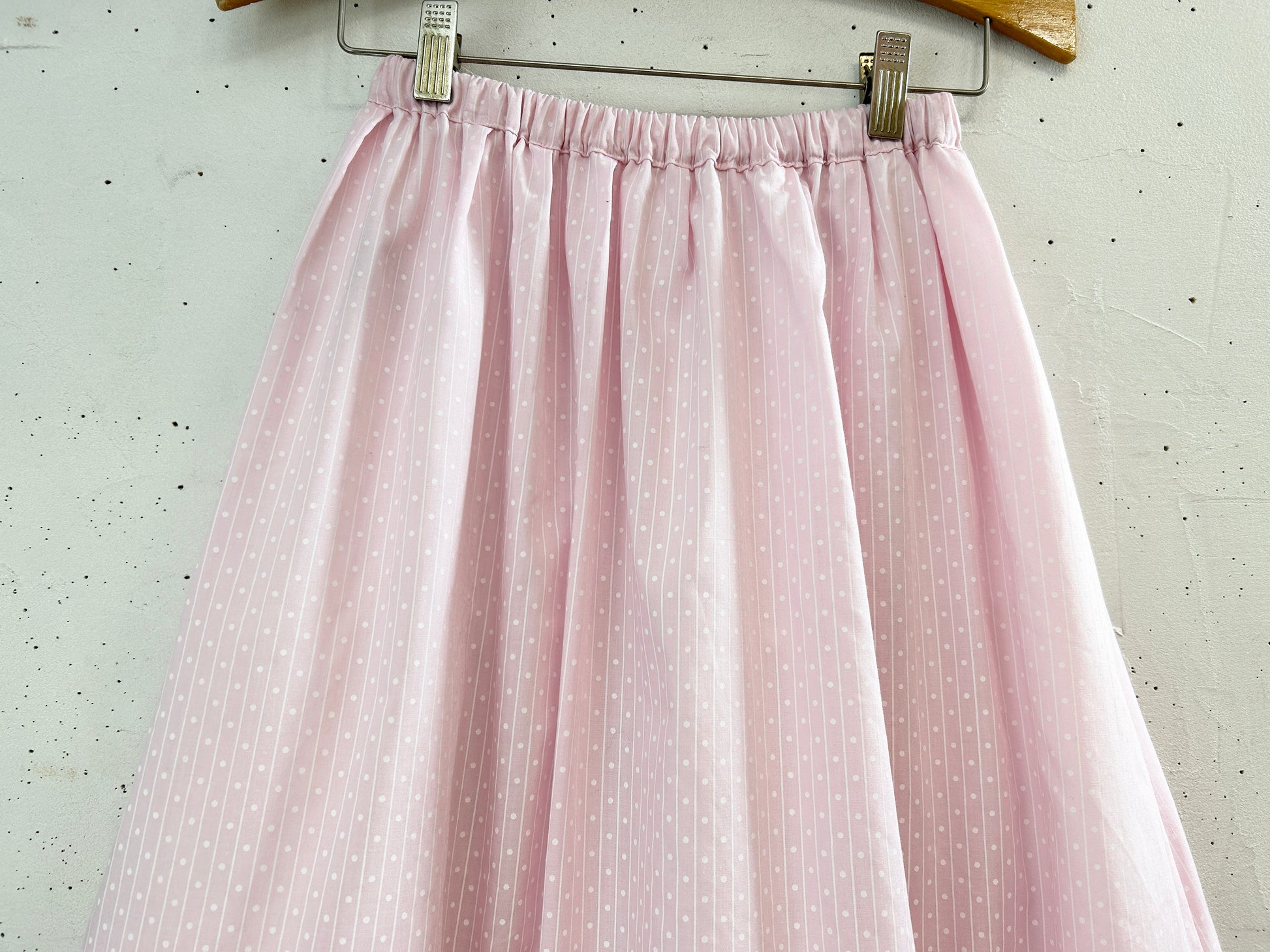 ピンク×白のピンドットストライプ柄の可愛い生地にホワイトレースのスカートが組み合わされたグッドピース。