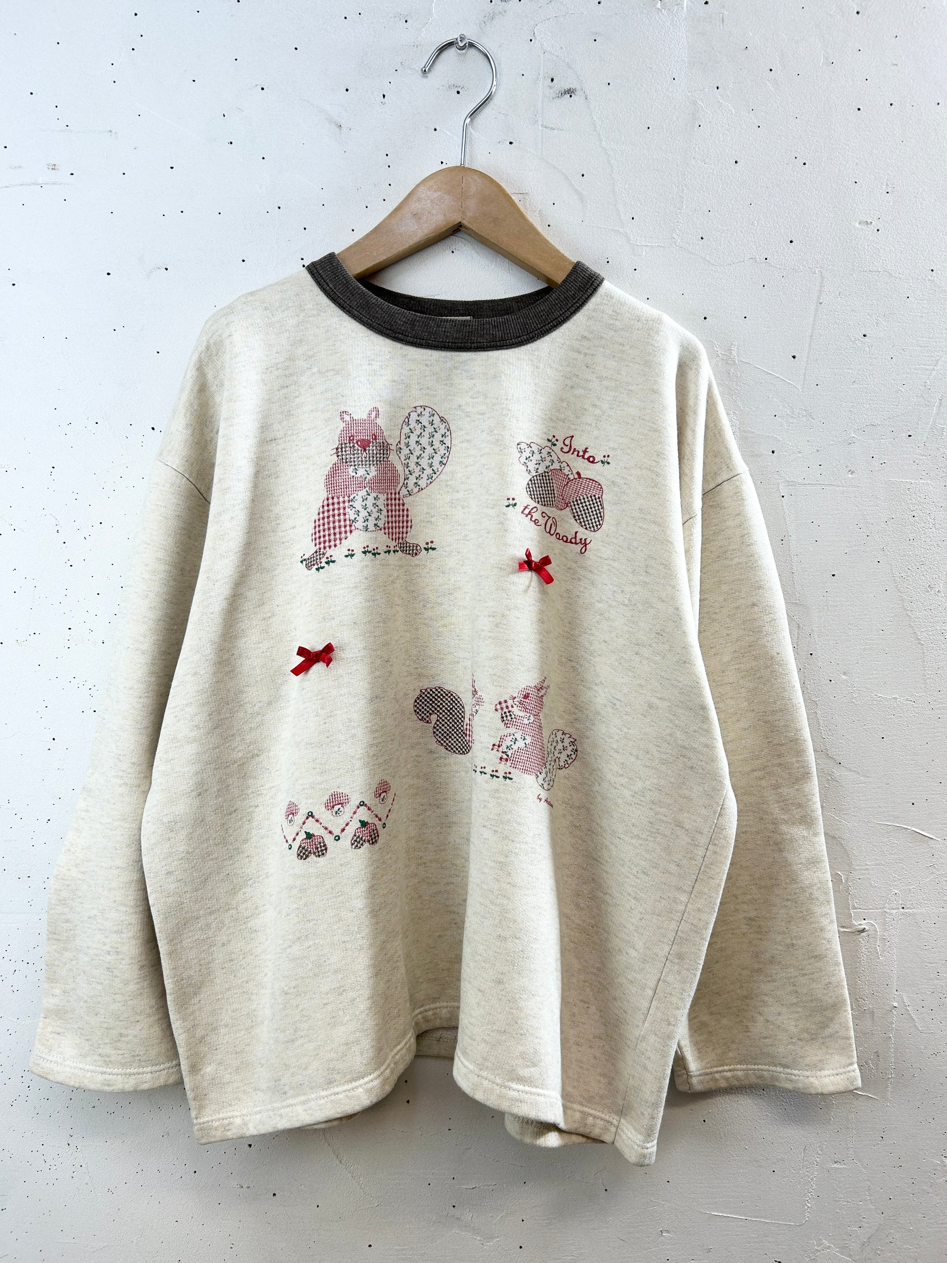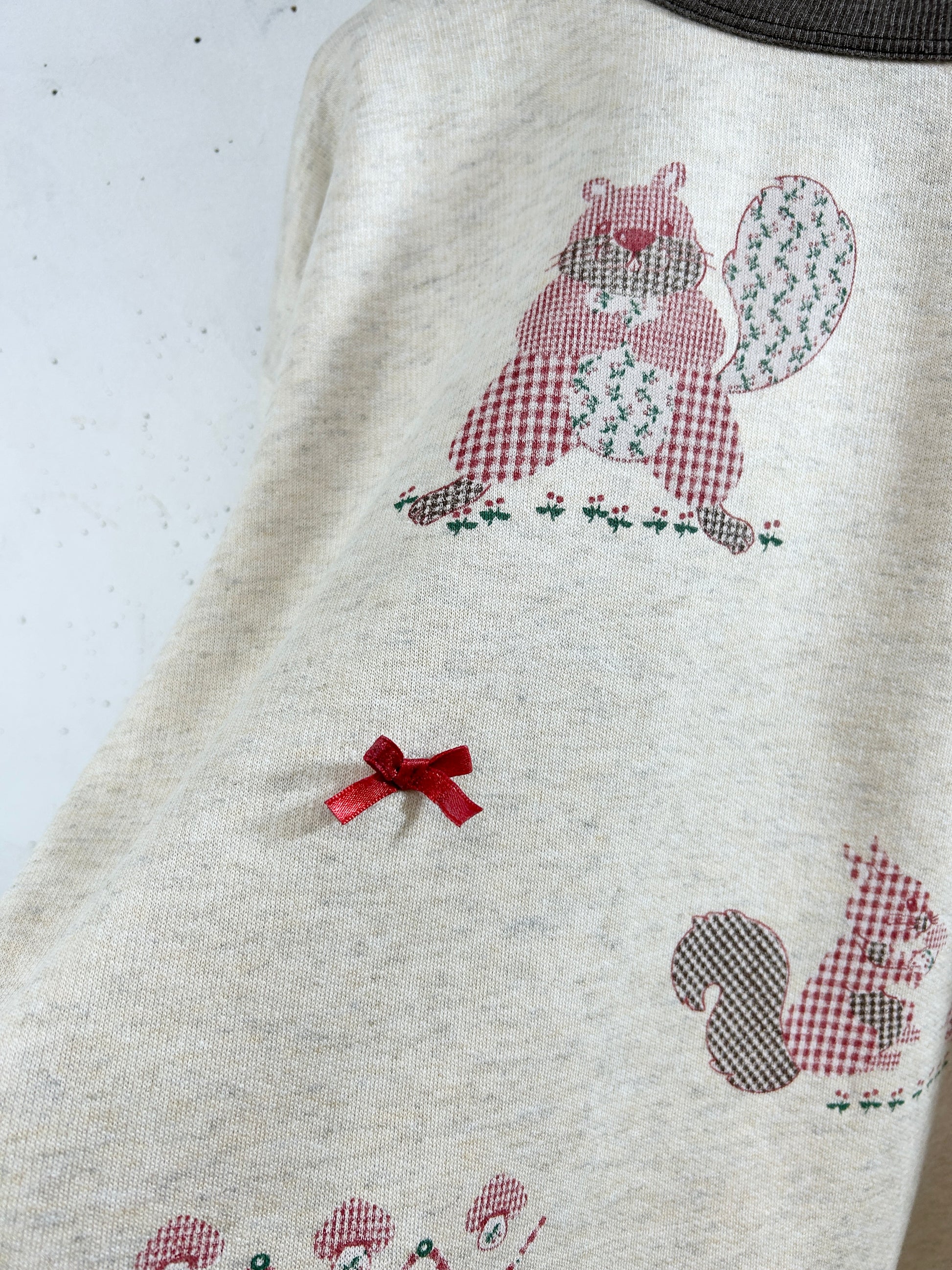ベージュ杢ボディ、リスのプリントとリボンが可愛いアイテム。