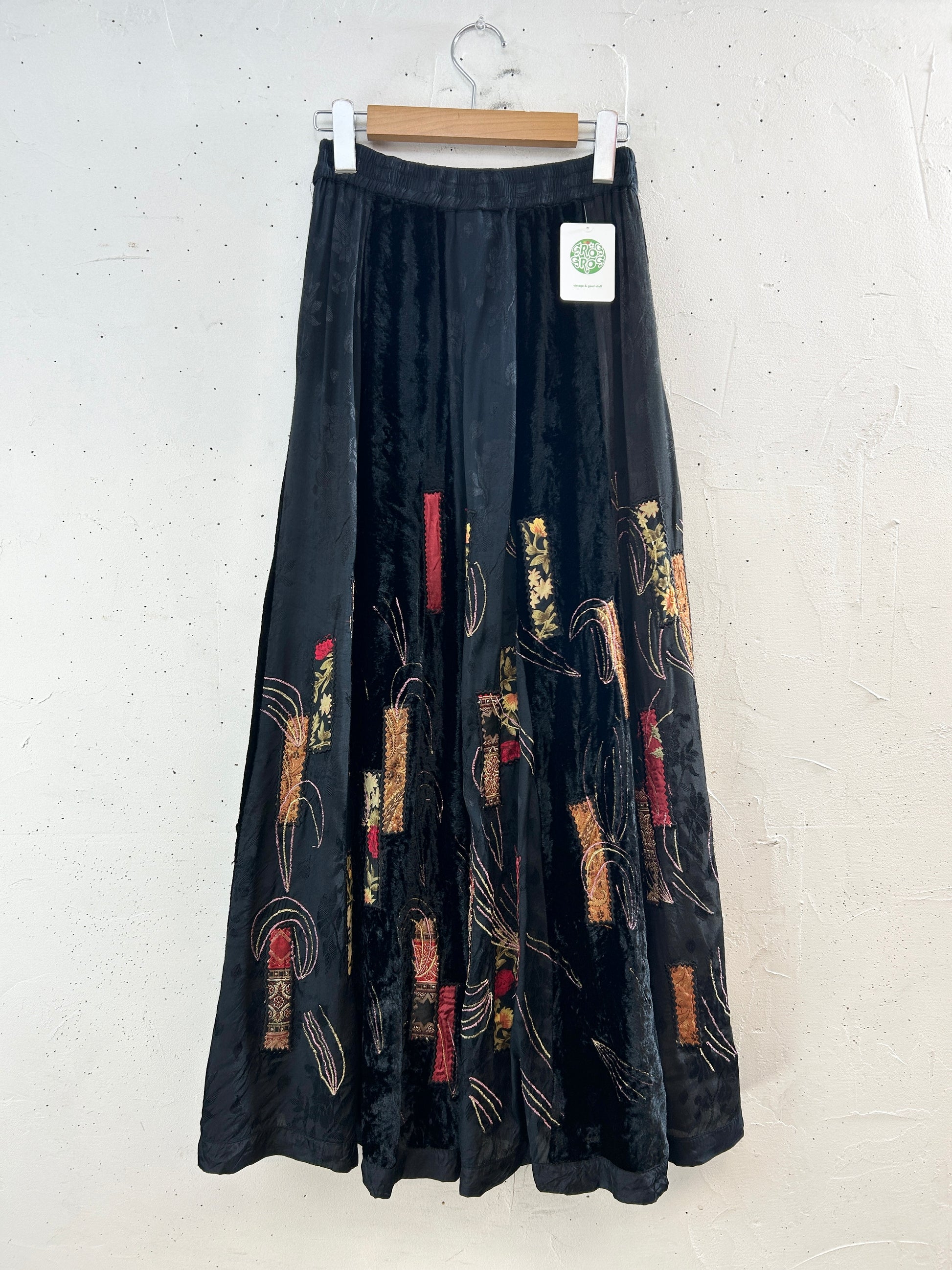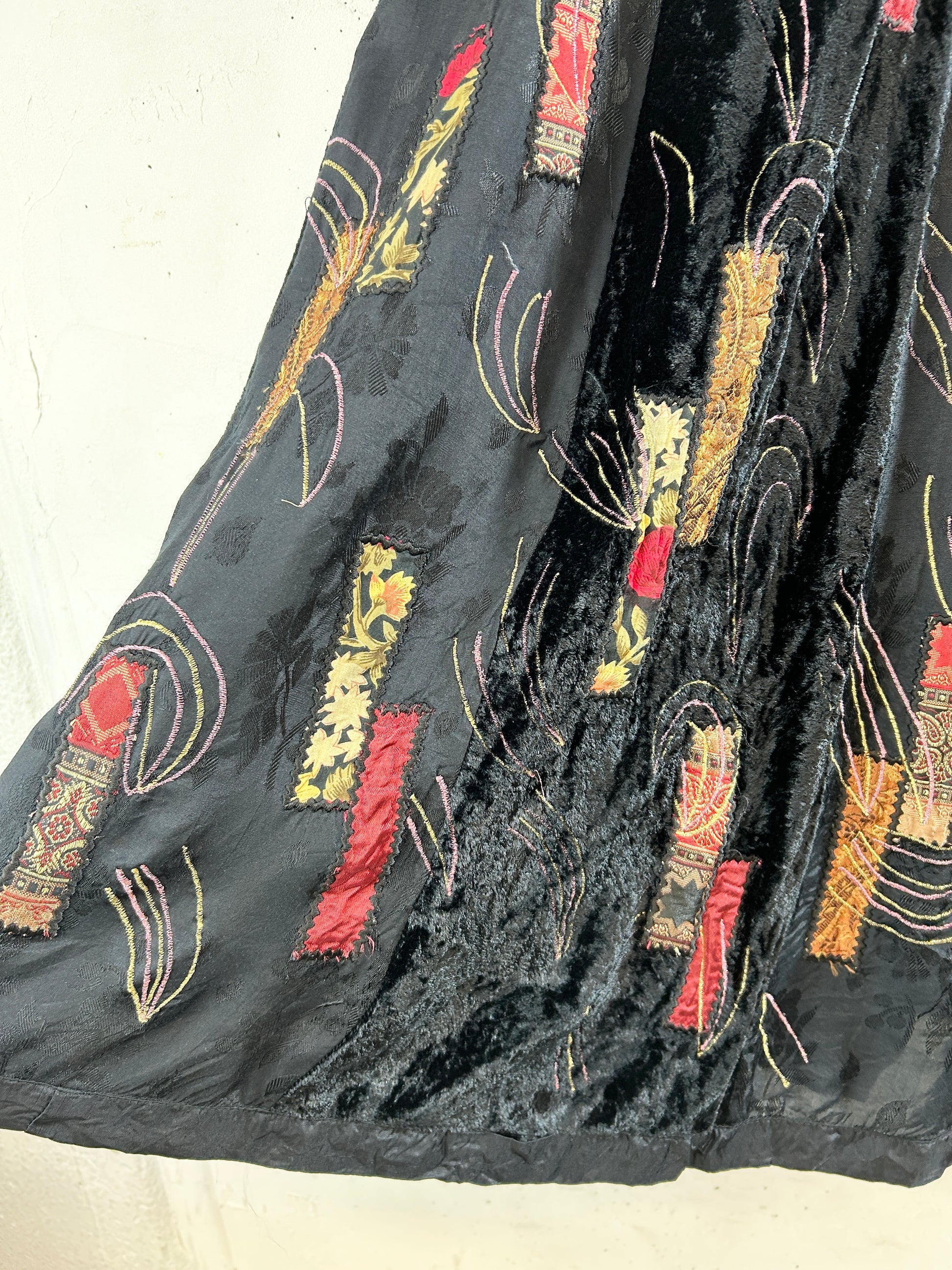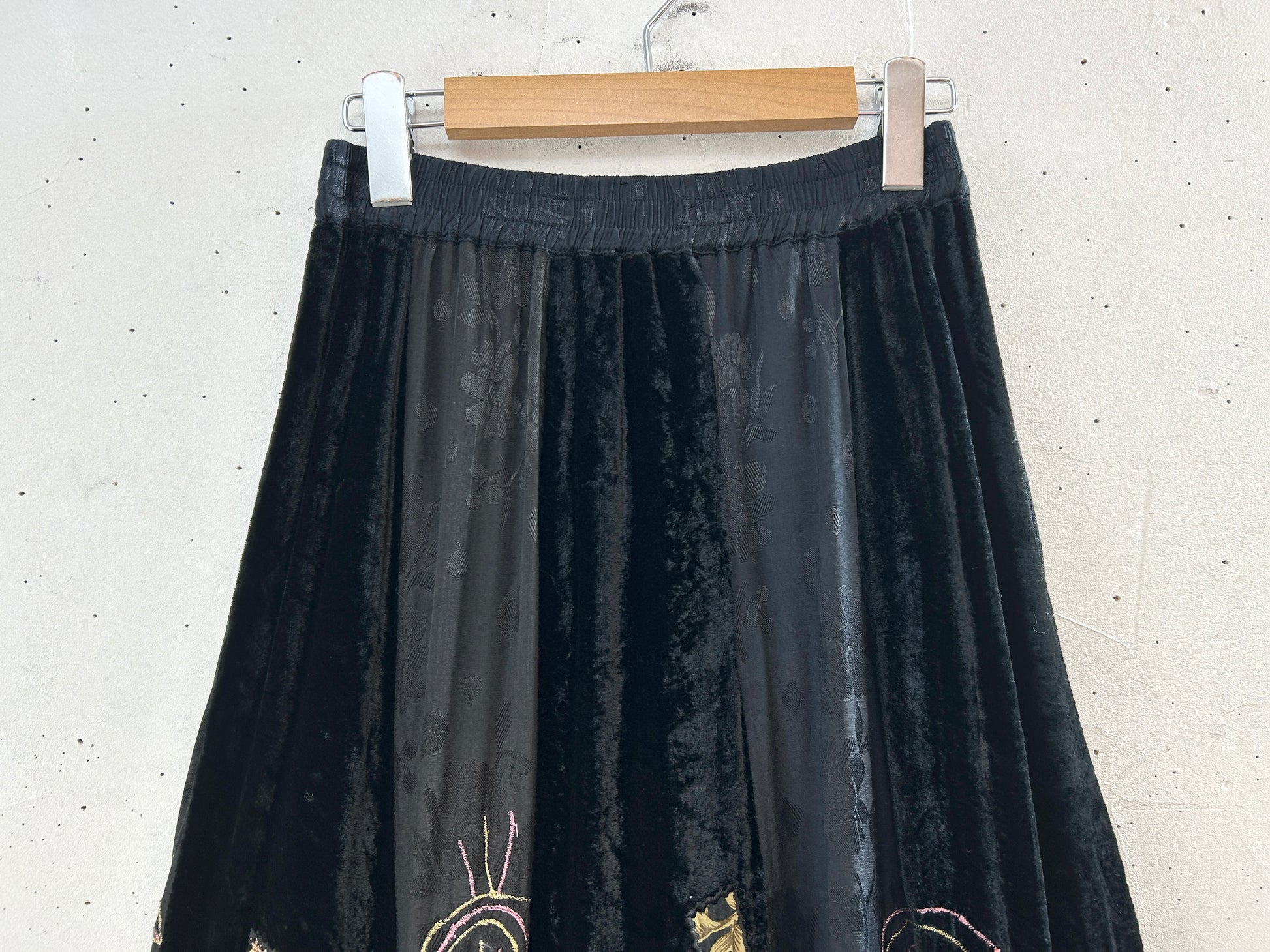 ベロアとレーヨン生地の異素材の組み合わせが雰囲気抜群のアイテム。お花の生地のパッチや刺繍等装飾もとても素敵です。