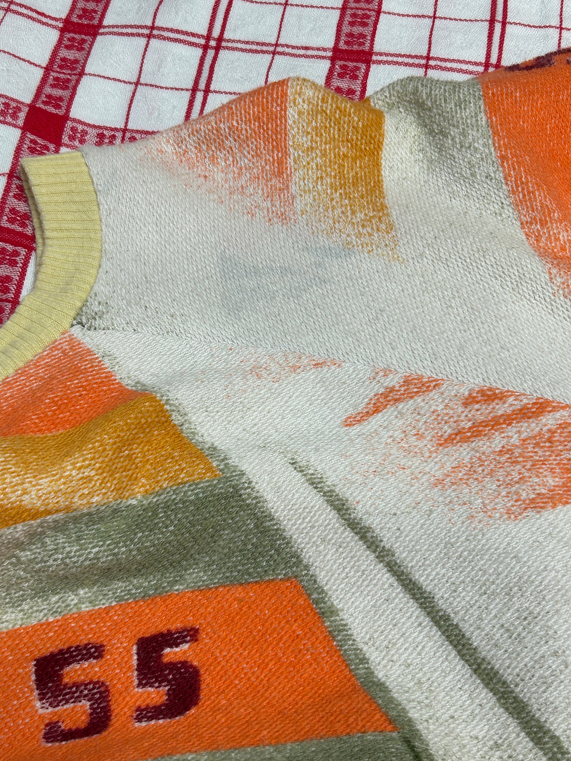 コンディション:袖や裾リブ、身頃に青や赤の色移りがございますが大きく気にせず着用頂けます。その他特筆するほど目立つダメージもなく、ビンテージにご理解頂いている方でしたら気にせずご着用頂ける程度かと思われます。