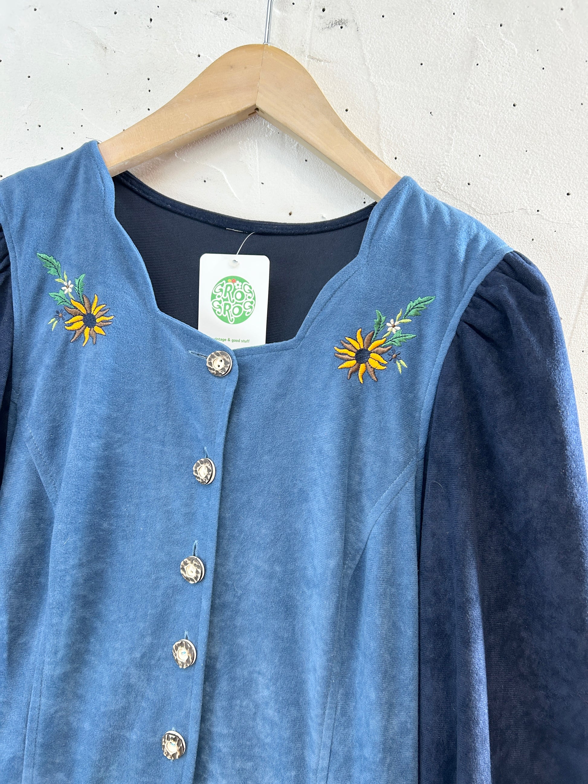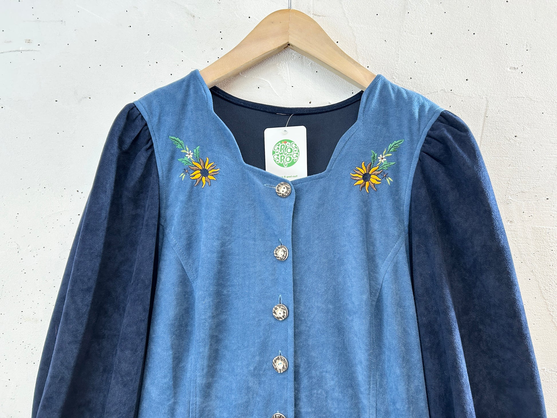 シックな雰囲気のこちらのドレスはネイビーとくすみブルーの切り替え、花の刺繍が素敵な1着。