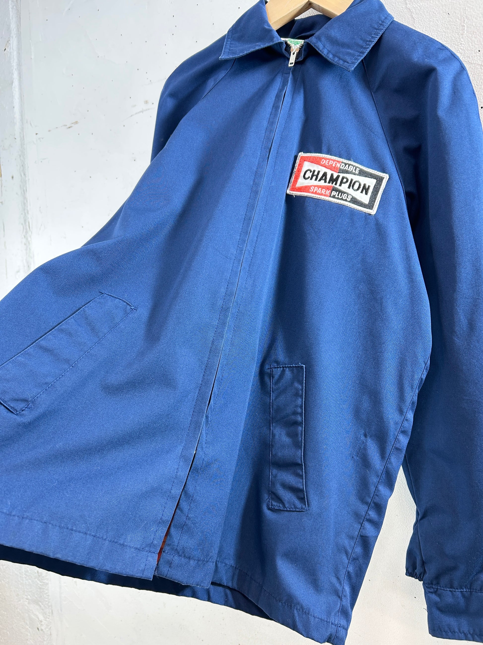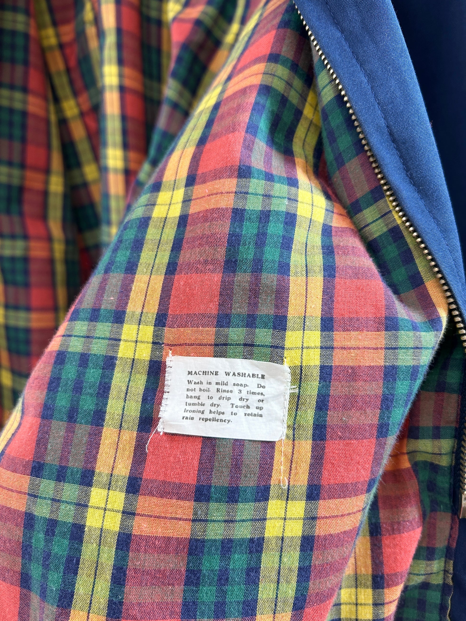 ネイビーボディ、裏がチェックのジャケットにワッペンが施されたアイテム。