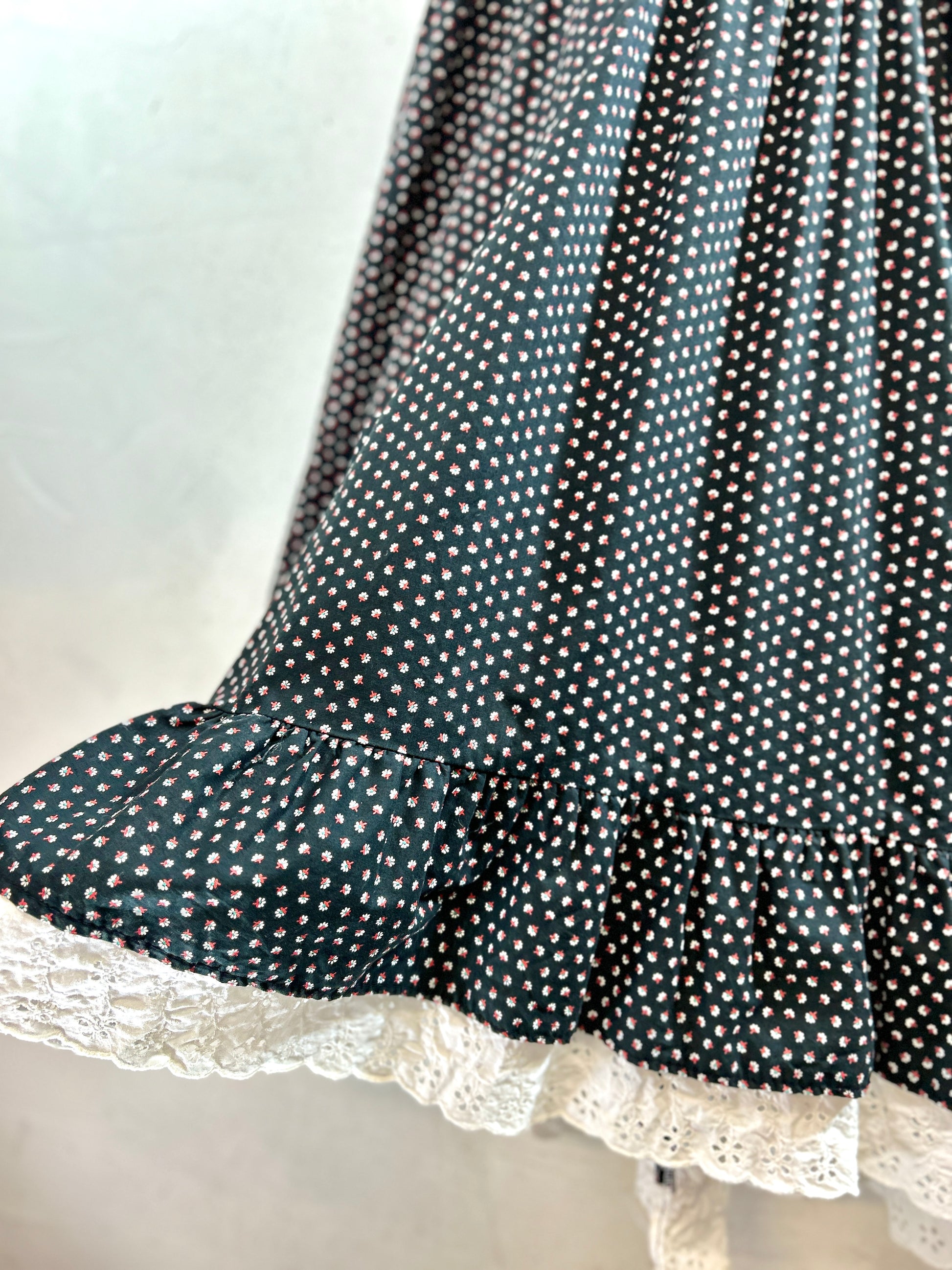ブラックボディに小花柄とレースが可愛らしく、ラップワンピースデザインにもなり、レイヤードアイテムとして季節問わずお使い頂けます。