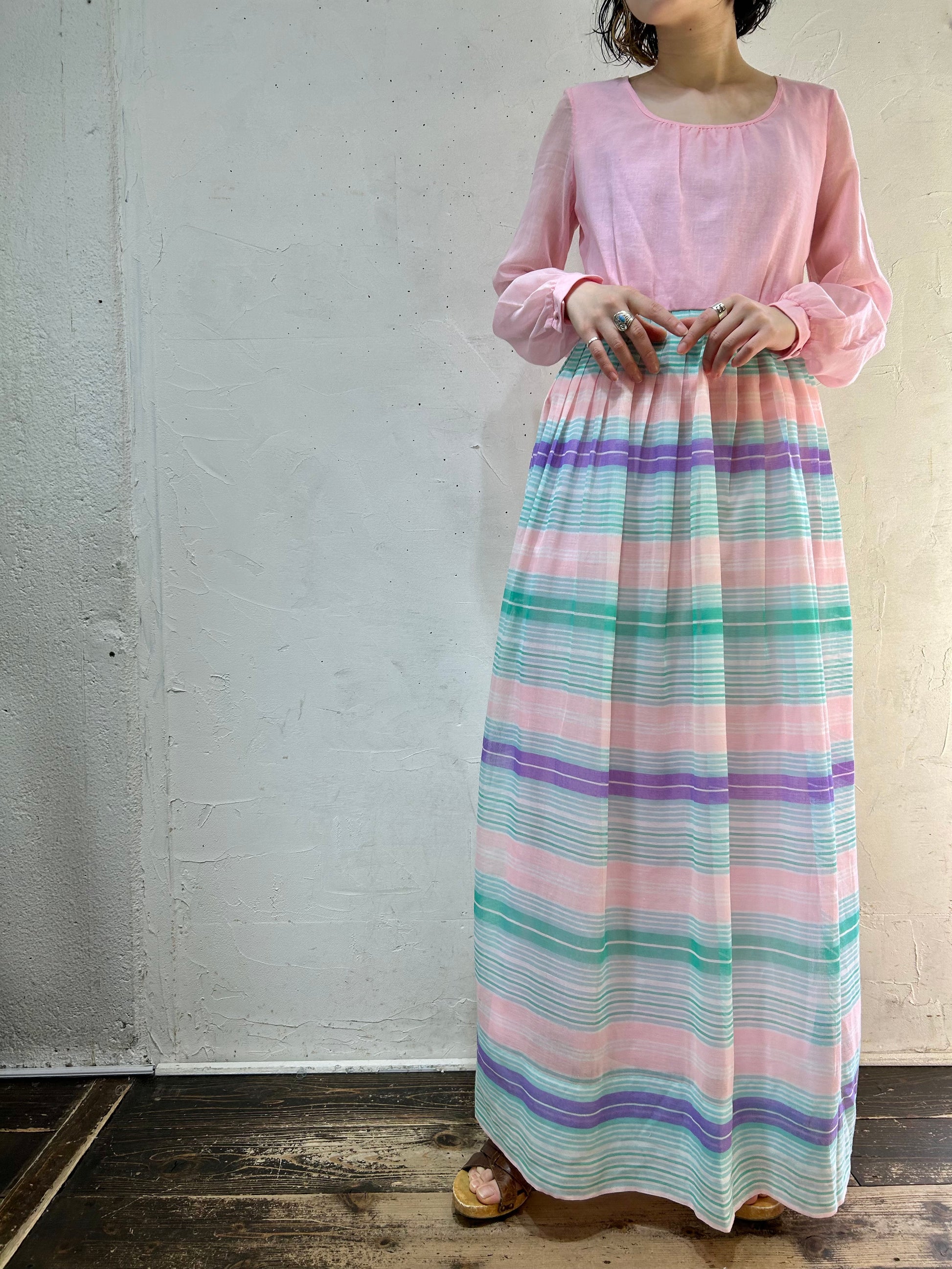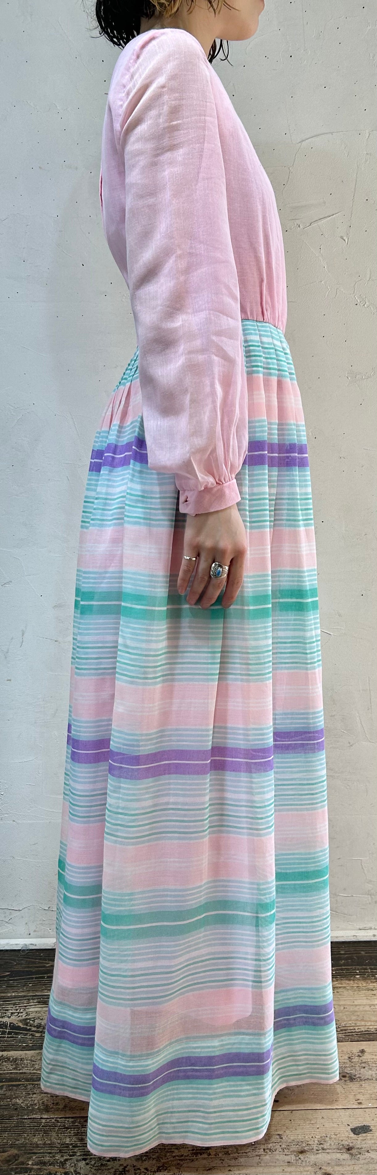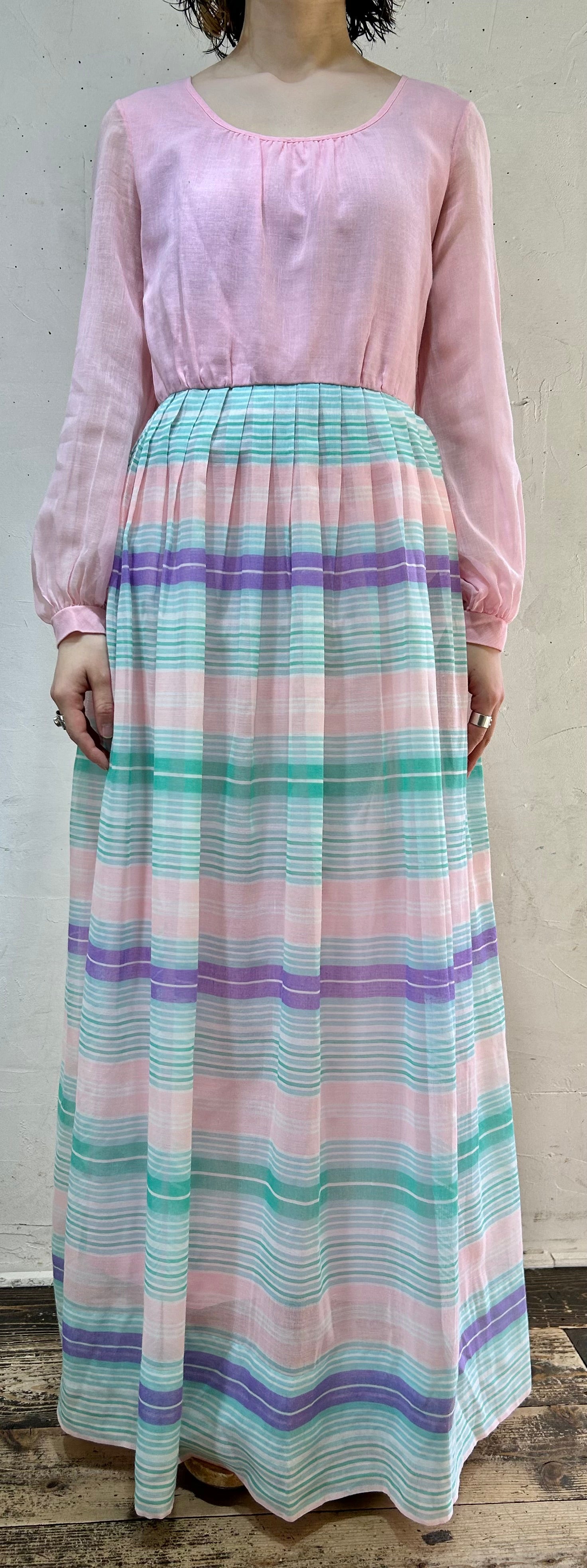 size:表記不明、肩幅36cm、身幅42cm、ウエスト切替63cm、袖丈57cm、ウエスト切替〜裾100cm、着丈135cm