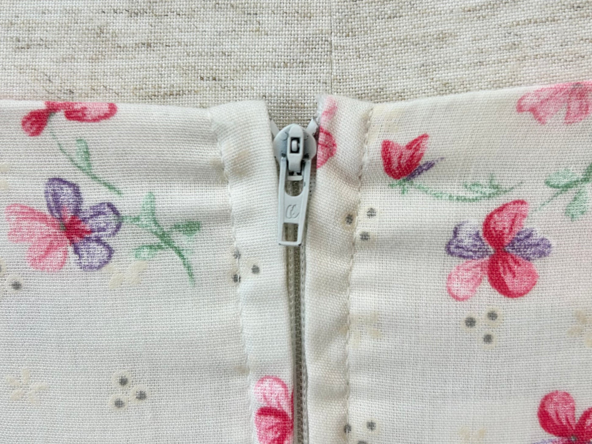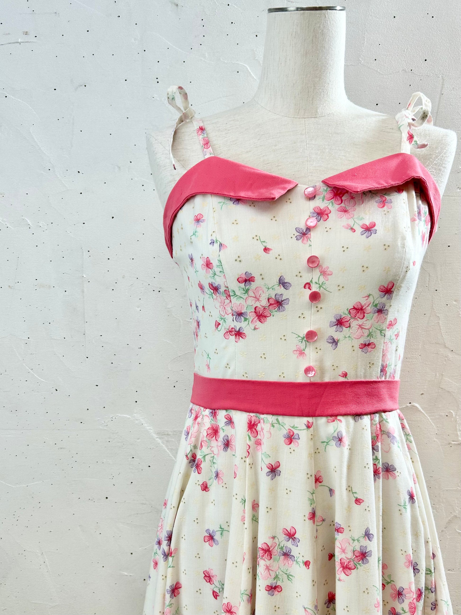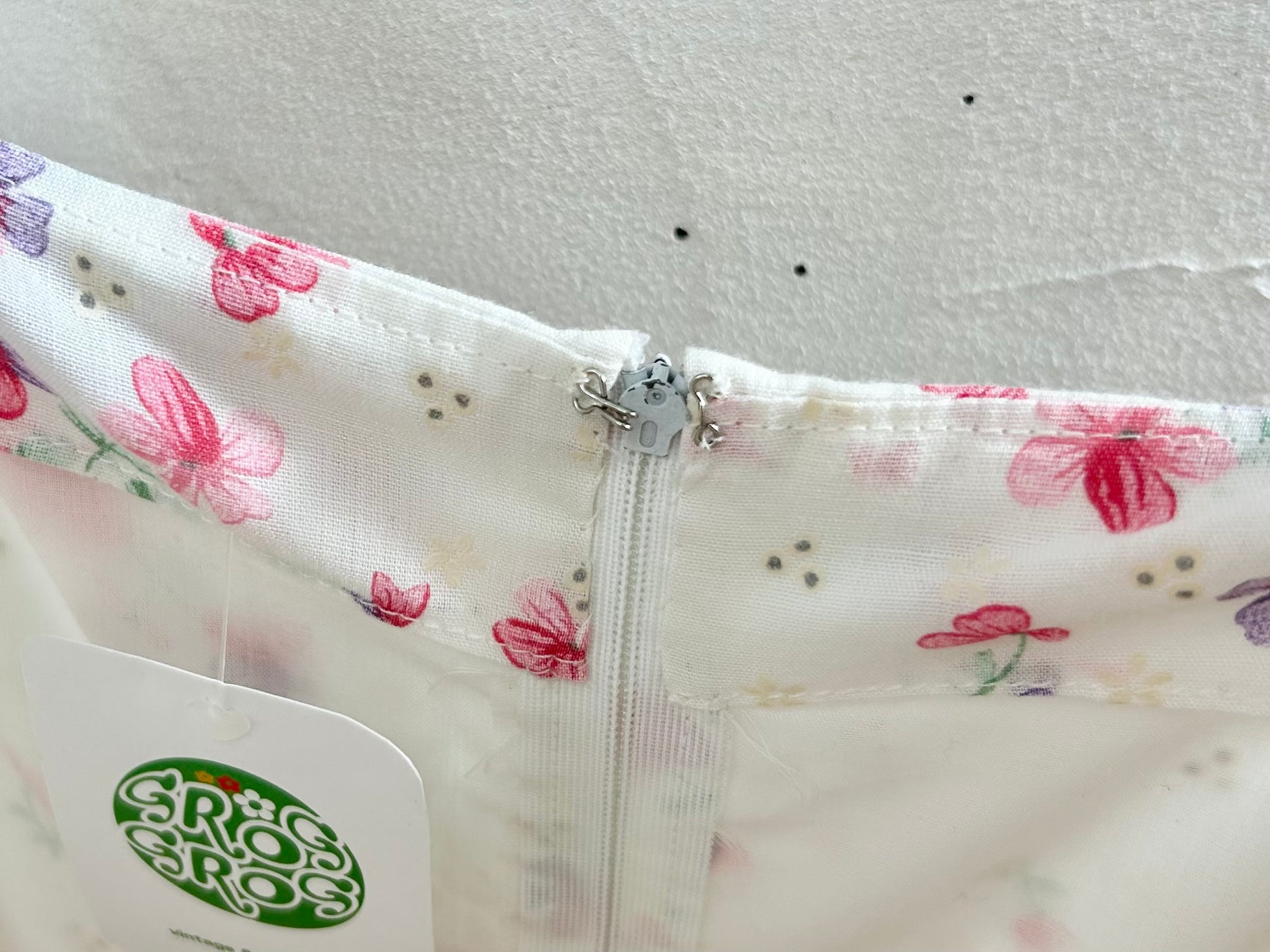 ホワイトボディーにレースをイメージしたプリントとピンクの花柄の組み合わせが非常に可愛らしい1着。