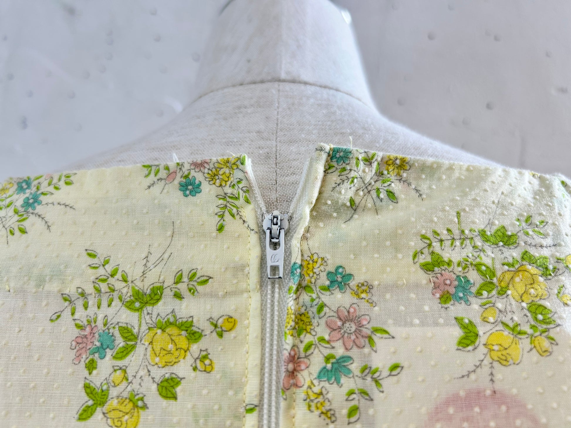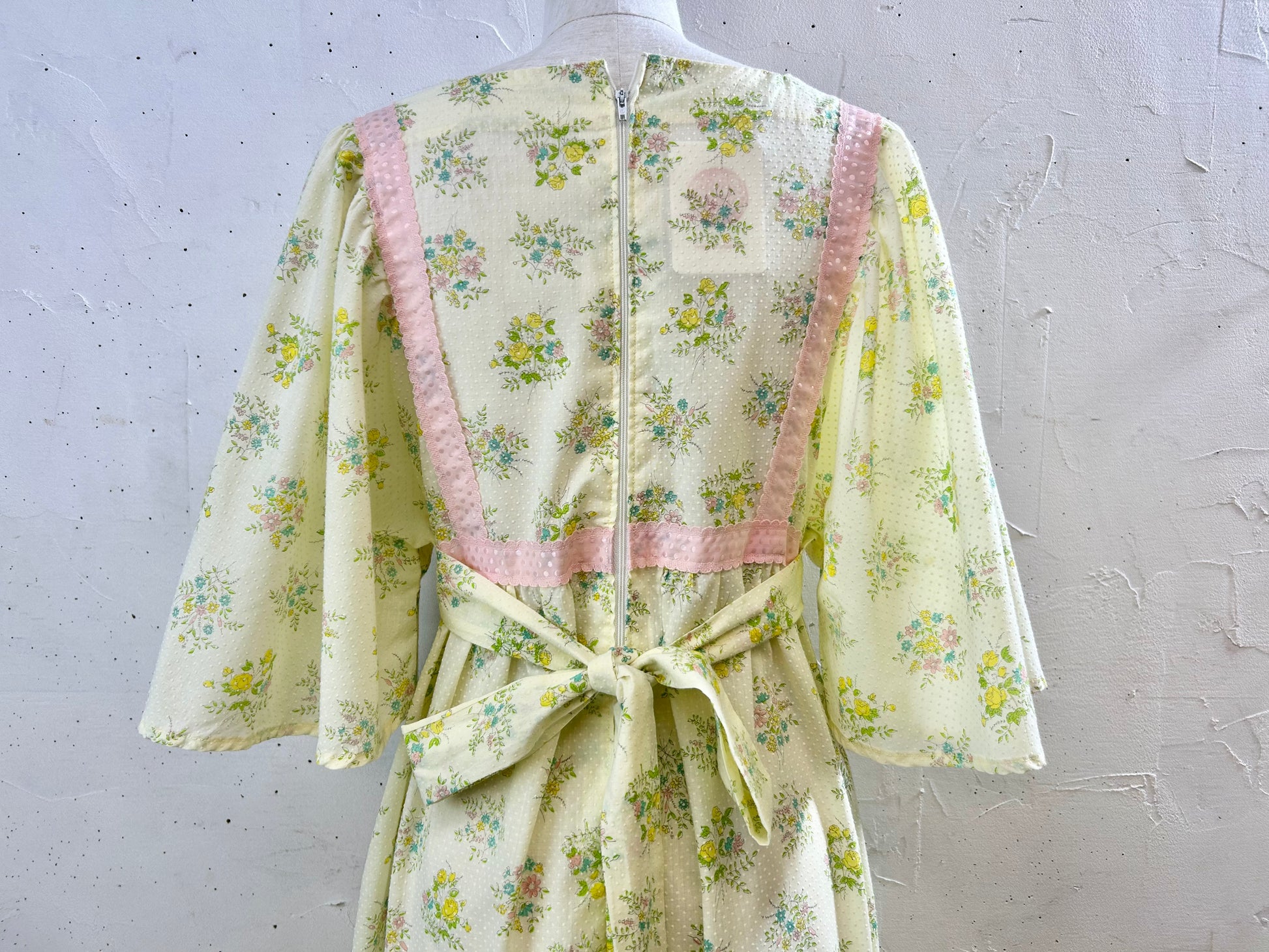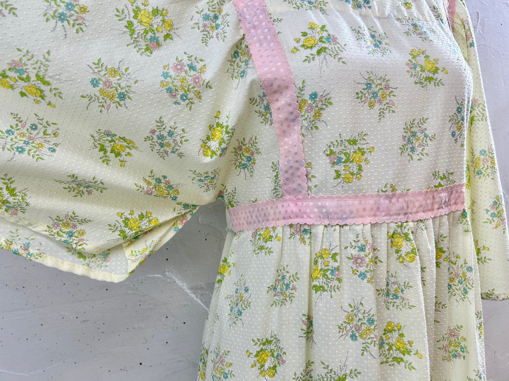 ピンドットのフロッキープリントにパステルカラーのフラワープリントがとても可愛らしい一着。