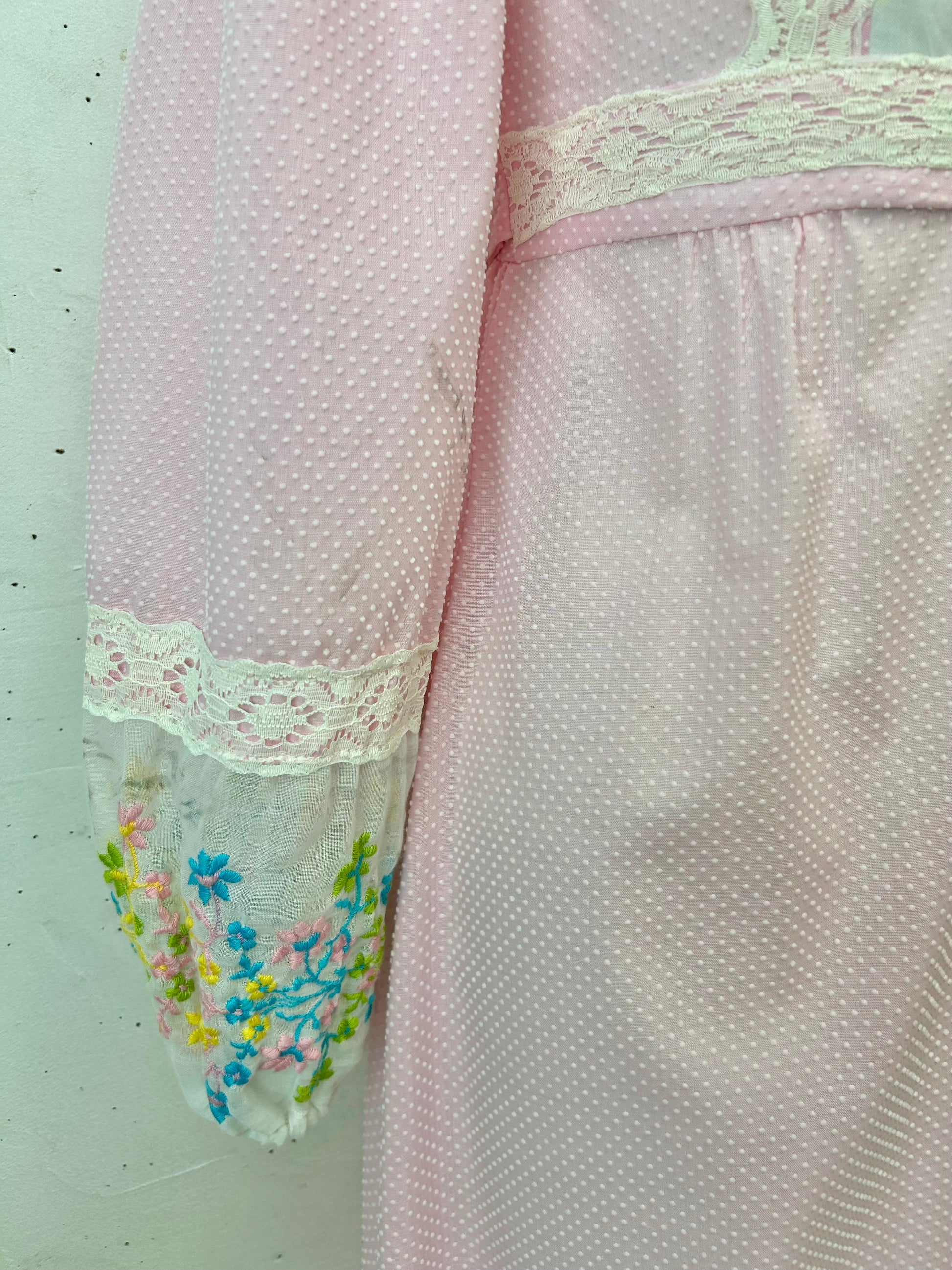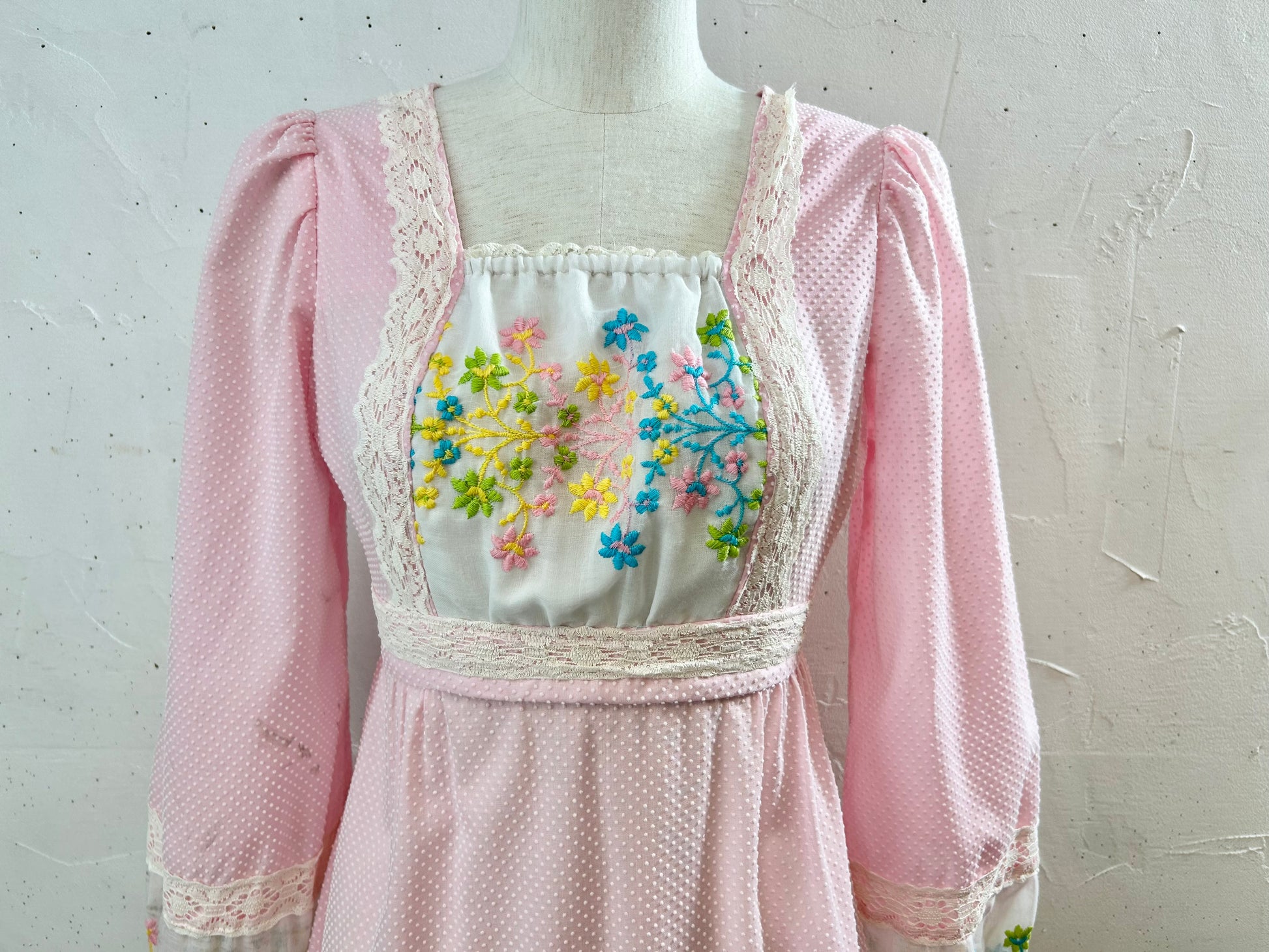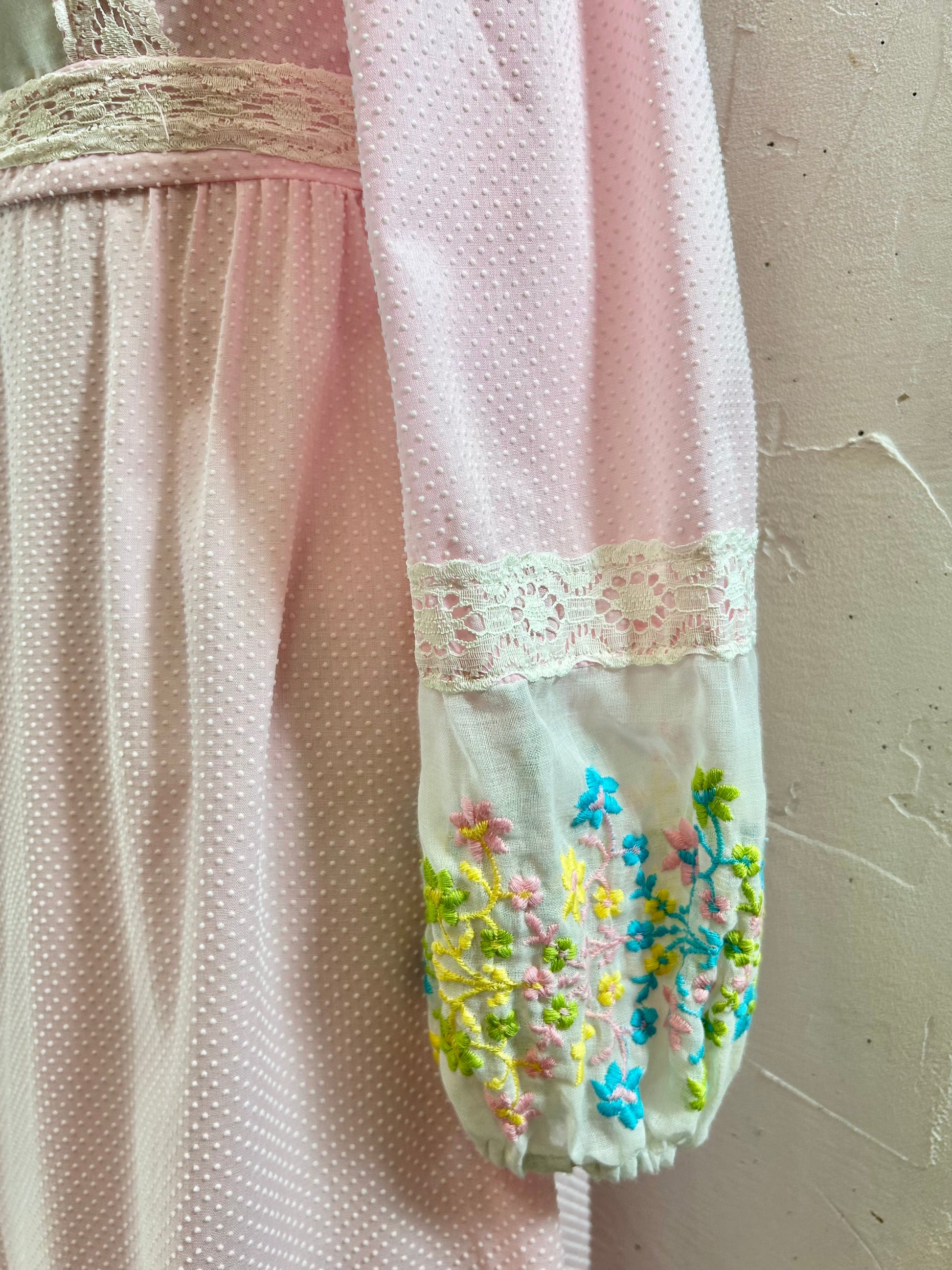 ピンドットのフロッキープリントのボディに、カラフルなフラワー刺繍がとても華やかな一着。