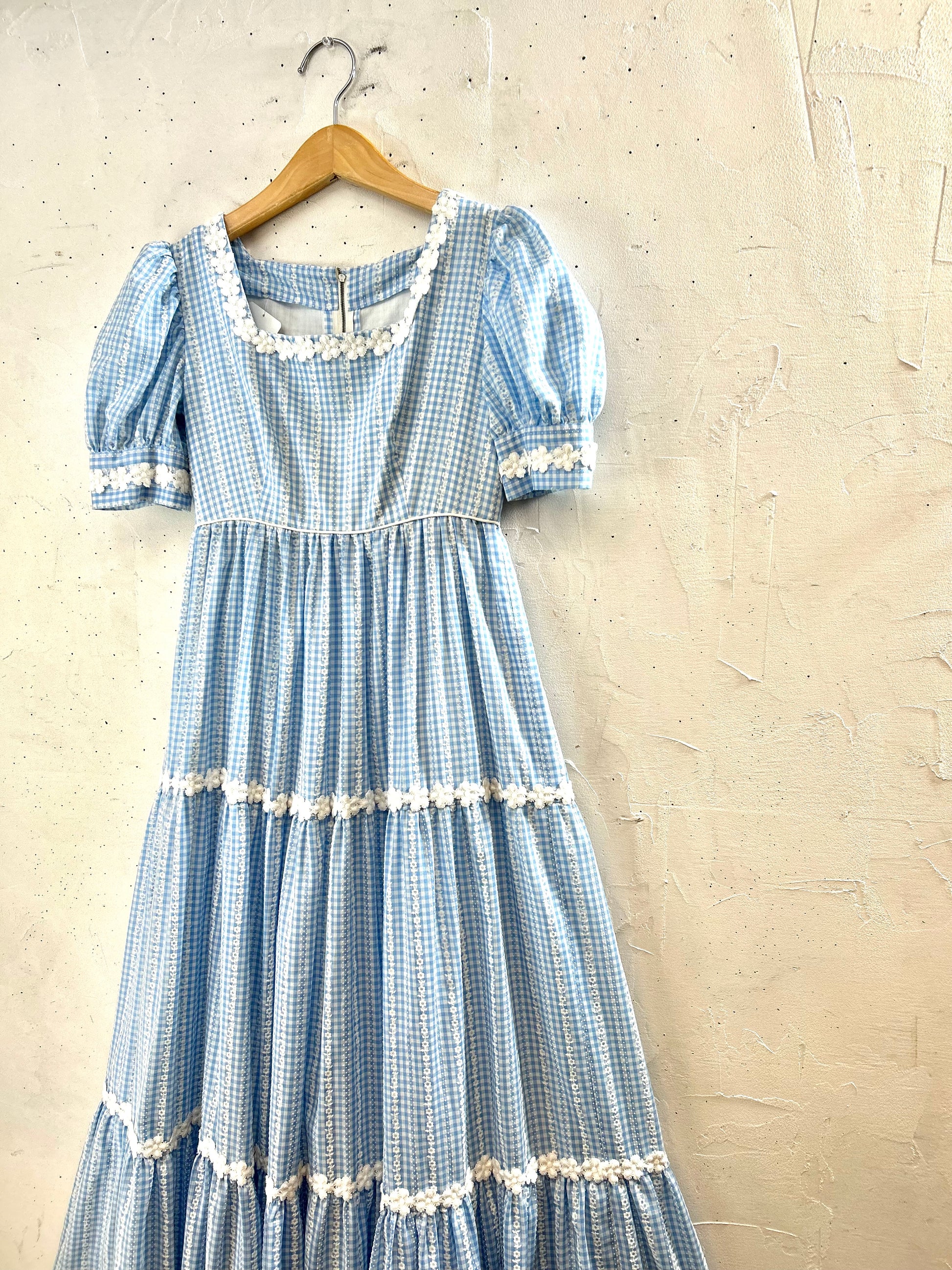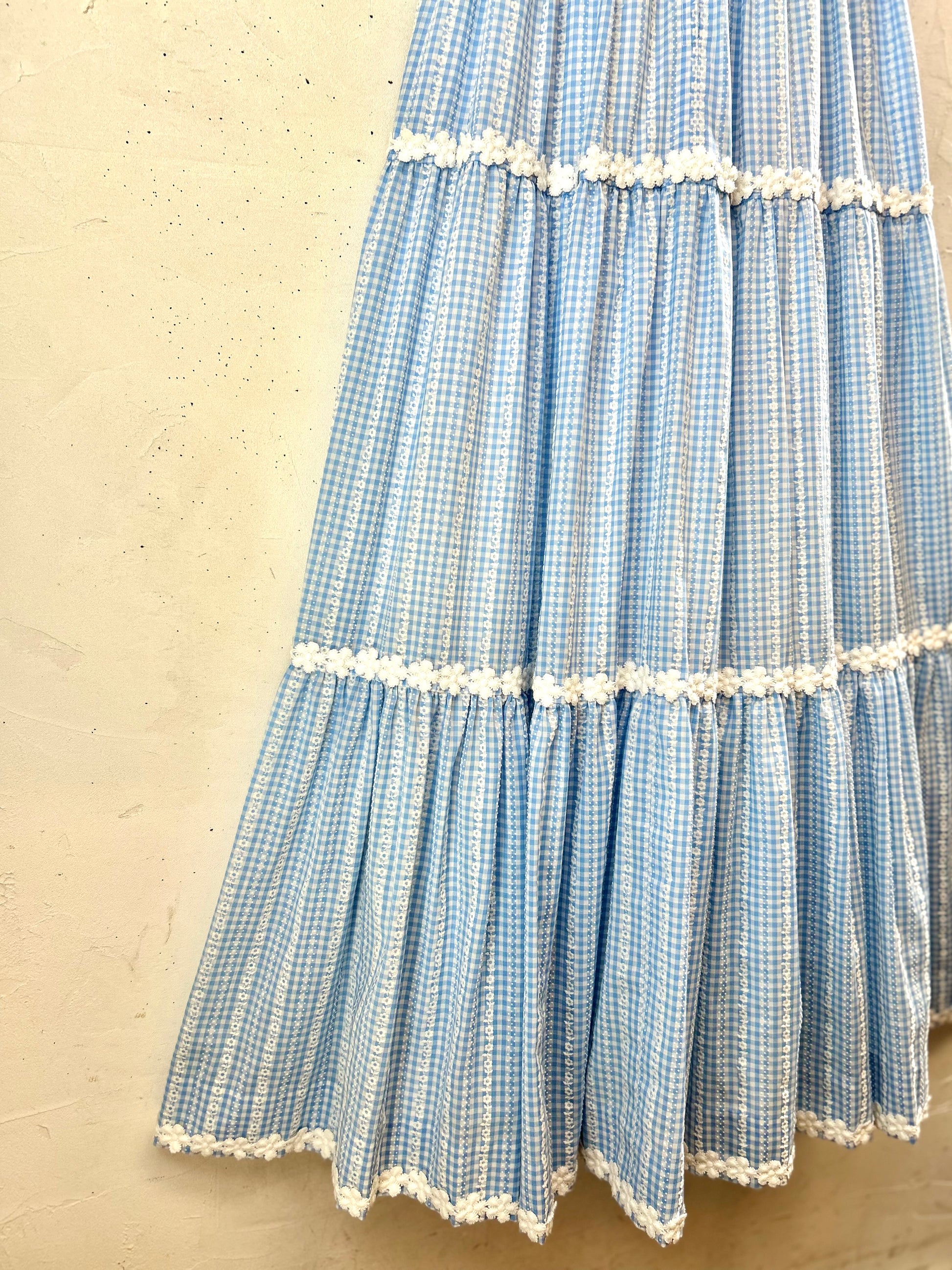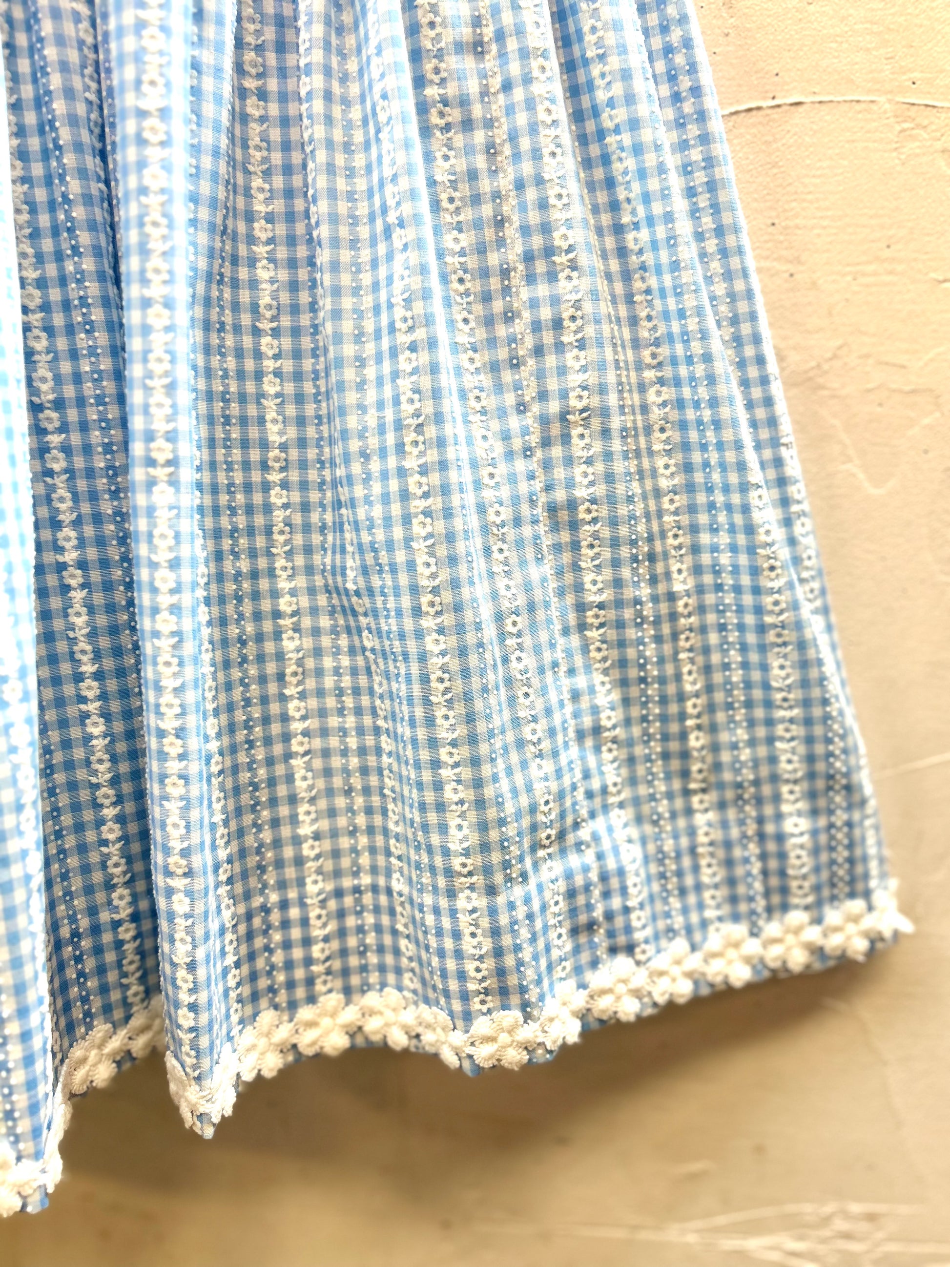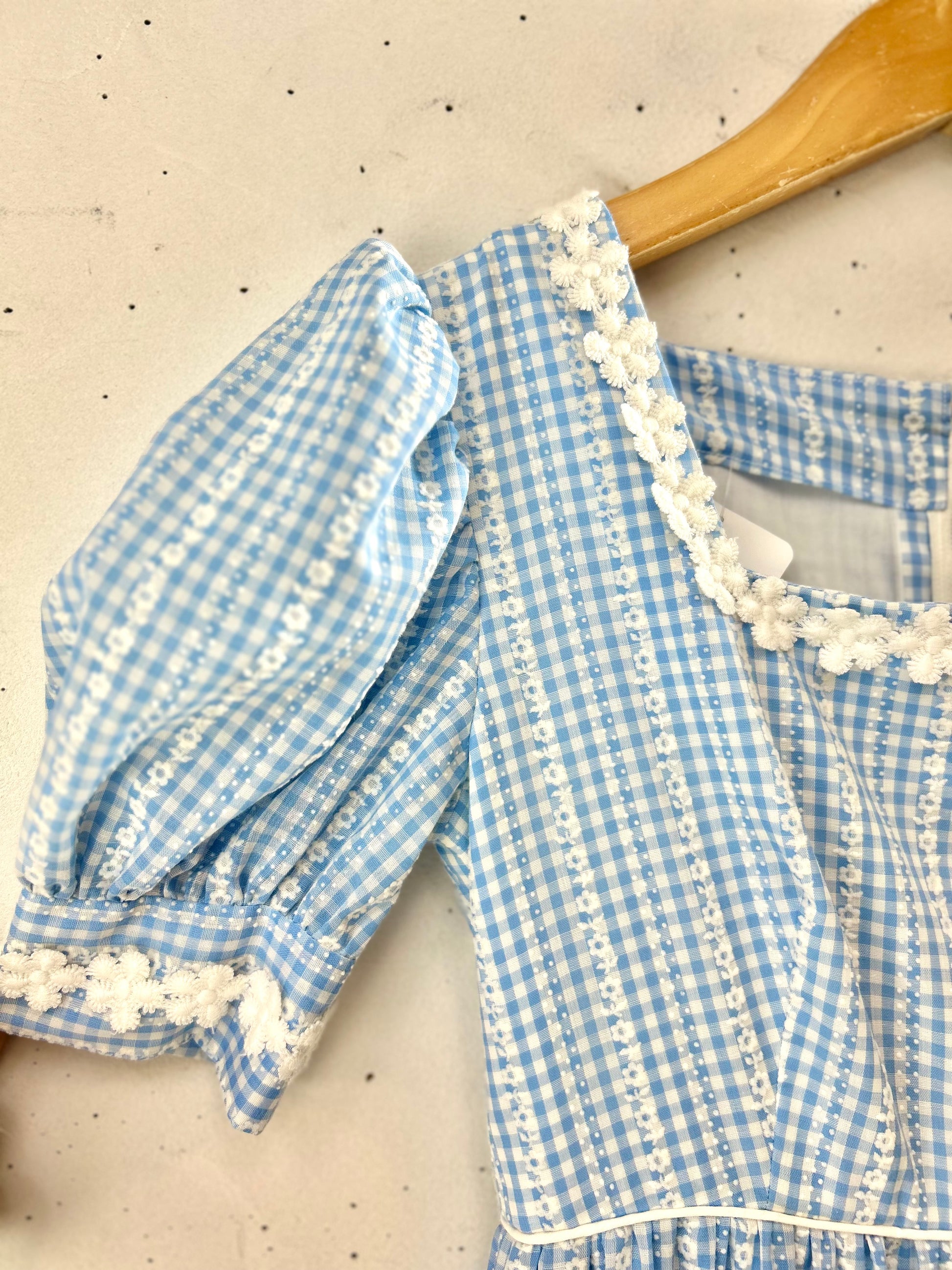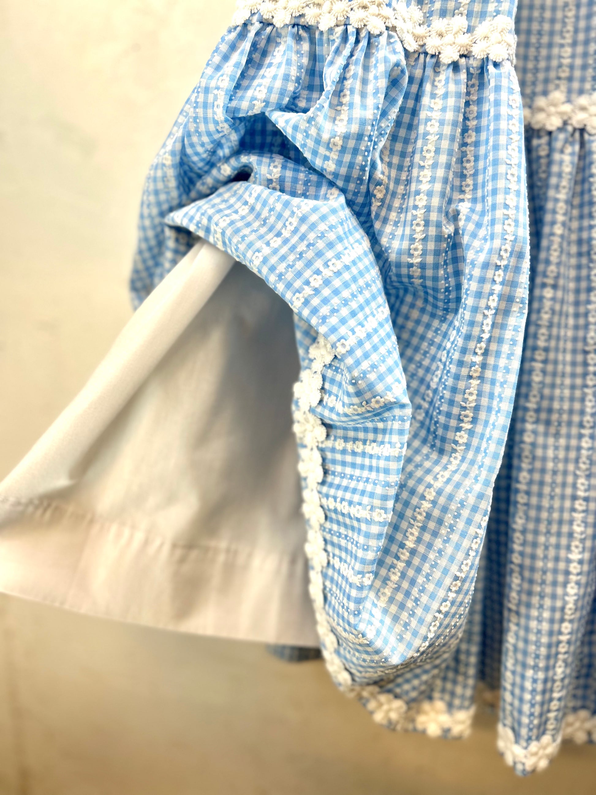 伝統的なギンガムチェックに立体感のあるホワイトフラワーとドットが施され、ティアードのシルエットと相まって、とても品があり現代でも世界的に人気の高いアイテムとなっております。