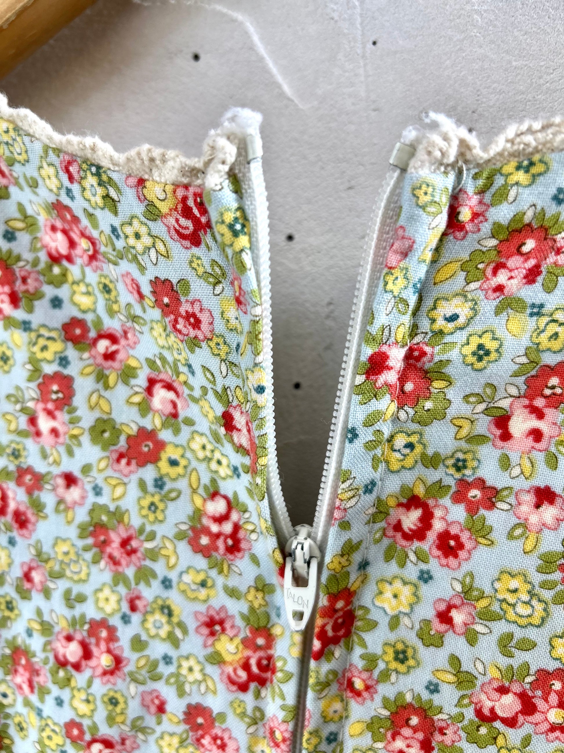 柔らかなミントブルーの華やかなフラワーパターンボディに、前たての様なレース&リボンがとても可愛く、デザイン性の豊かなアイテムです。