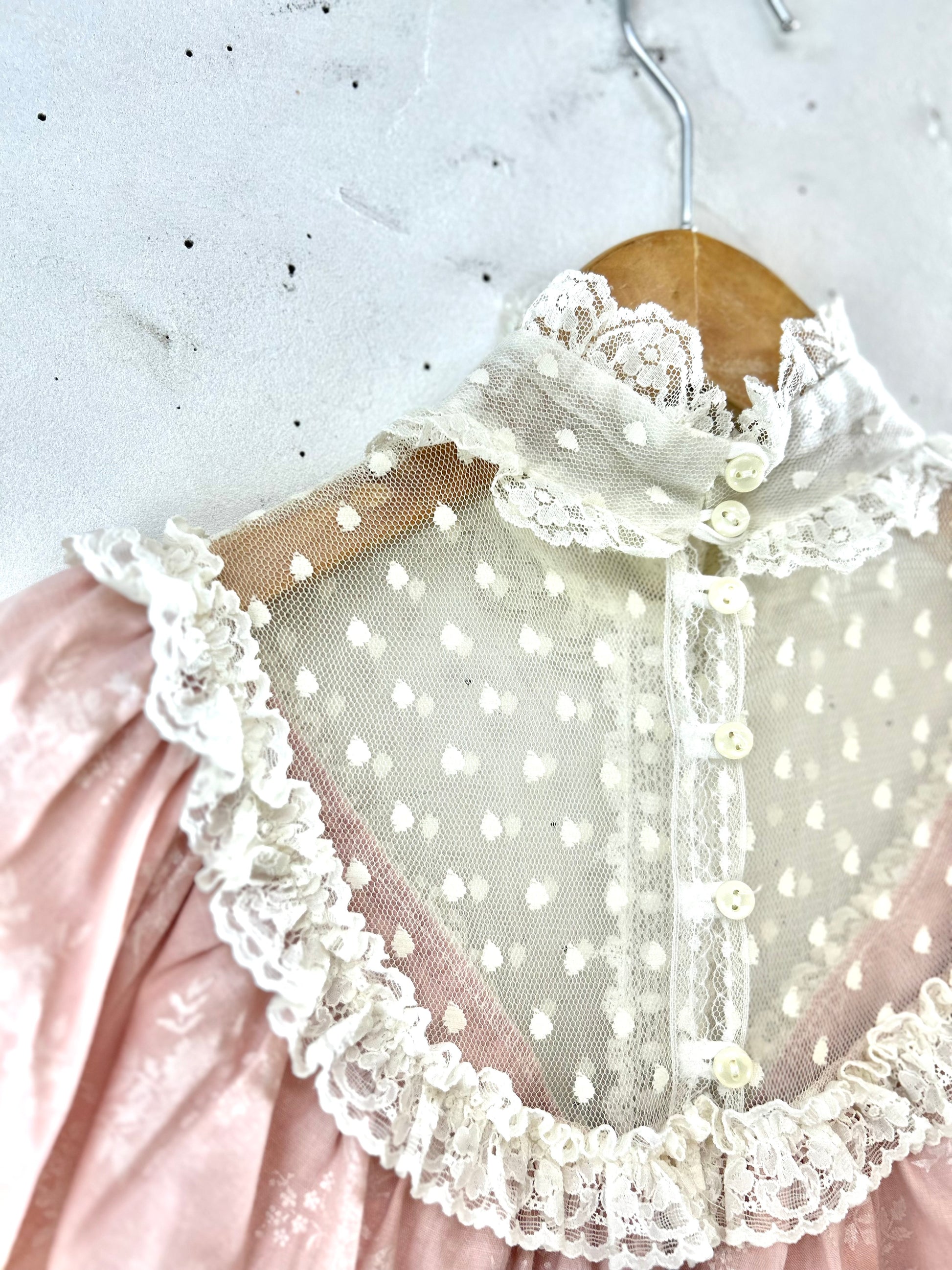 ドットのレース生地を使ったヨーク切替もたまらなく可愛く、ウエストにリボンも付いていますのでシルエットにもメリハリが効き柔らかな印象を与えてくれ、後ろ姿にも自信があります。